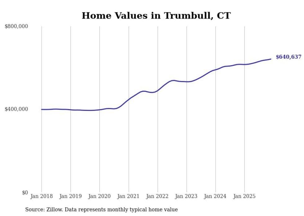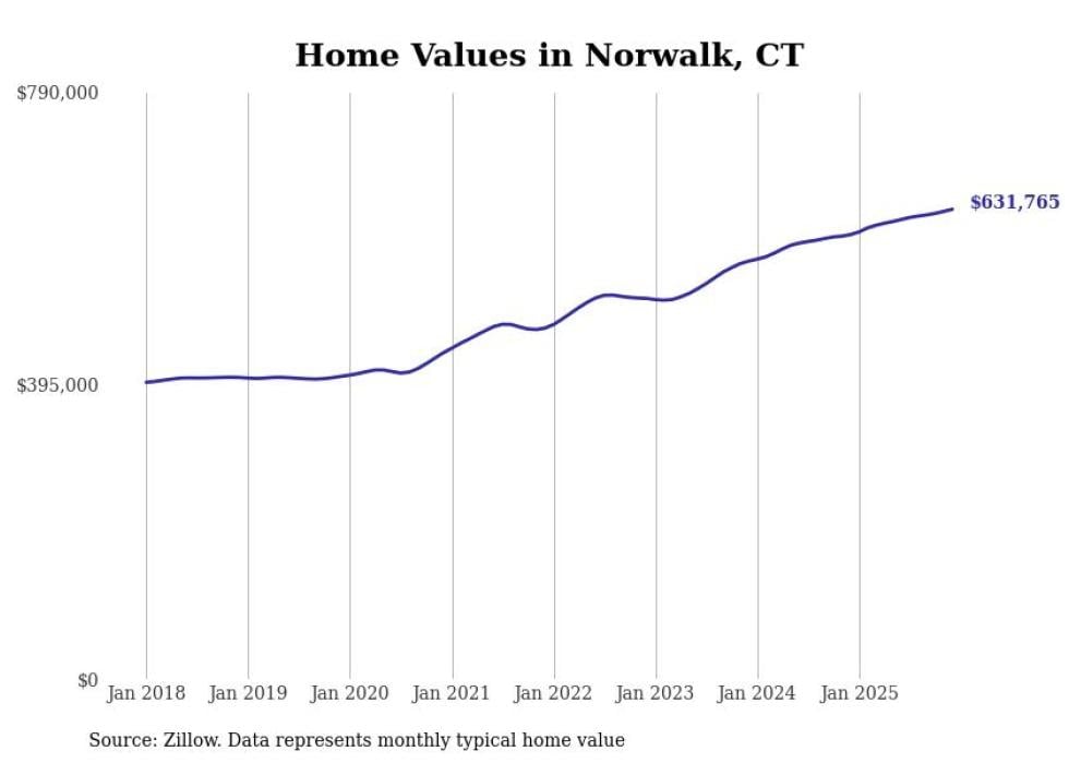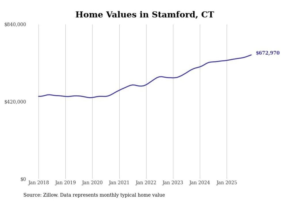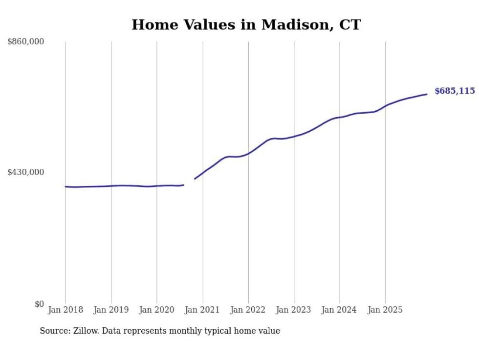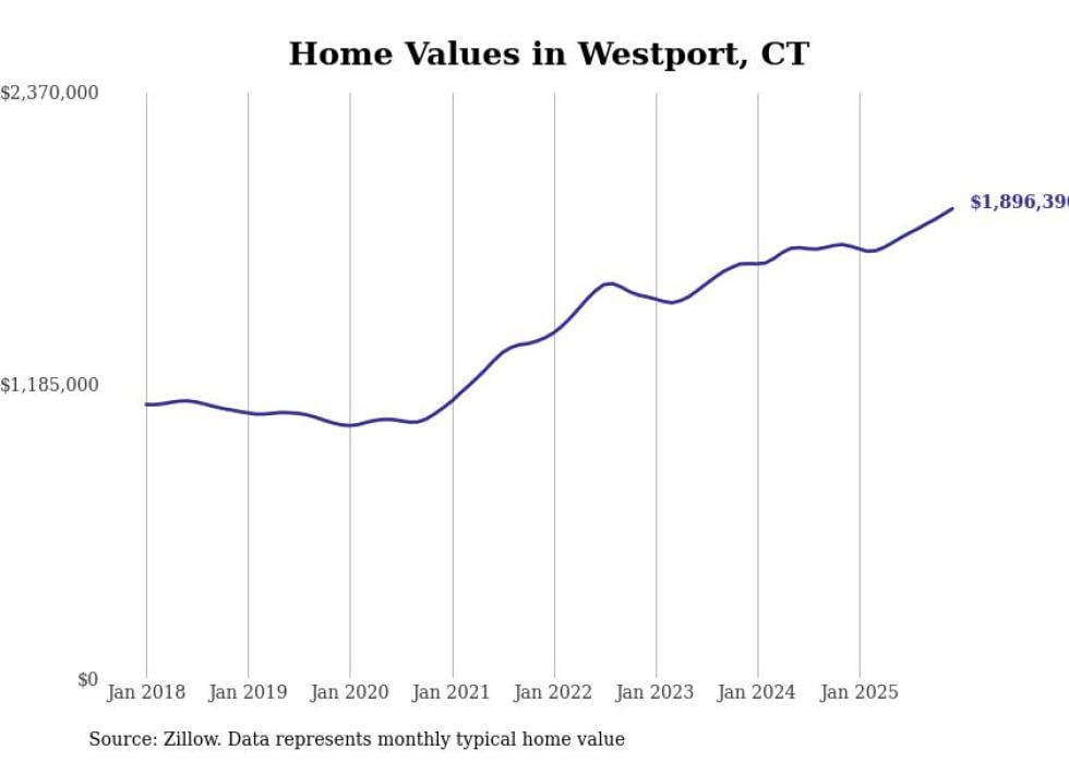Stacker compiled a list of cities with the most expensive homes in Connecticut using data from Zillow. Cities are ranked by the Zillow Home Values Index for all homes as of December 2025. The charts in this story were created automatically using Matplotlib.