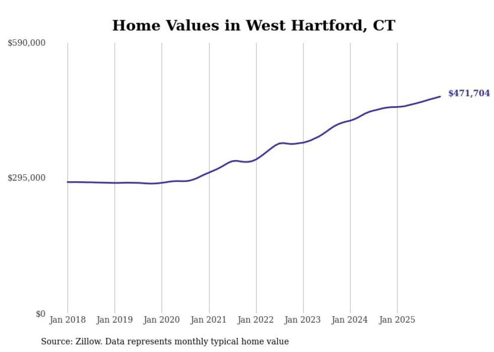 Stacker compiled a list of cities with the most expensive homes in the Hartford metro area using data from Zillow. Charts show the monthly typical home value since January 2018. Data was available for 58 cities and towns.