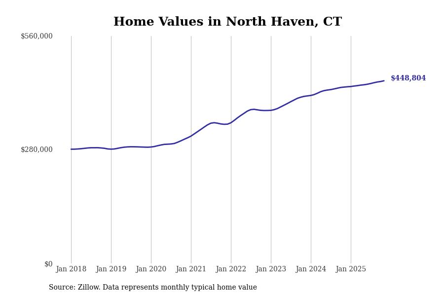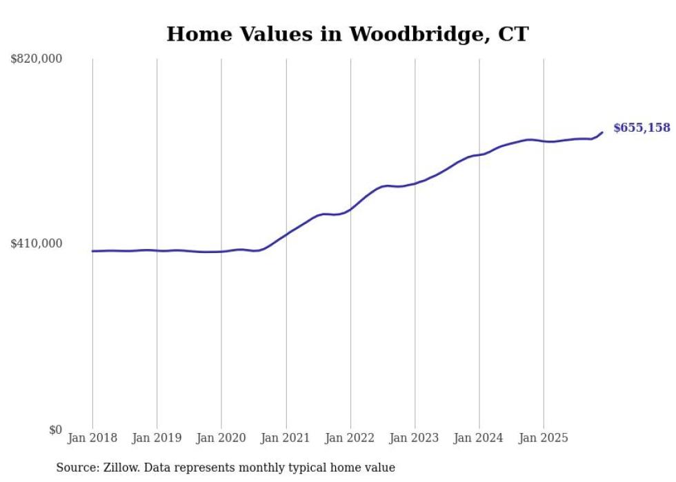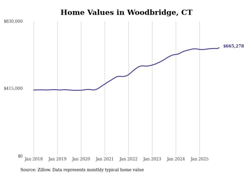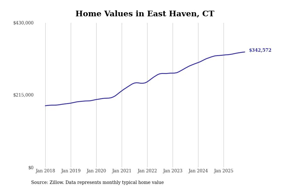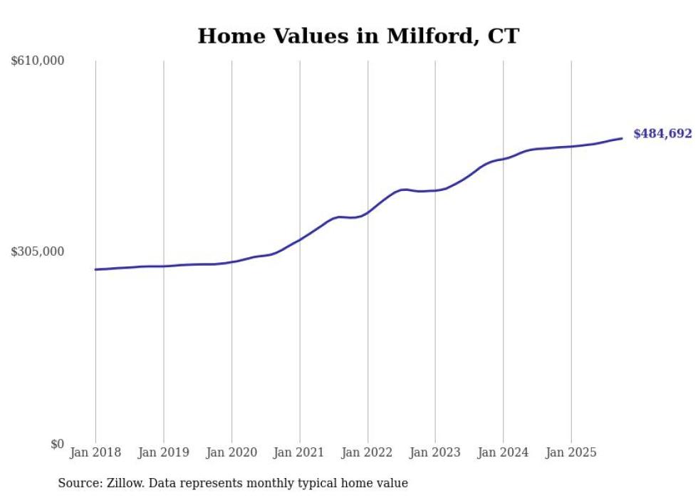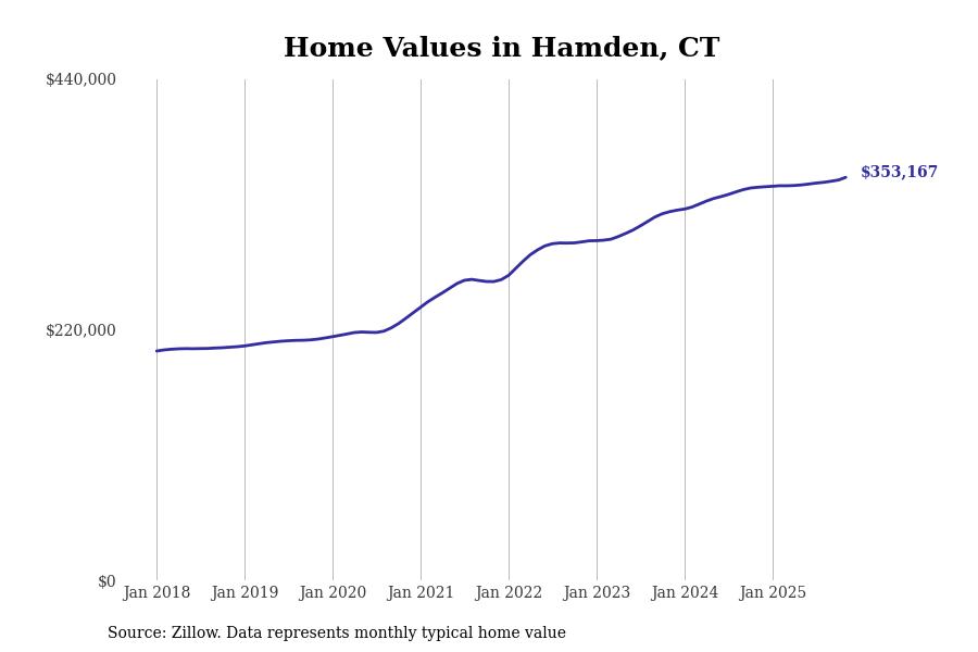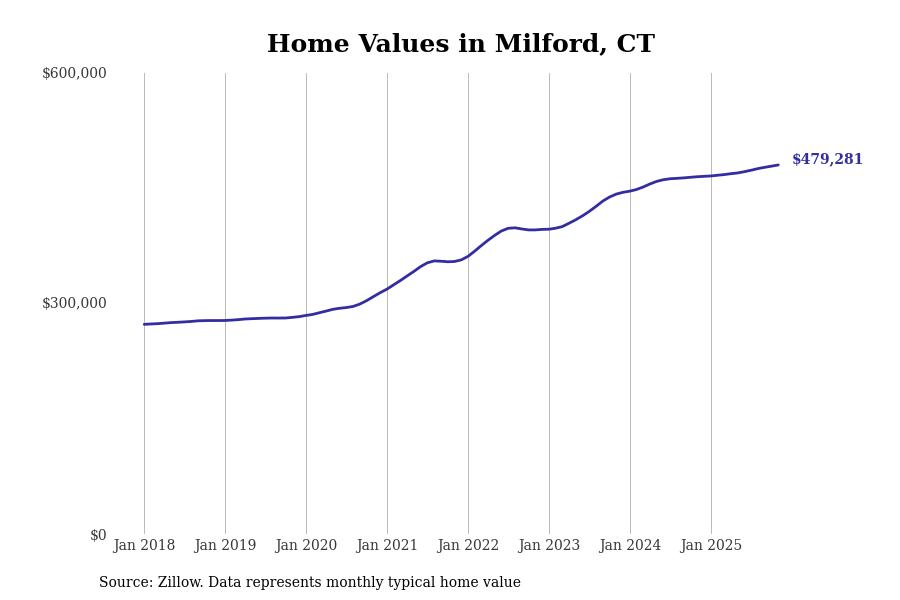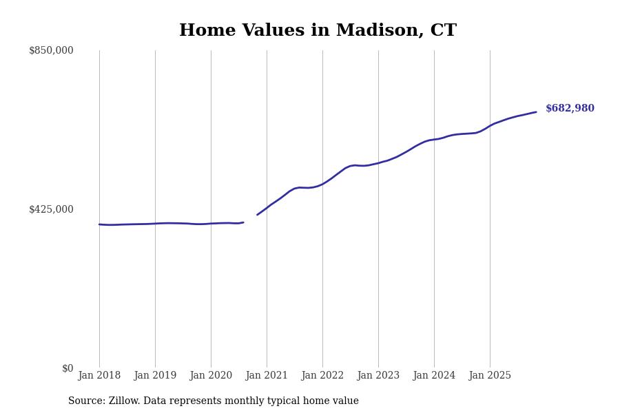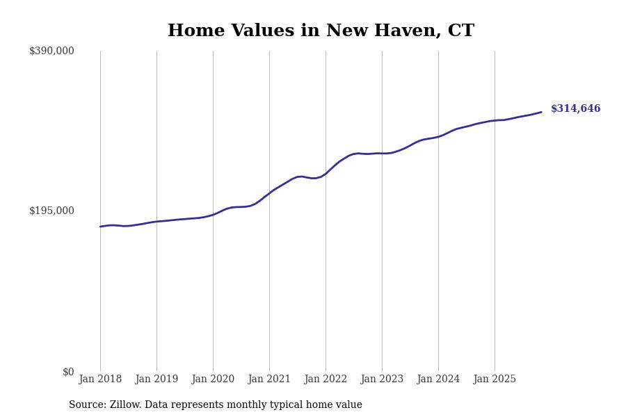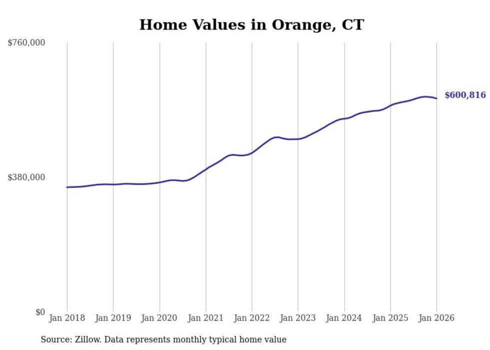 Stacker compiled a list of cities with the most expensive homes in the New Haven metro area using data from Zillow. Charts show the monthly typical home value since January 2018. All 27 cities and towns with data available were included in the list.