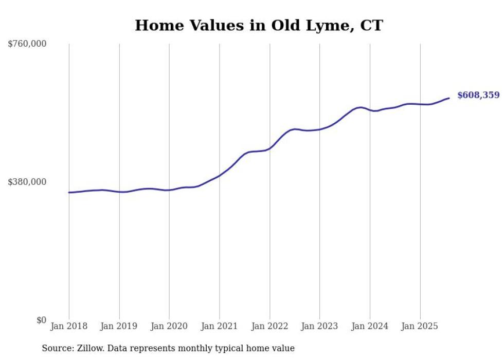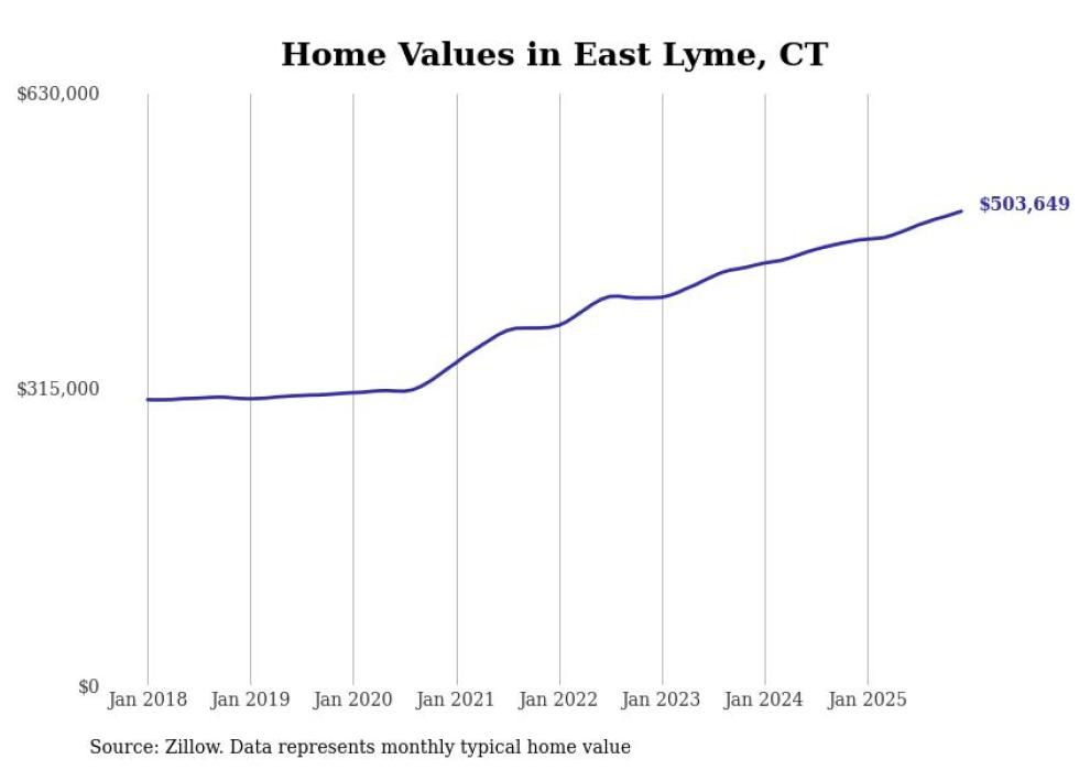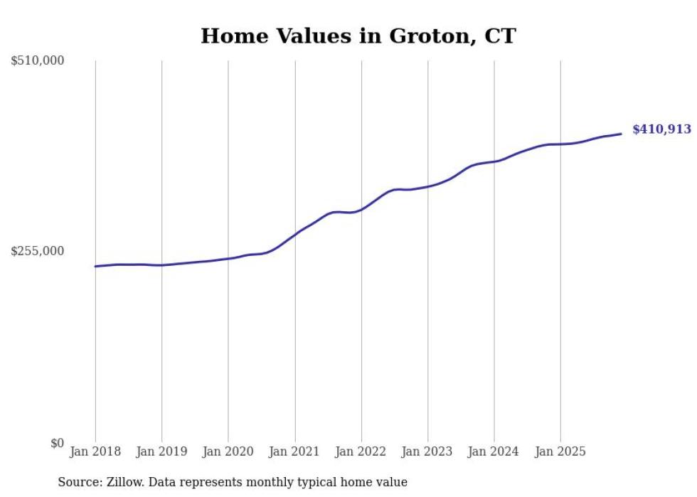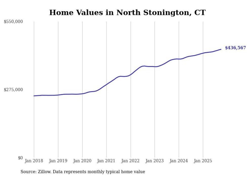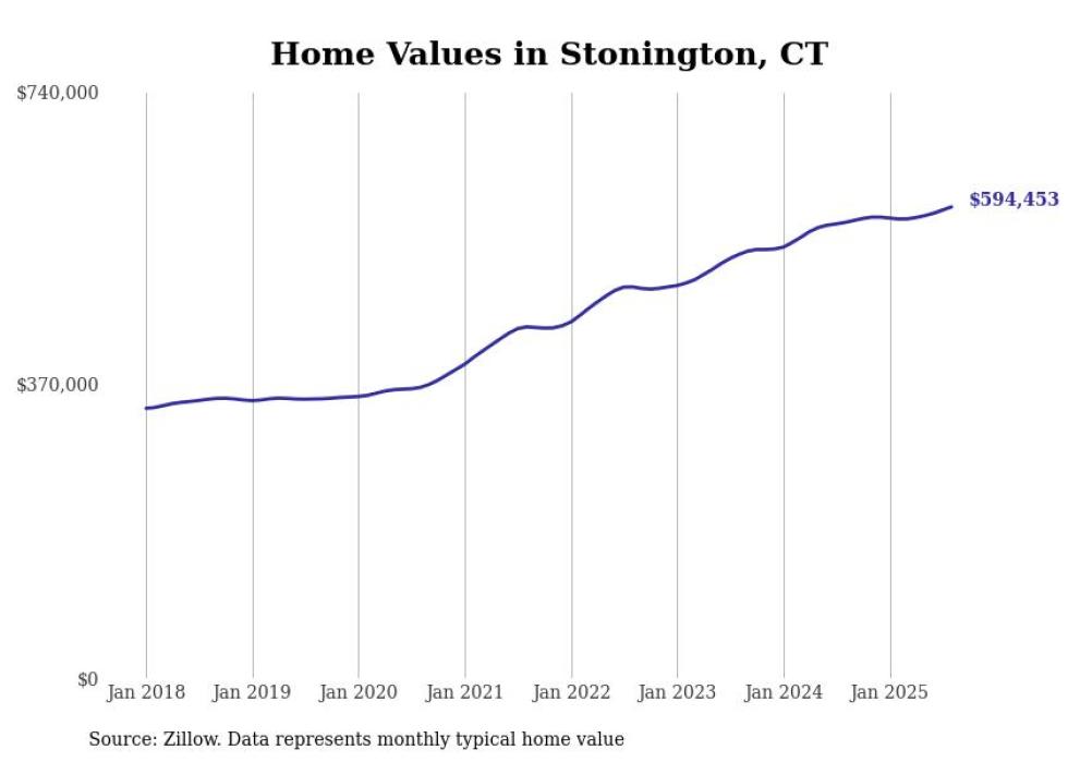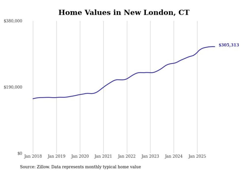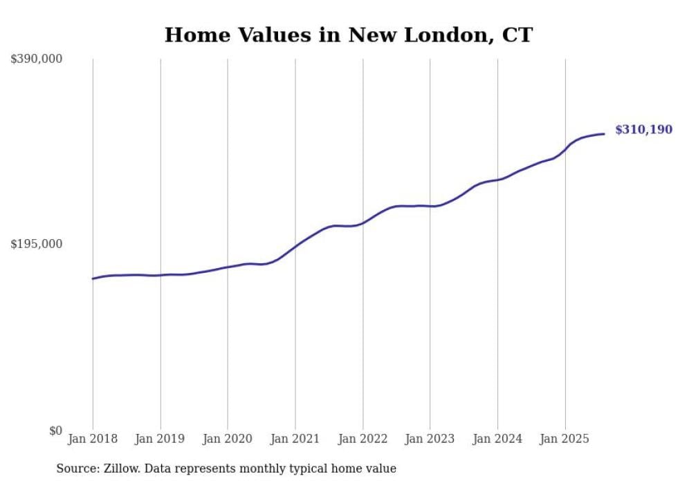 Stacker compiled a list of cities with the most expensive homes in the Norwich-New London, CT metro area using data from Zillow. Charts show the monthly typical home value since January 2018.