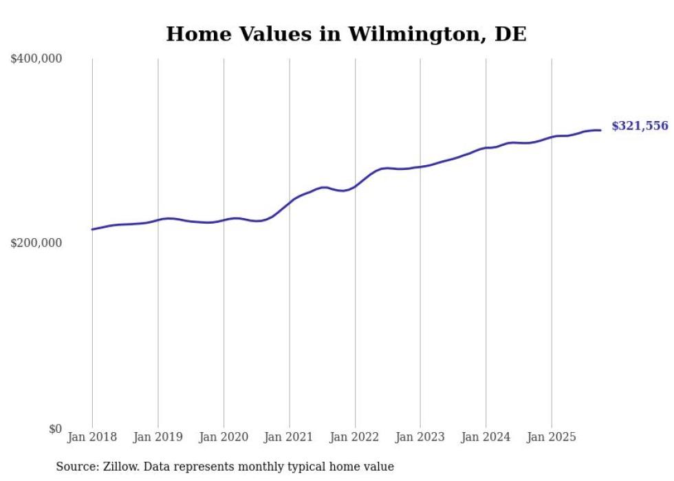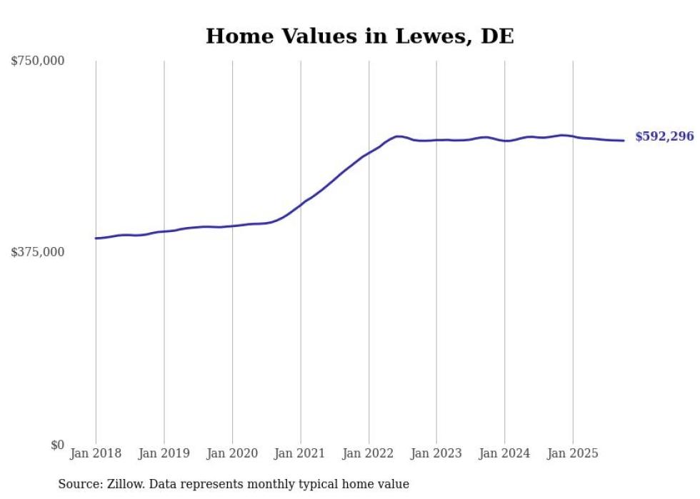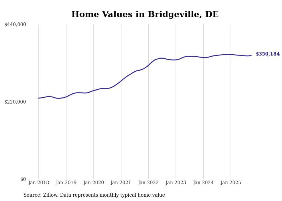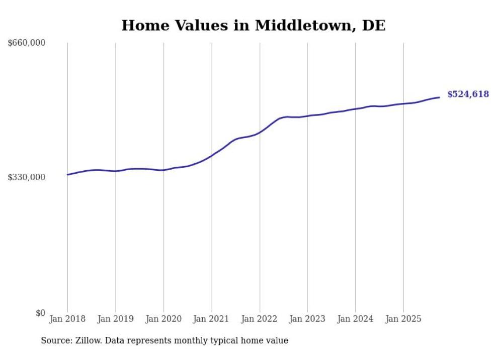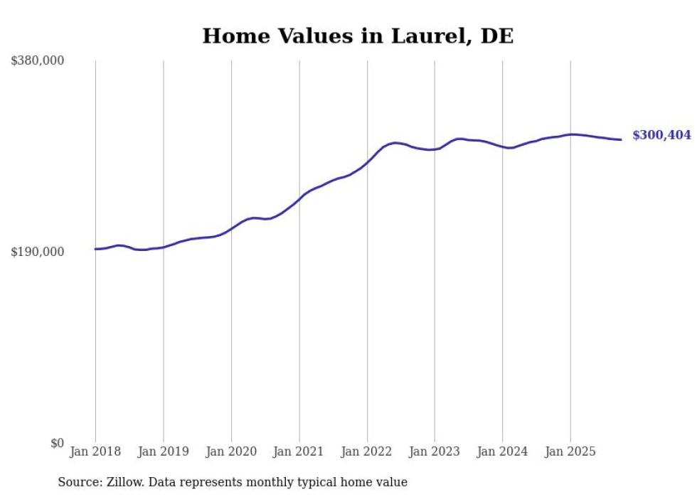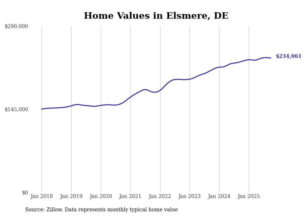 Stacker compiled a list of cities with the fastest-growing home prices in Delaware using data from Zillow. Cities are ranked by the dollar change in the Zillow Home Values Index for all homes from the 12 months ending October 2025. The charts in this story were created automatically using Matplotlib. Data was available for 50 cities and towns in Delaware.