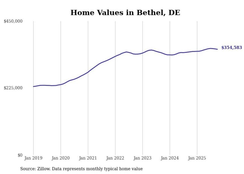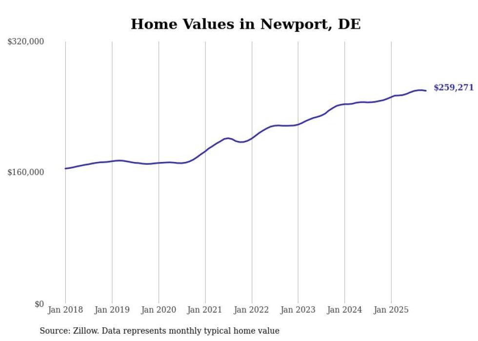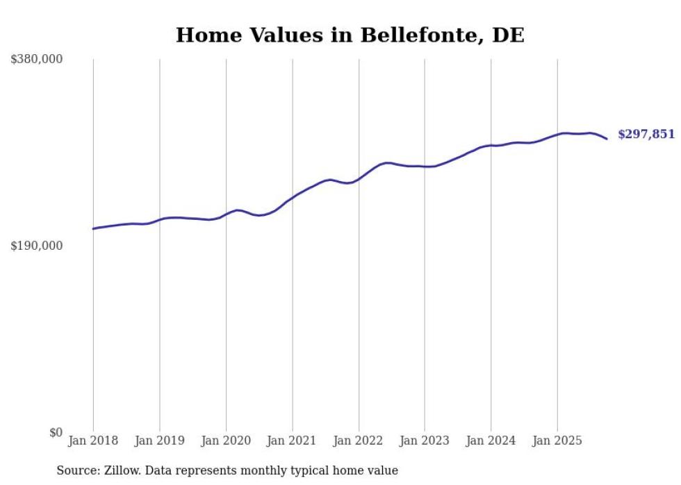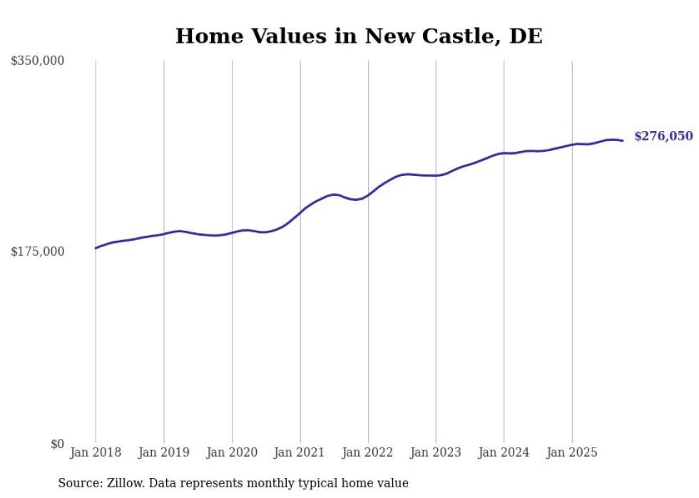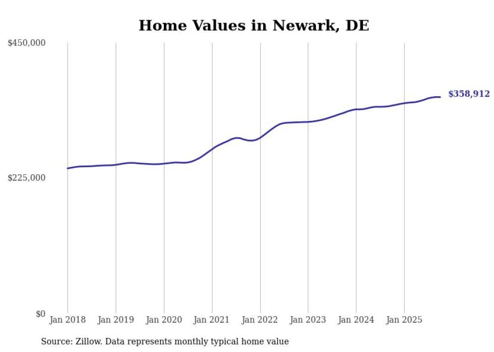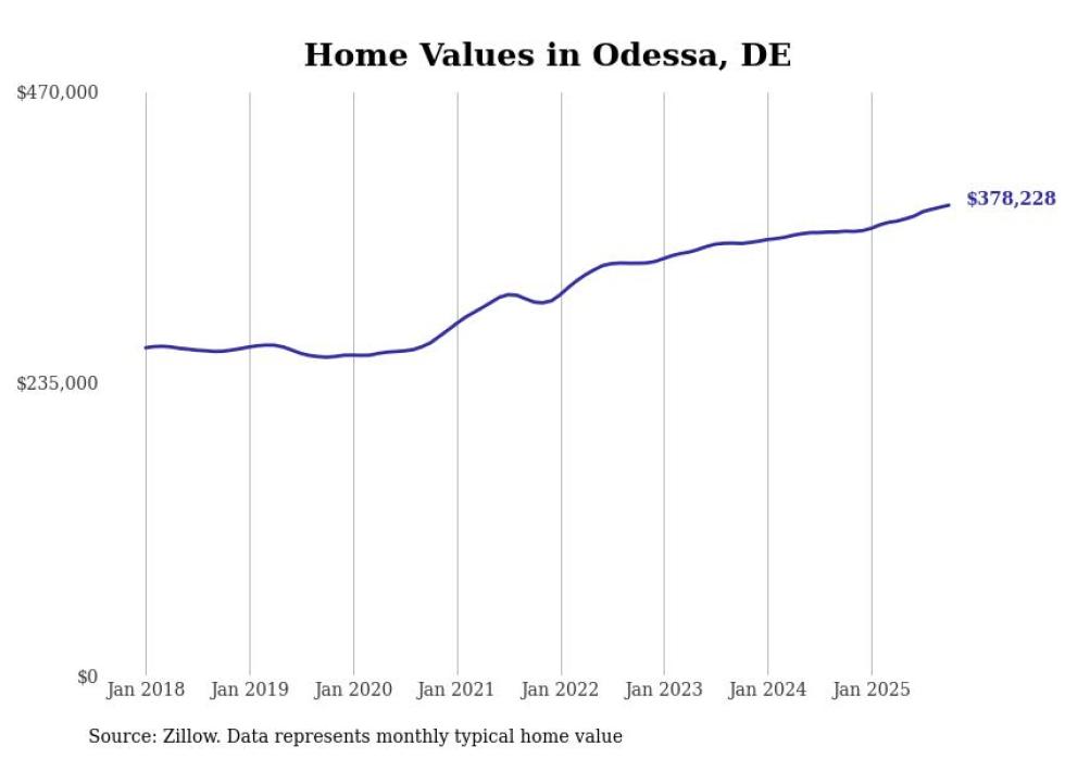 Stacker compiled a list of cities with the fastest-growing home prices in Delaware using data from Zillow. Cities are ranked by the dollar change in the Zillow Home Values Index for all homes from the 12 months ending October 2025. The charts in this story were created automatically using Matplotlib. Data was available for 50 cities and towns in Delaware.
