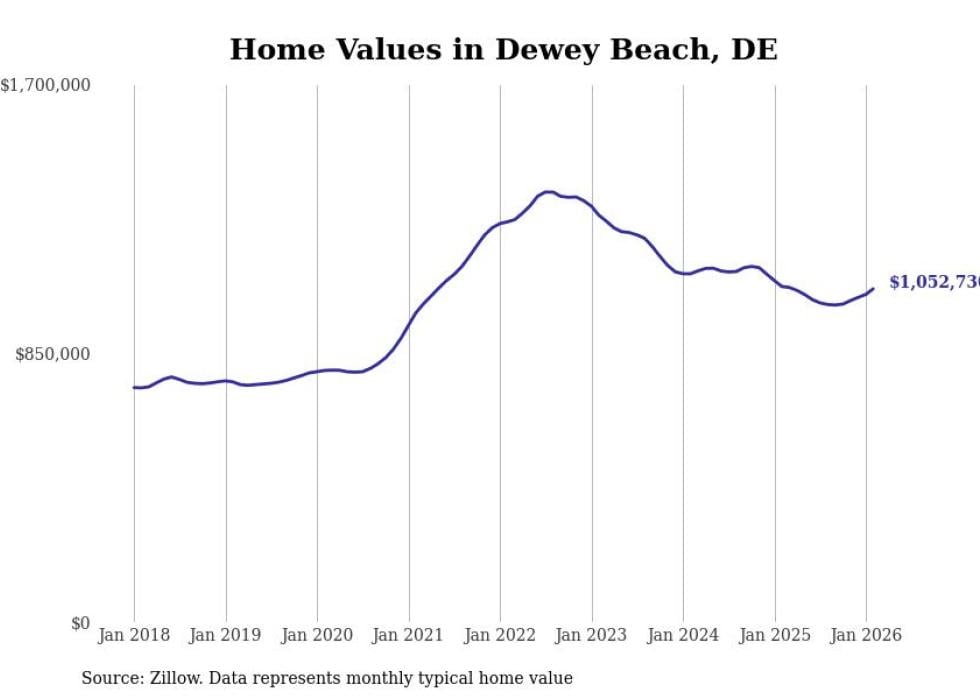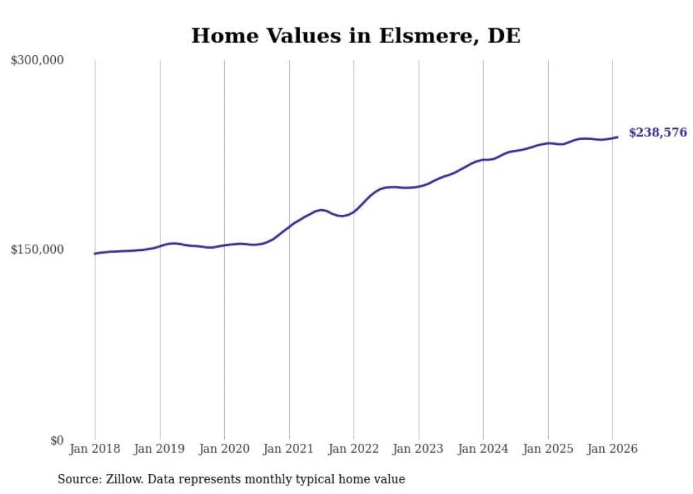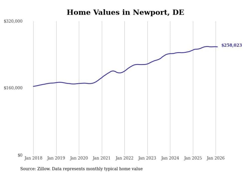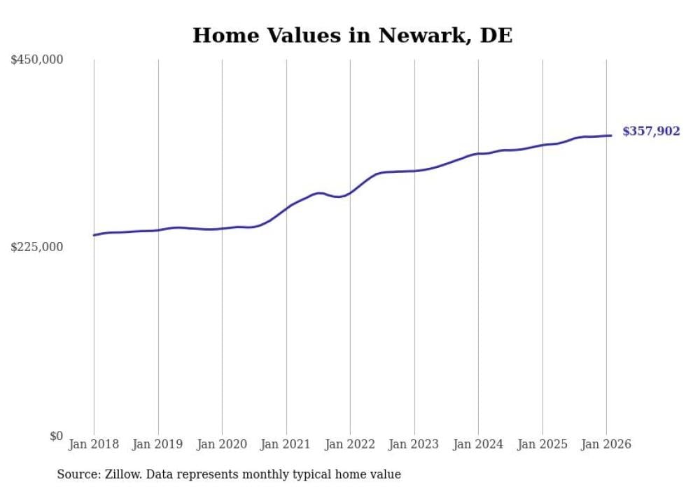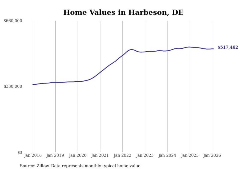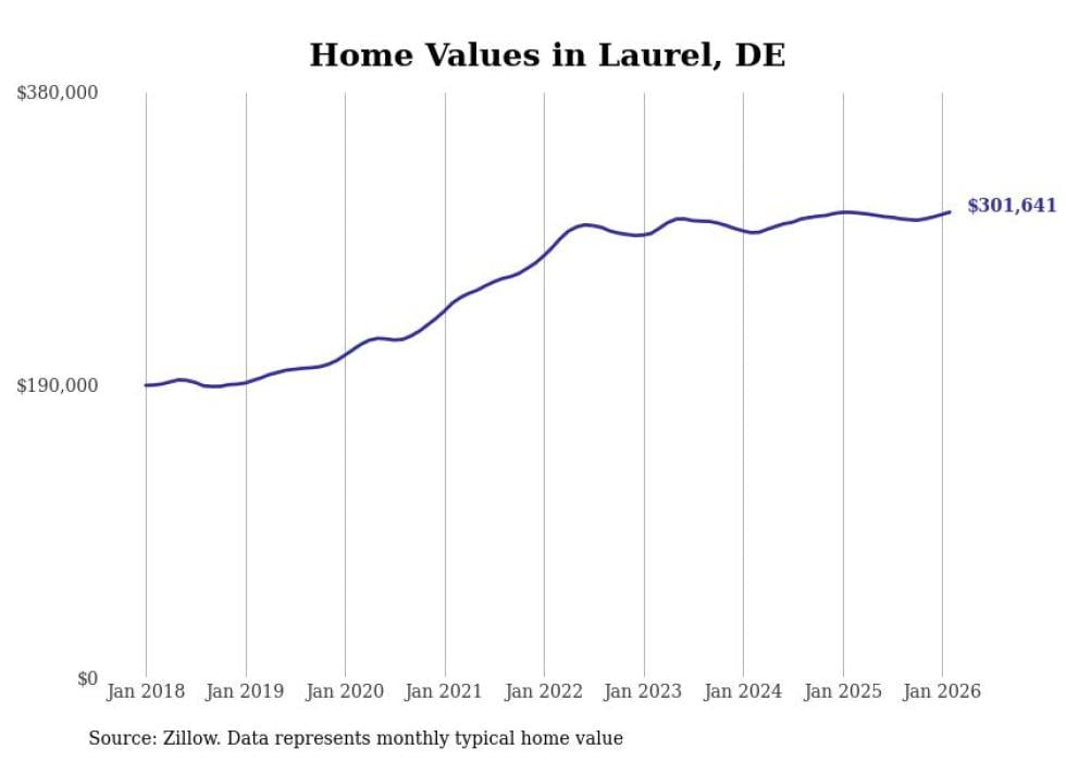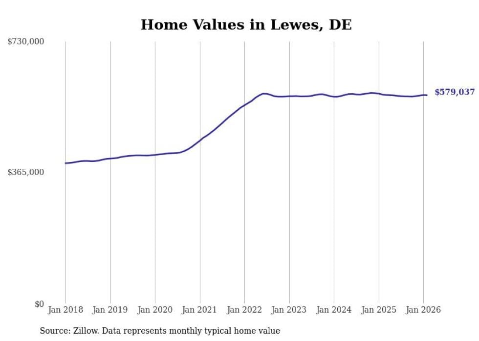 Stacker compiled a list of cities with the fastest-growing home prices in Delaware using data from Zillow. Cities are ranked by the dollar change in the Zillow Home Values Index for all homes from the 12 months ending February 2026. The charts in this story were created automatically using Matplotlib. Data was available for 50 cities and towns in Delaware.