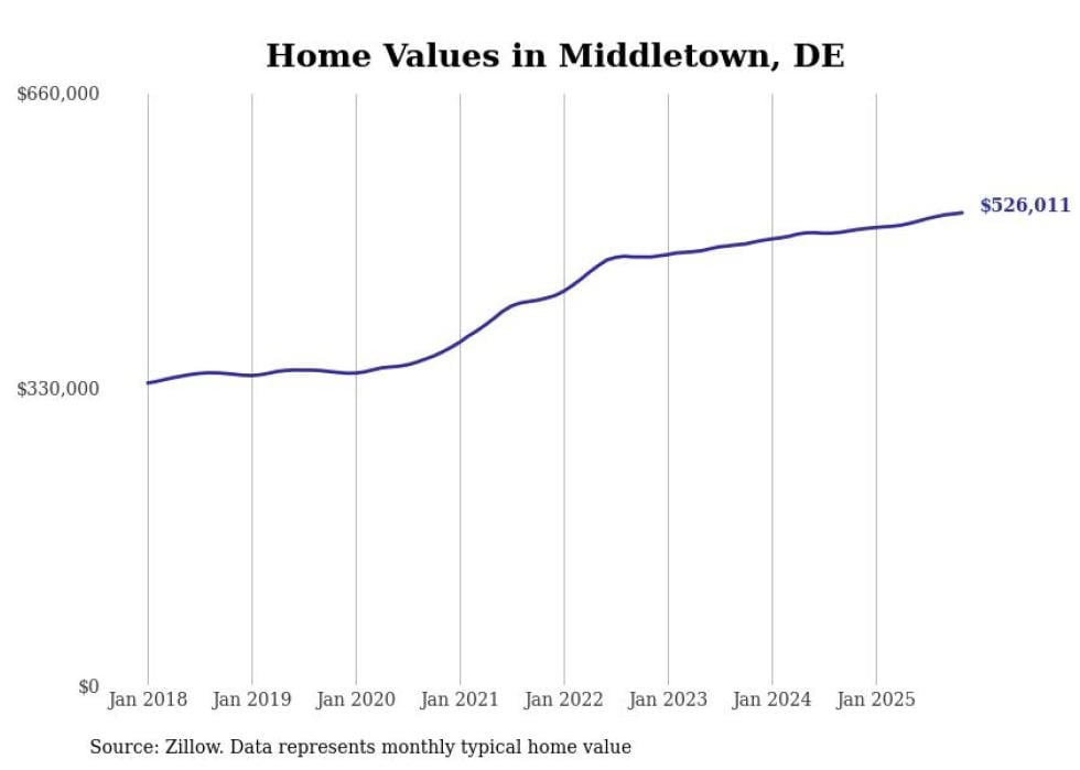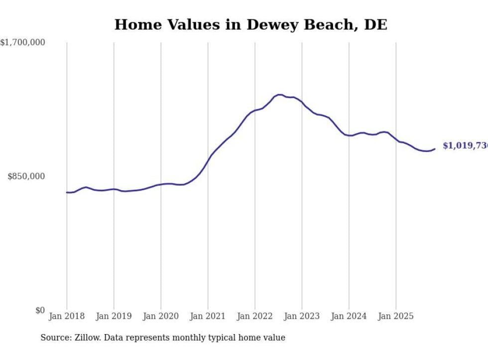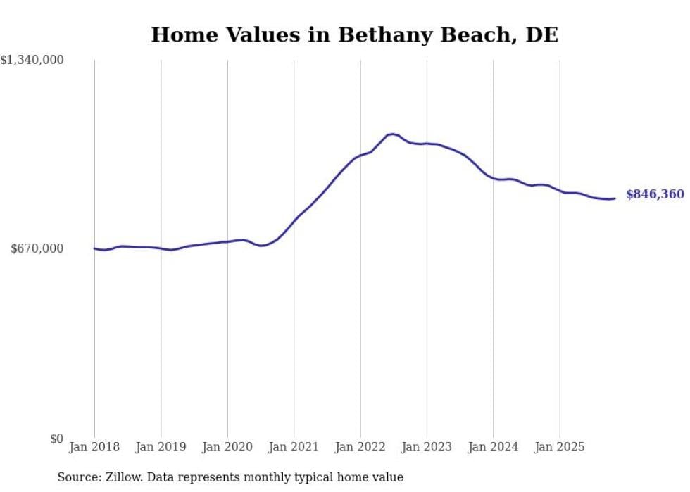 Stacker compiled a list of cities with the most expensive homes in Delaware using data from Zillow. Cities are ranked by the Zillow Home Values Index for all homes as of November 2025. The charts in this story were created automatically using Matplotlib.