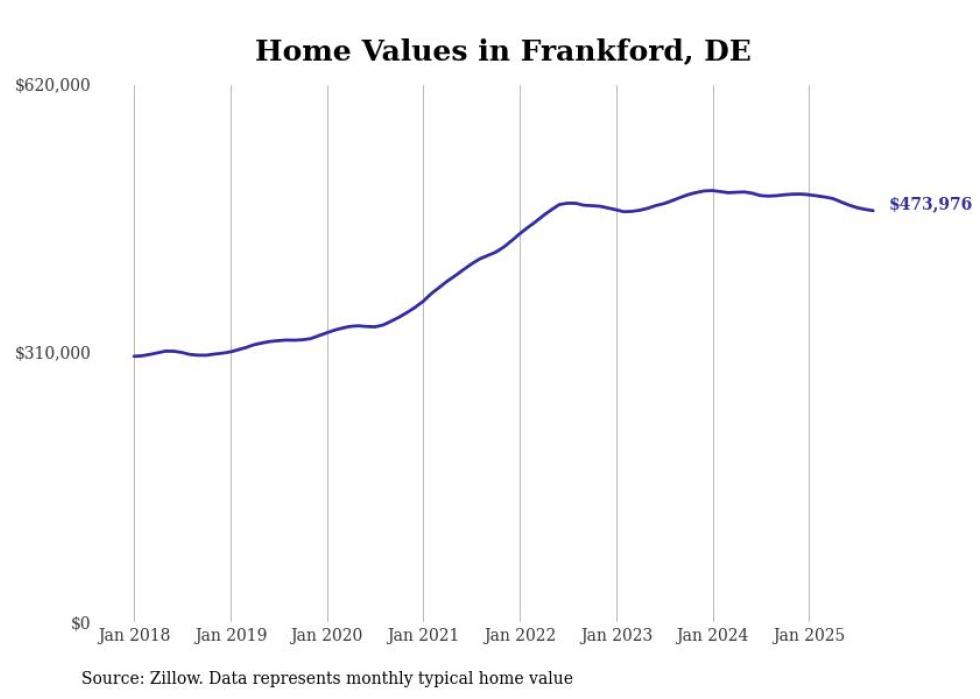 Stacker compiled a list of cities with the most expensive homes in Delaware using data from Zillow. Cities are ranked by the Zillow Home Values Index for all homes as of September 2025. The charts in this story were created automatically using Matplotlib.