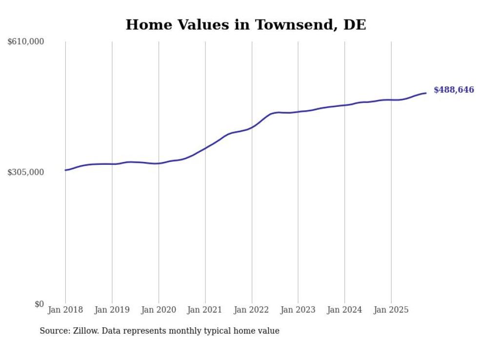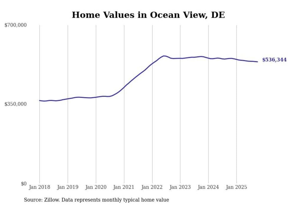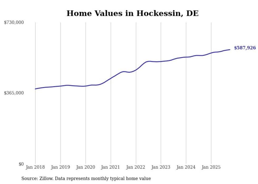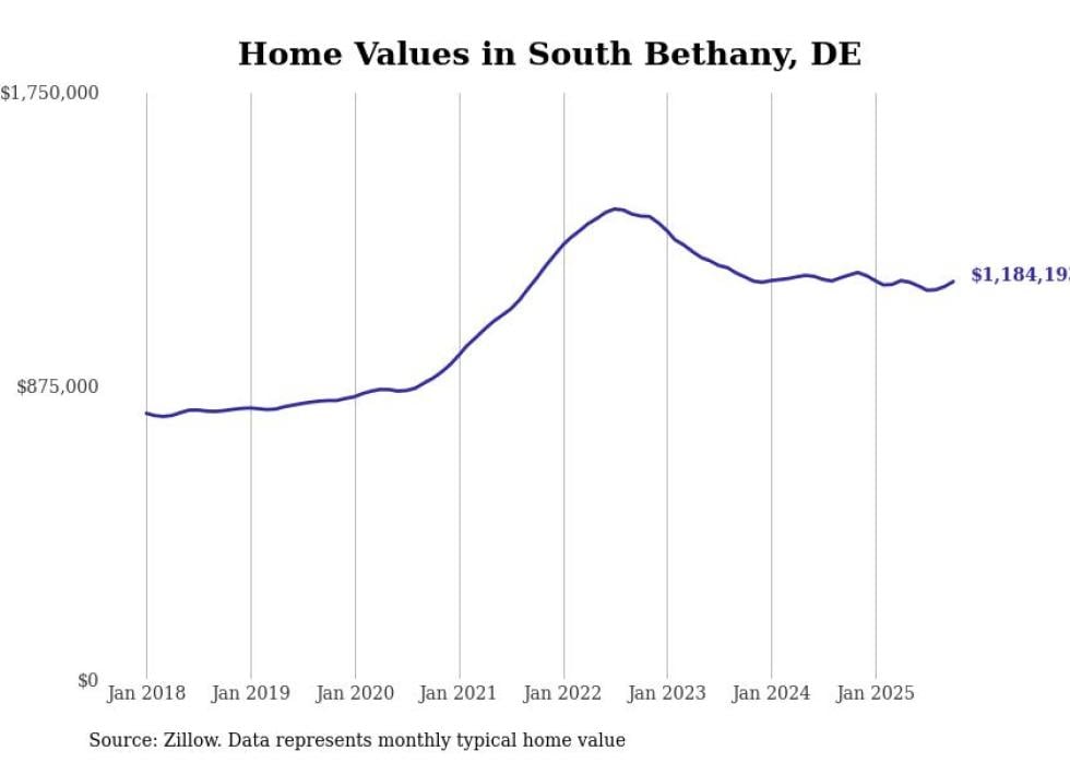Stacker compiled a list of cities with the most expensive homes in Delaware using data from Zillow. Cities are ranked by the Zillow Home Values Index for all homes as of October 2025. The charts in this story were created automatically using Matplotlib.