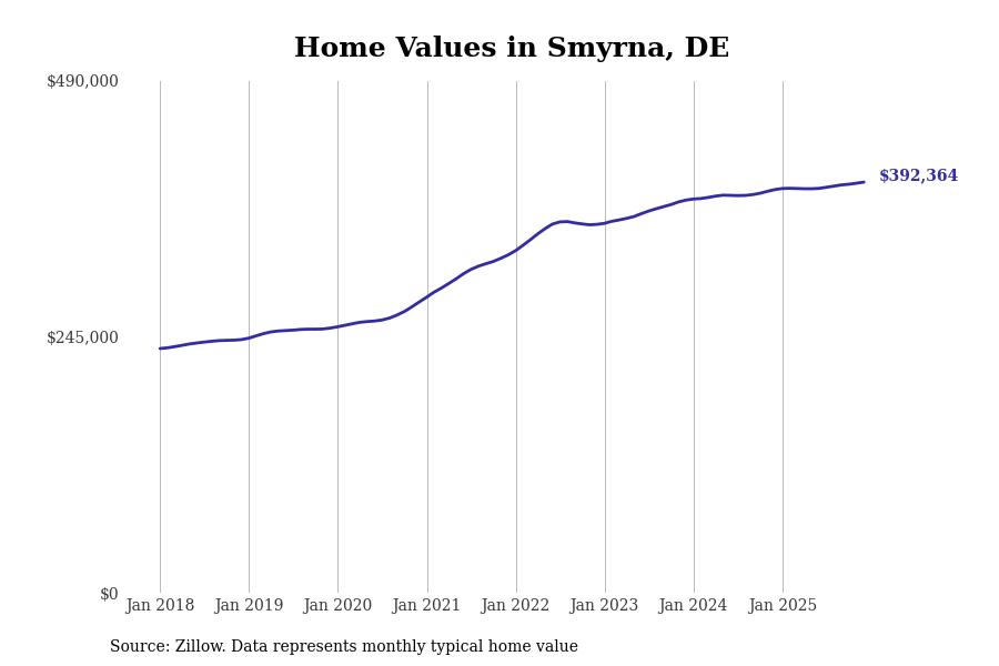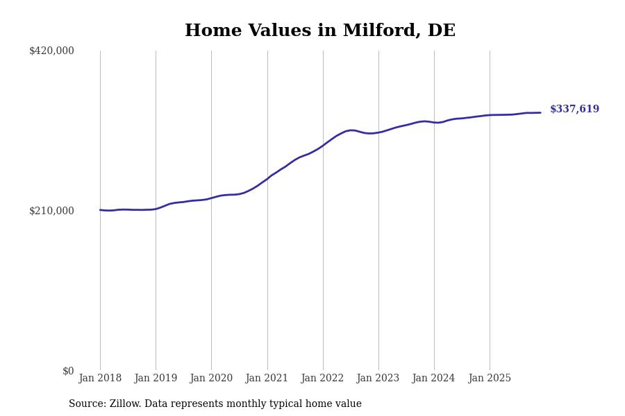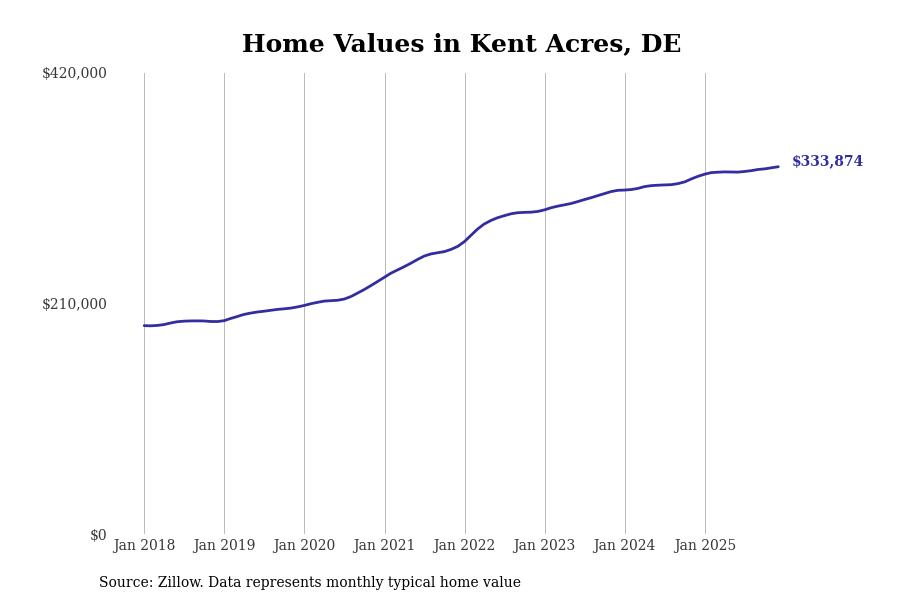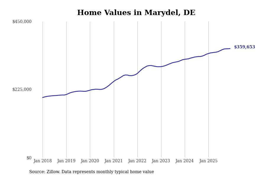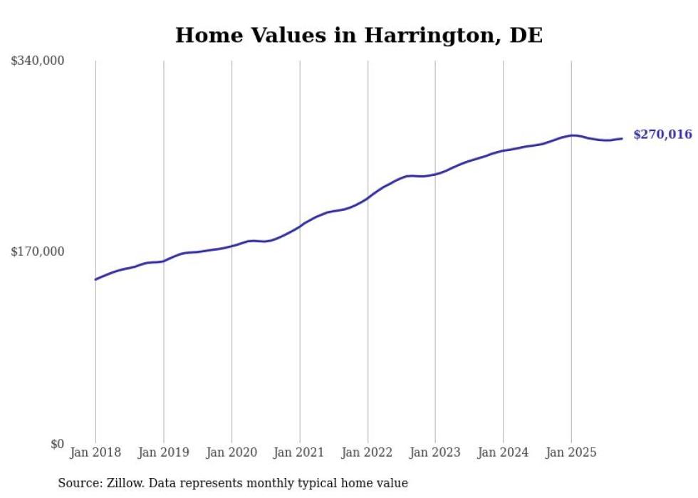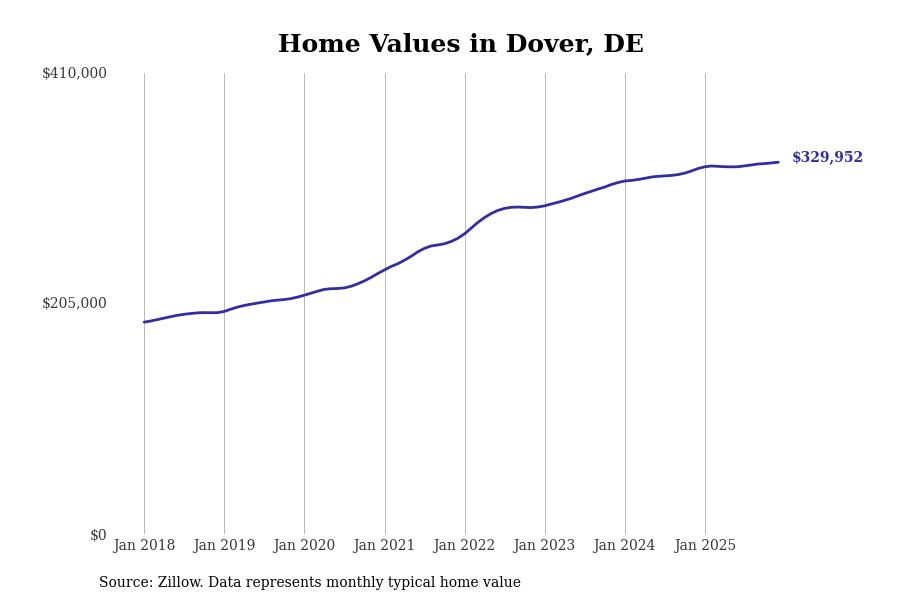 Stacker compiled a list of cities with the most expensive homes in the Dover metro area using data from Zillow. Charts show the monthly typical home value since January 2018. All 17 cities and towns with data available were included in the list.