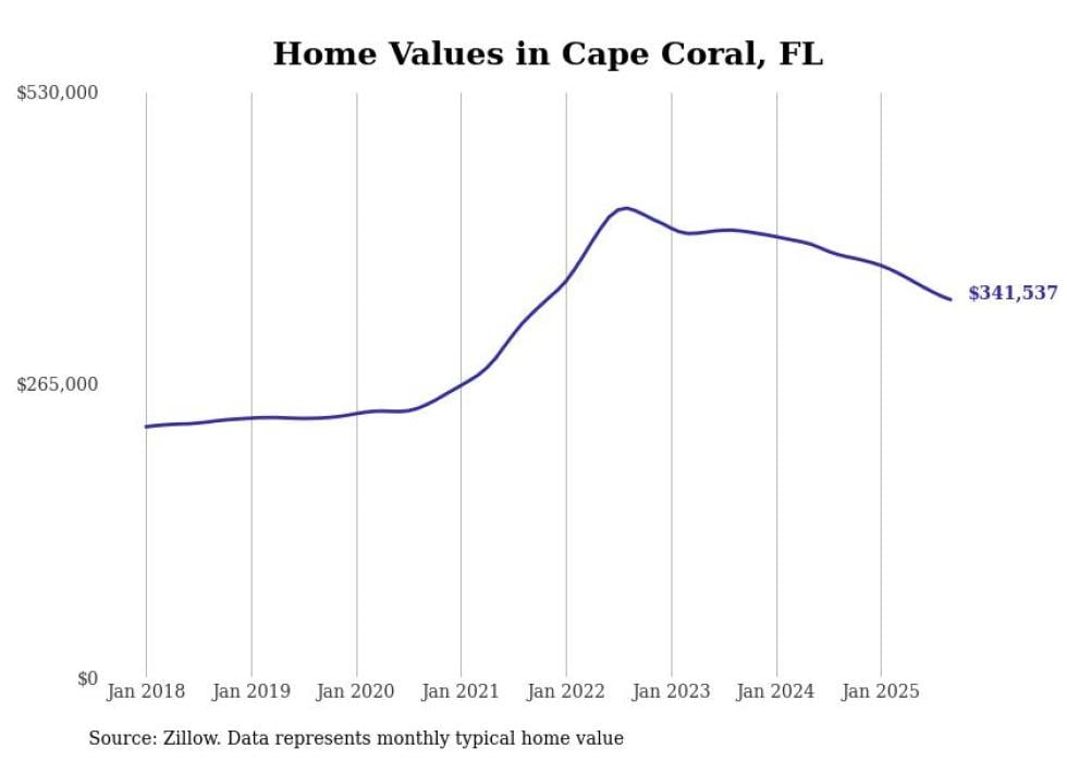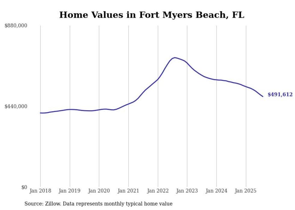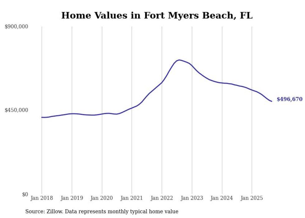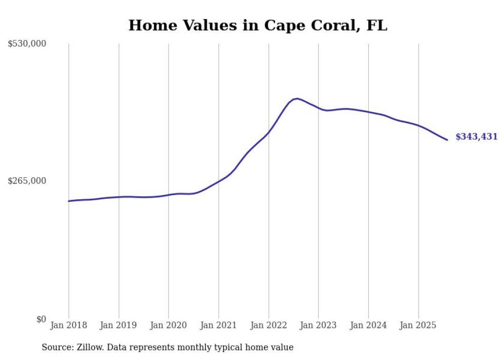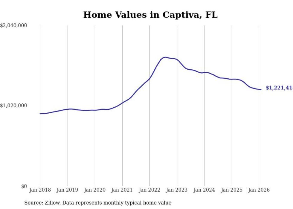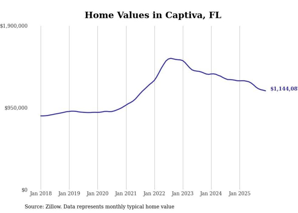 Stacker compiled a list of cities with the most expensive homes in the Cape Coral metro area using data from Zillow. Charts show the monthly typical home value since January 2018. All 14 cities and towns with data available were included in the list.
