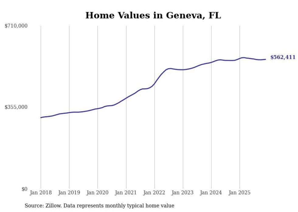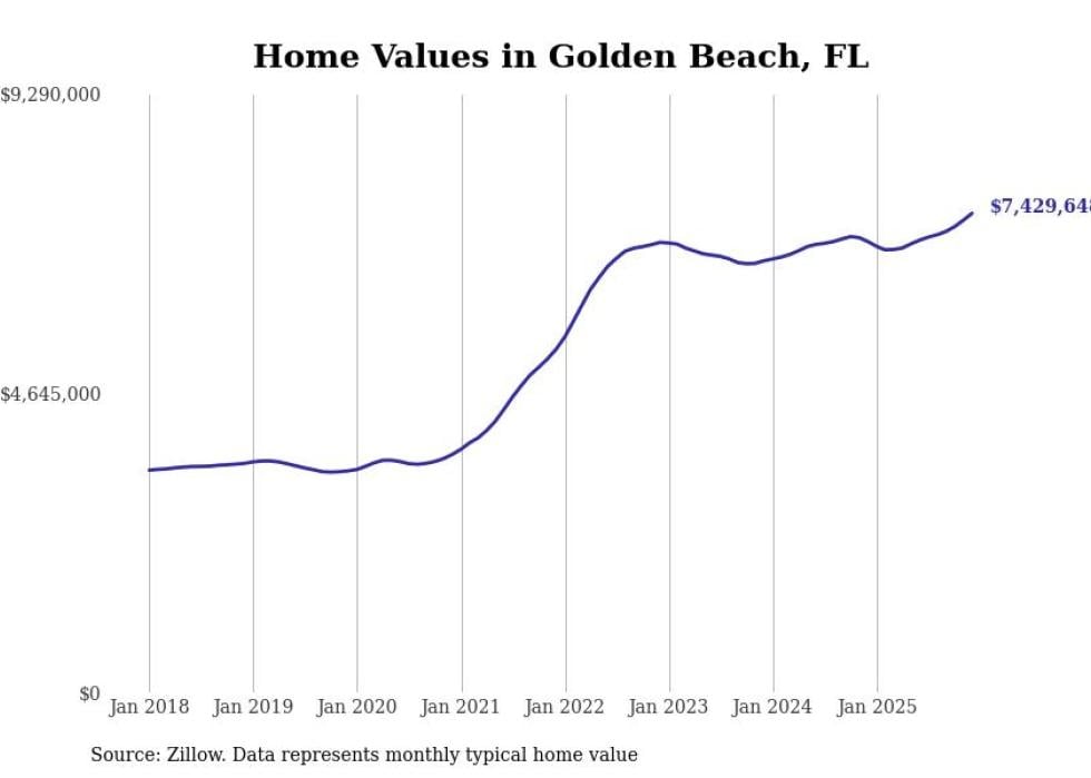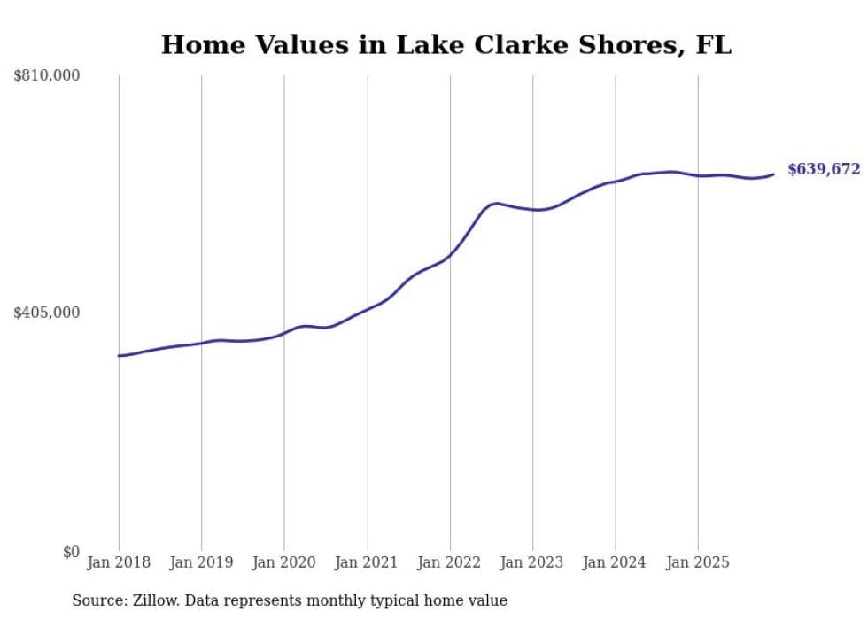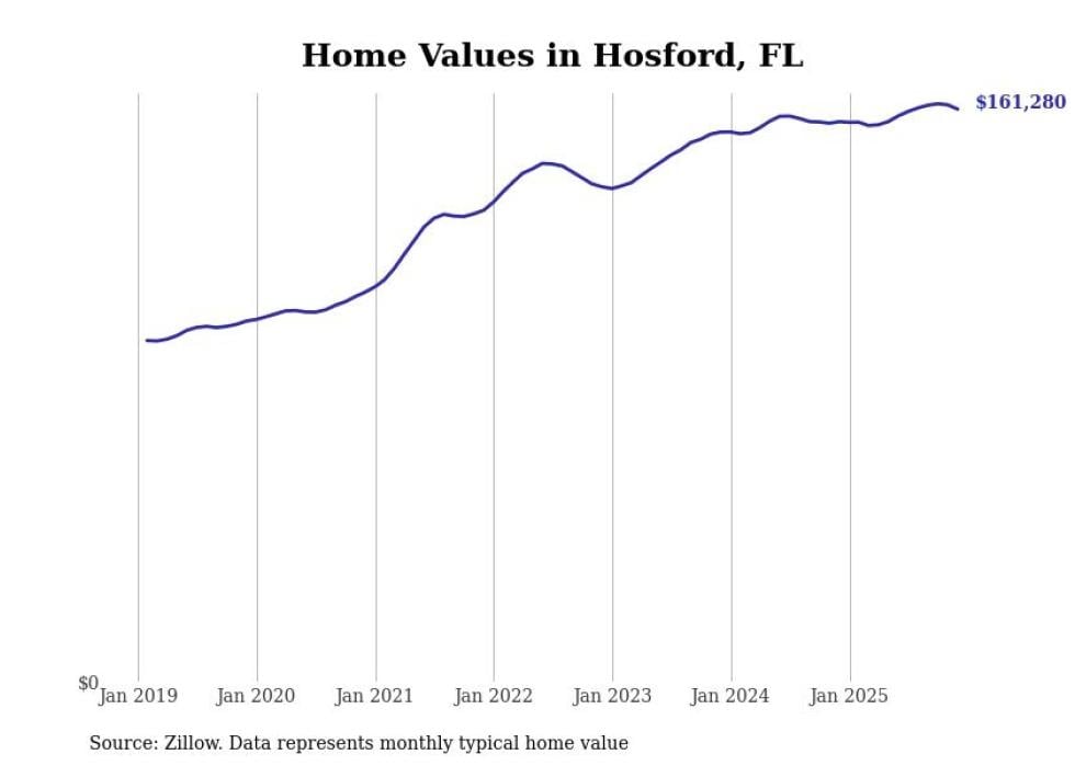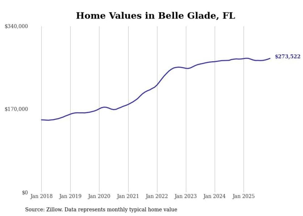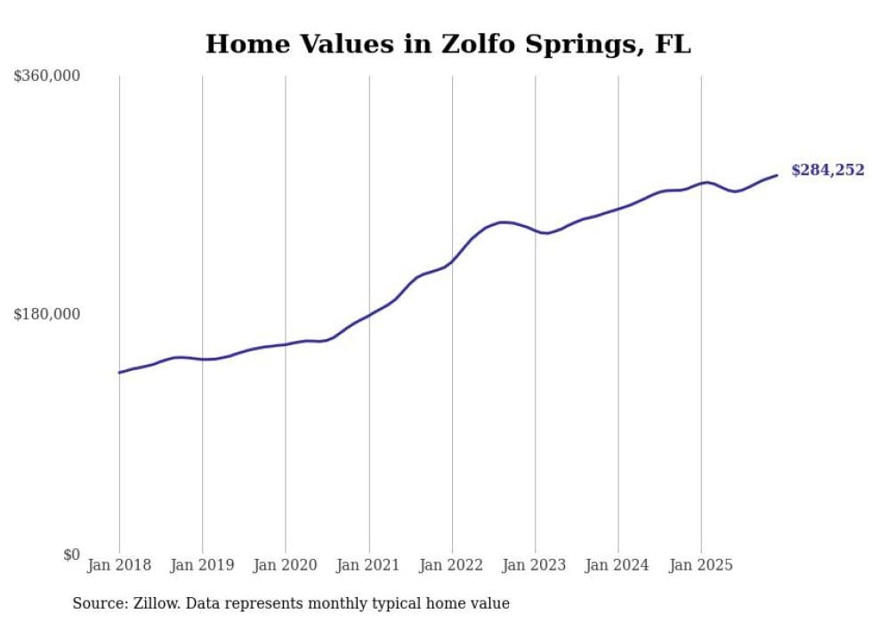 Stacker compiled a list of cities with the fastest-growing home prices in Florida using data from Zillow. Cities are ranked by the dollar change in the Zillow Home Values Index for all homes from the 12 months ending December 2025. The charts in this story were created automatically using Matplotlib. Data was available for 50 cities and towns in Florida.