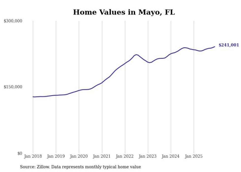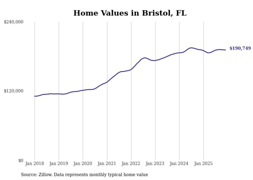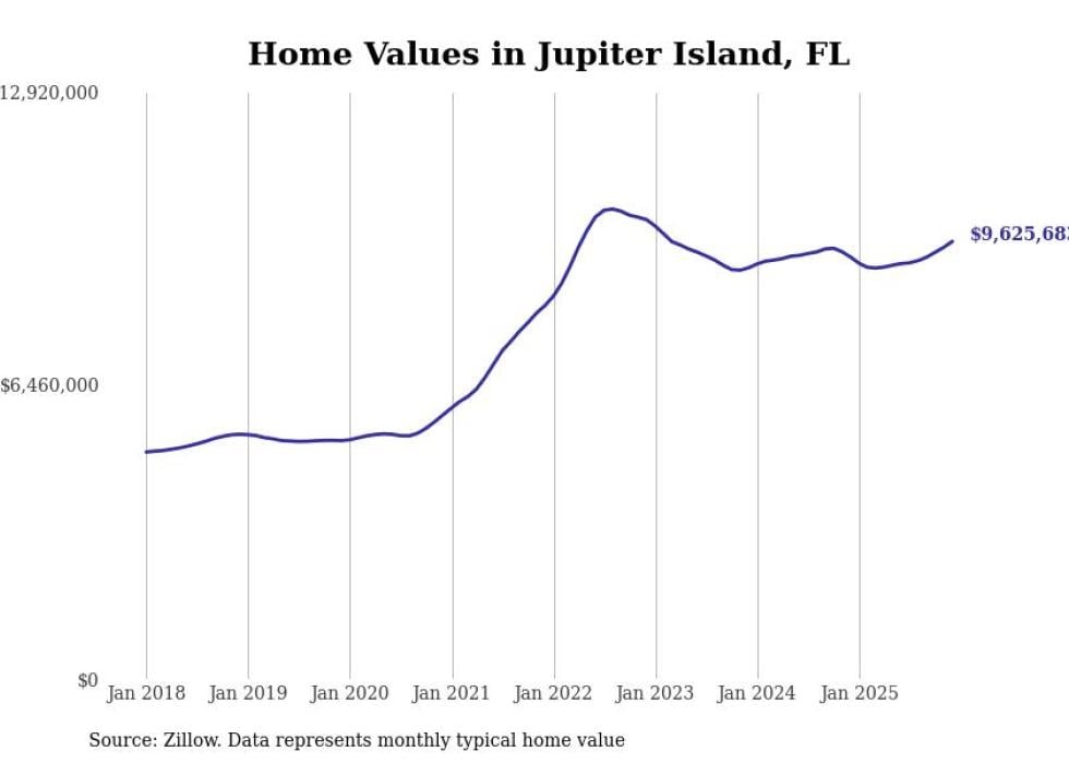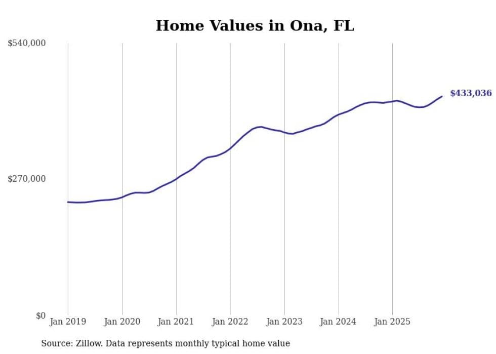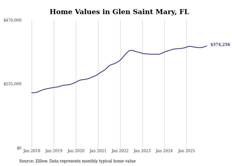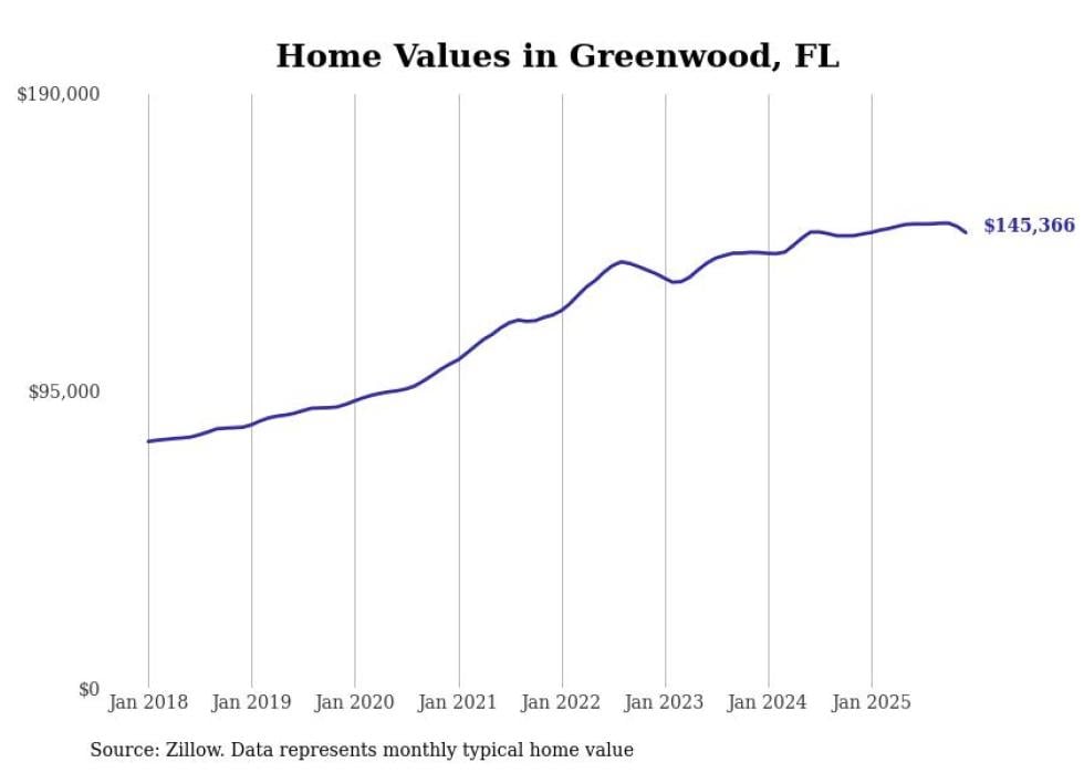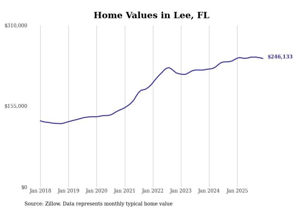 Stacker compiled a list of cities with the fastest-growing home prices in Florida using data from Zillow. Cities are ranked by the dollar change in the Zillow Home Values Index for all homes from the 12 months ending December 2025. The charts in this story were created automatically using Matplotlib. Data was available for 50 cities and towns in Florida.