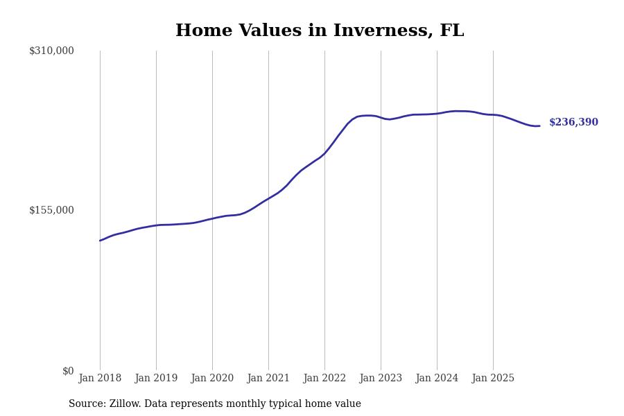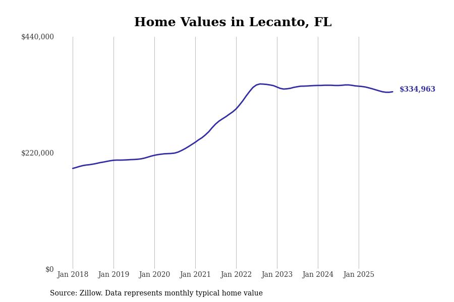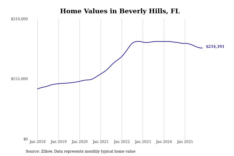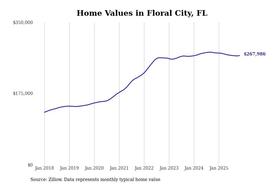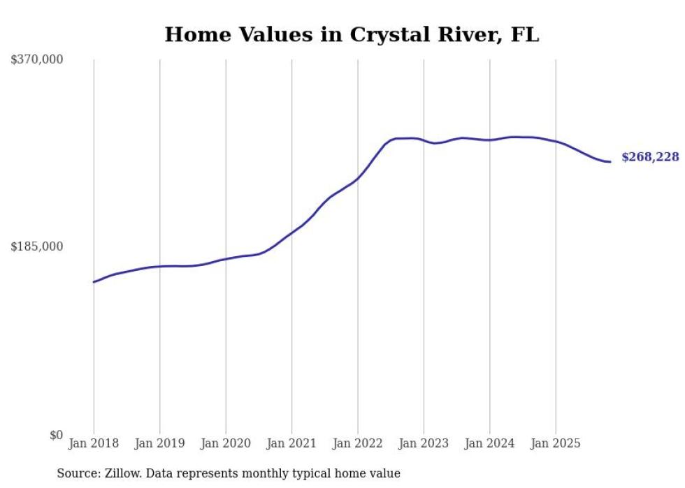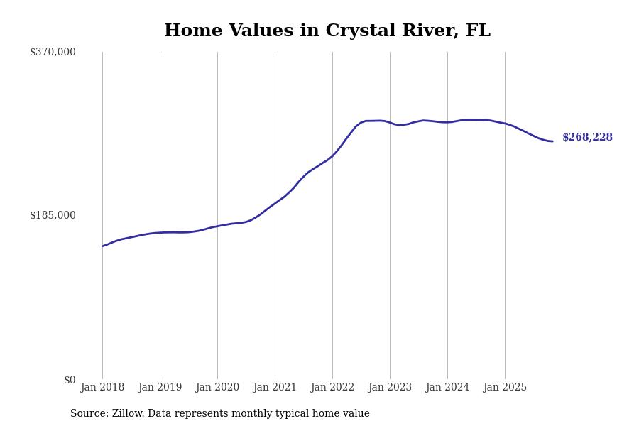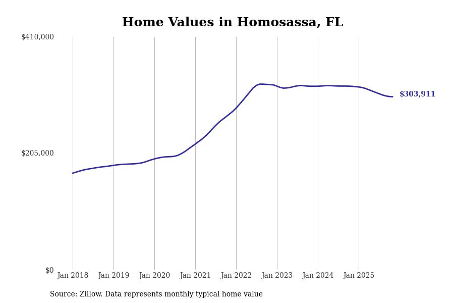 Stacker compiled a list of cities with the most expensive homes in the Homosassa Springs metro area using data from Zillow. Charts show the monthly typical home value since January 2018. All 7 cities and towns with data available were included in the list.
