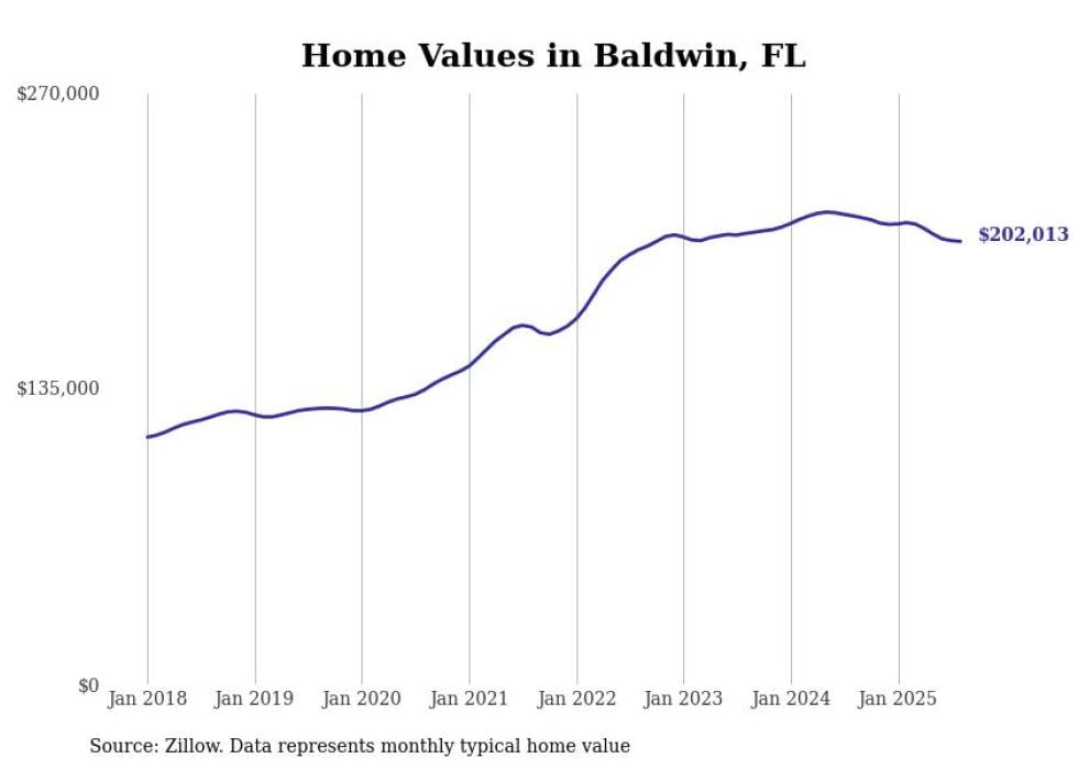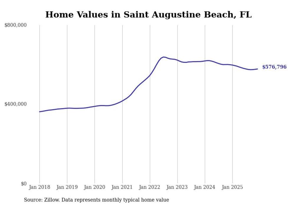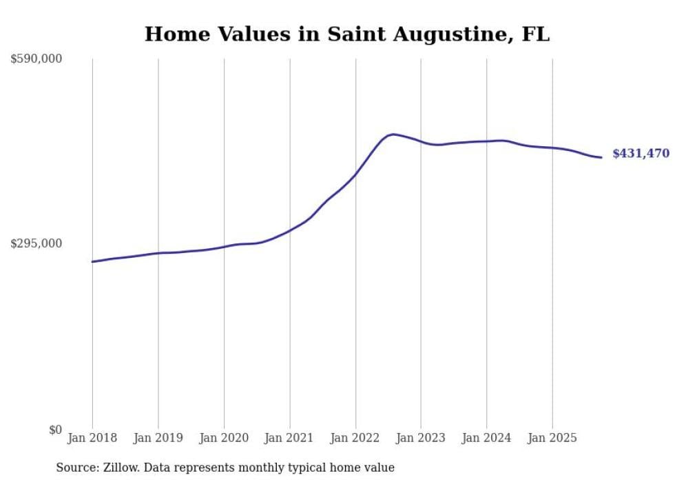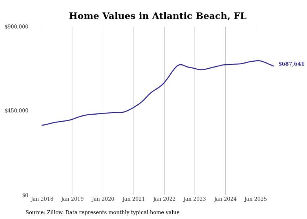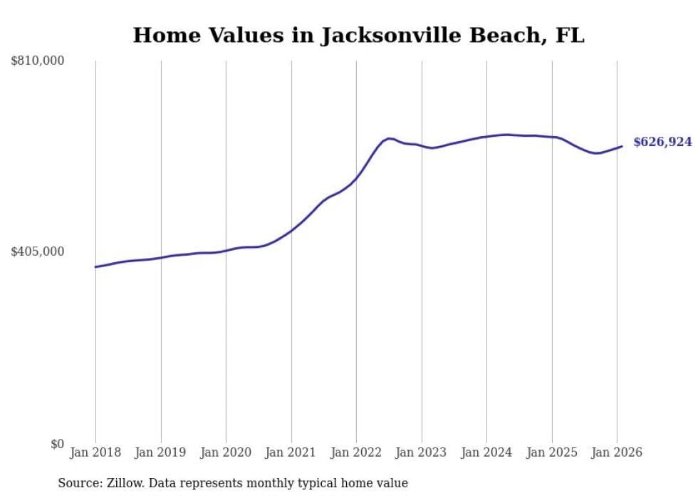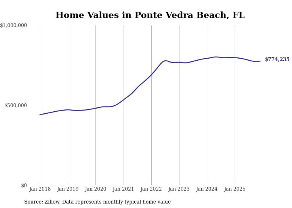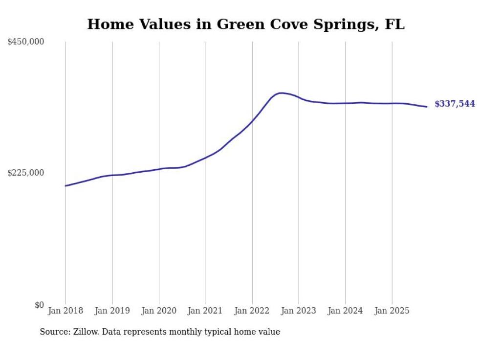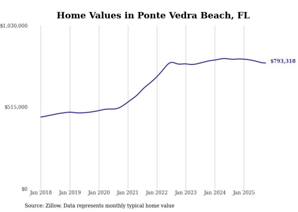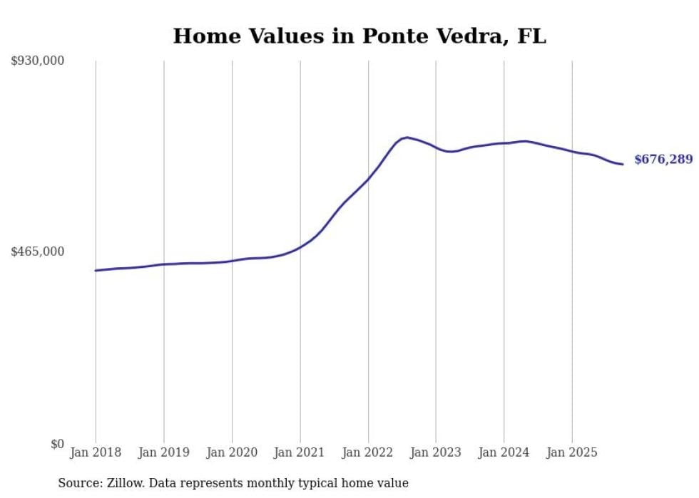 Stacker compiled a list of cities with the most expensive homes in the Jacksonville metro area using data from Zillow. Charts show the monthly typical home value since January 2018. All 27 cities and towns with data available were included in the list.