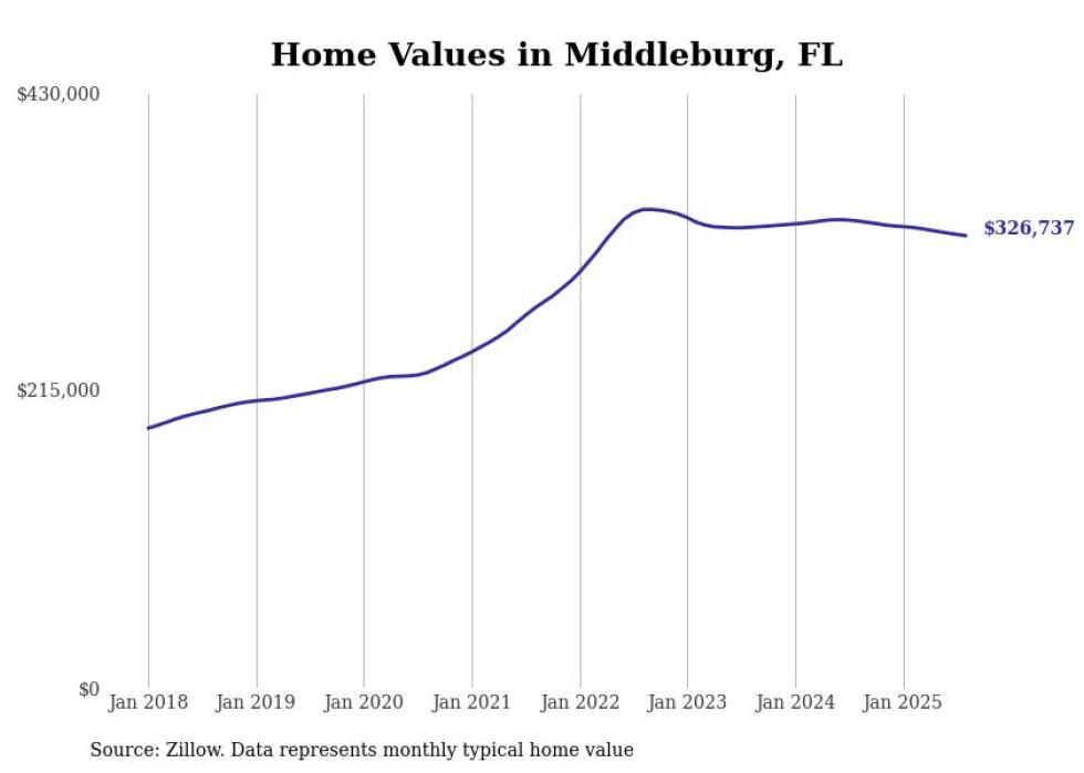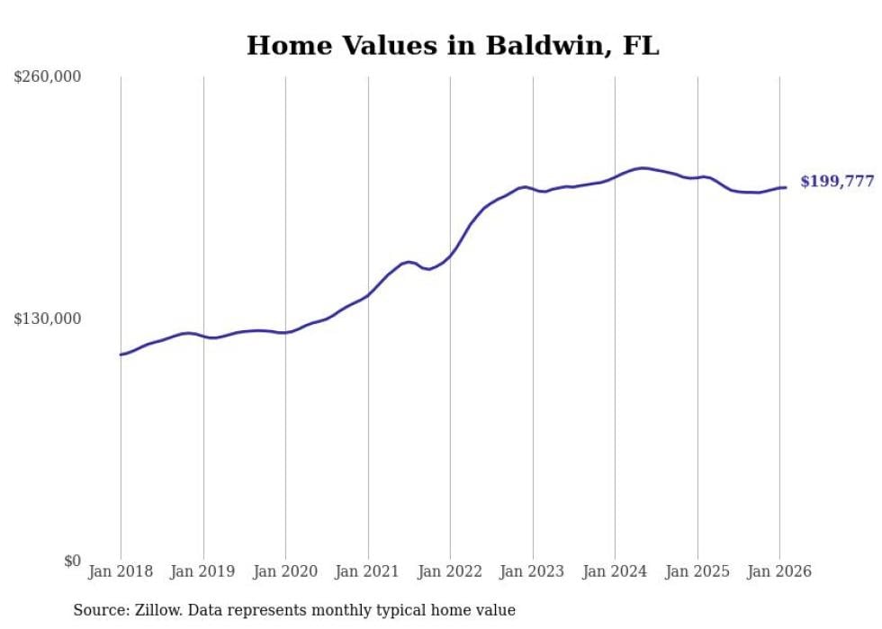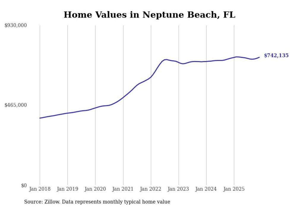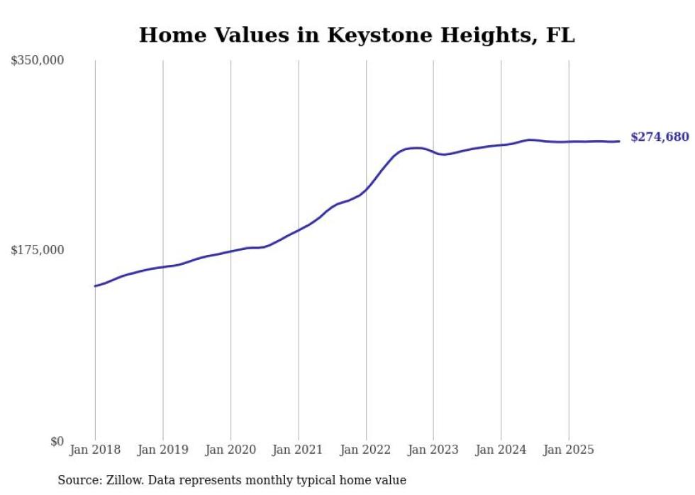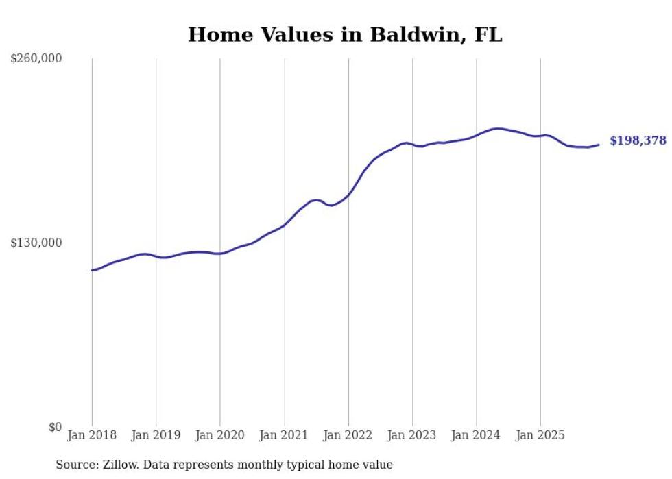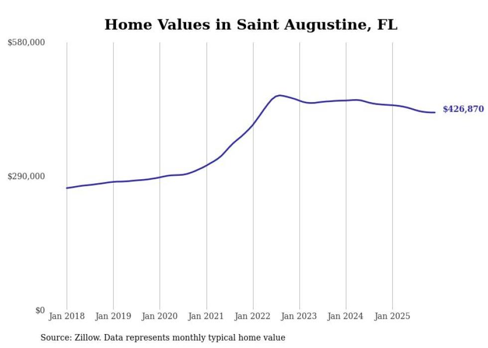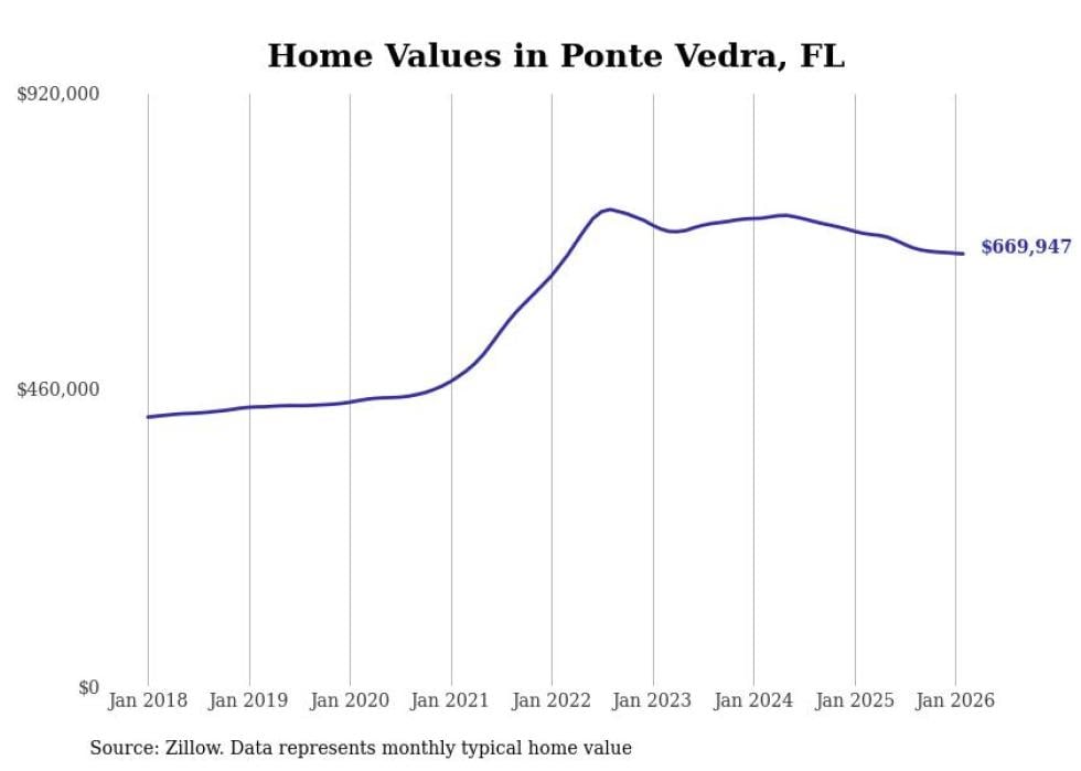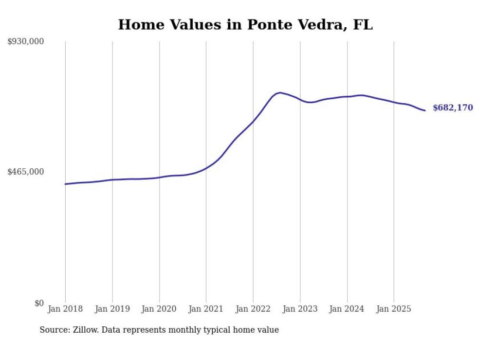 Stacker compiled a list of cities with the most expensive homes in the Jacksonville metro area using data from Zillow. Charts show the monthly typical home value since January 2018. All 27 cities and towns with data available were included in the list.