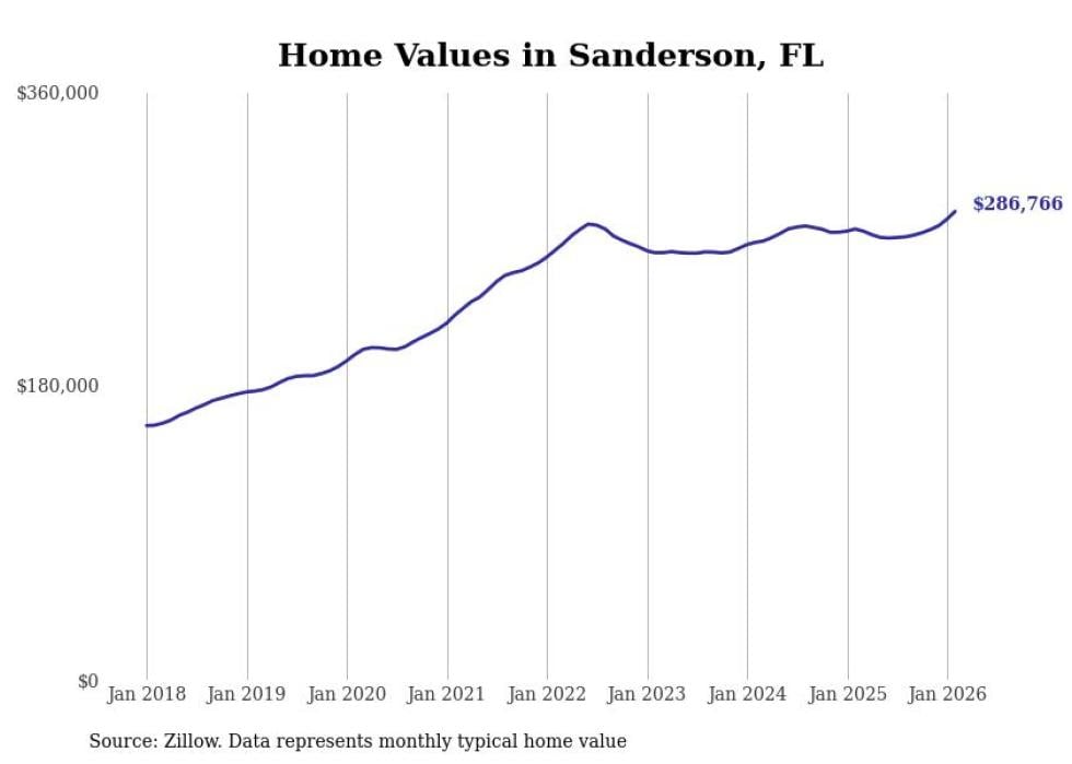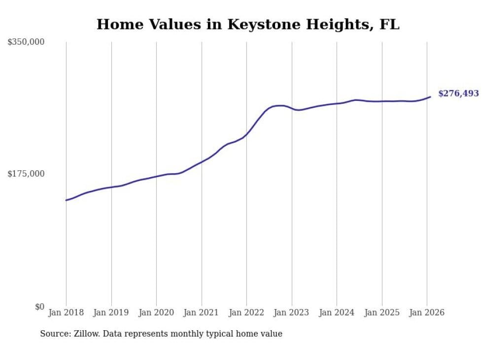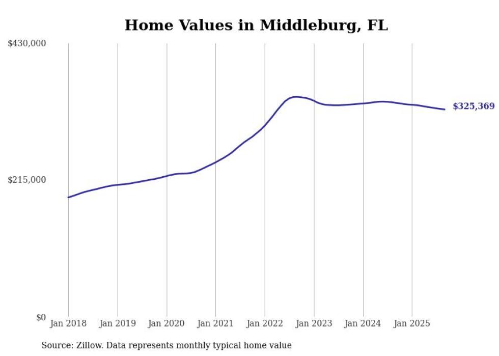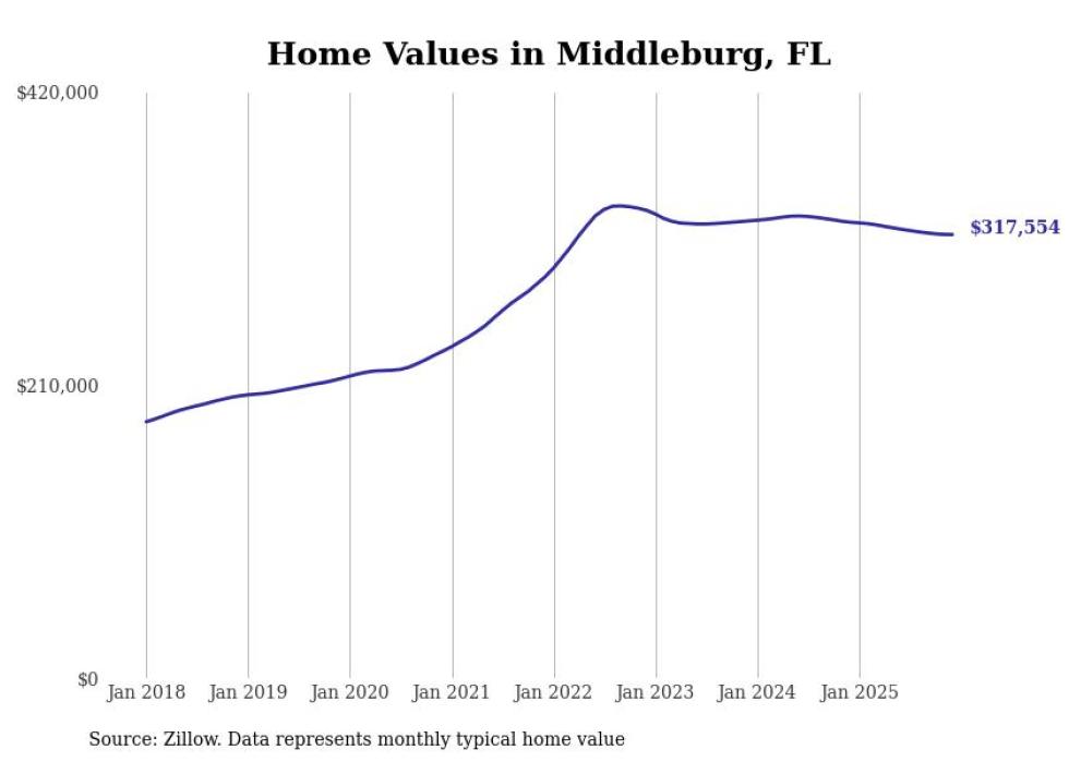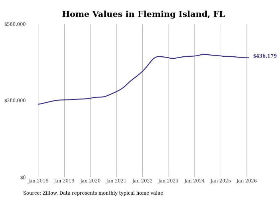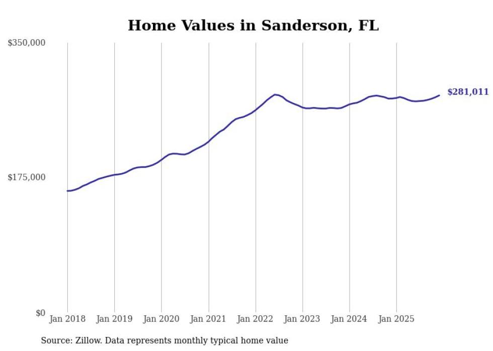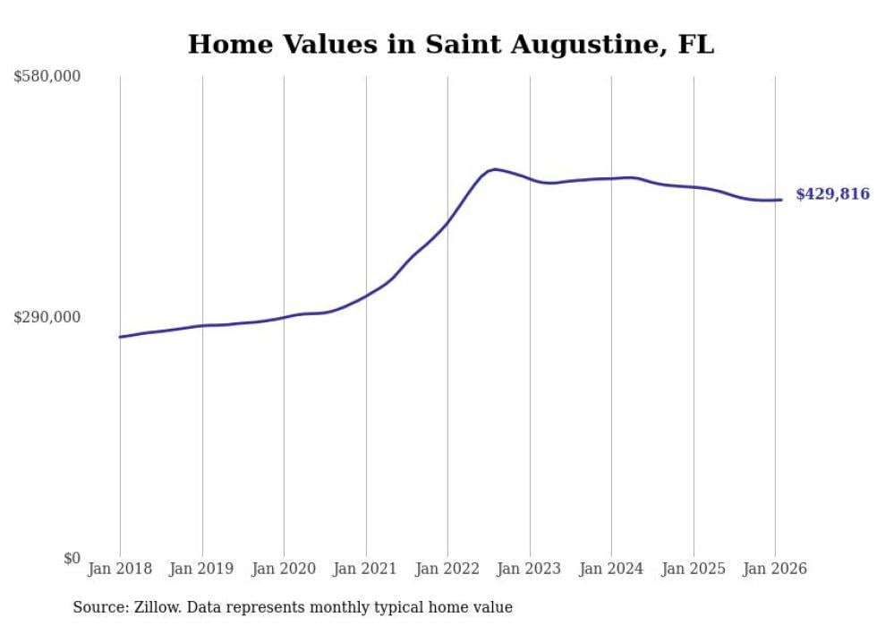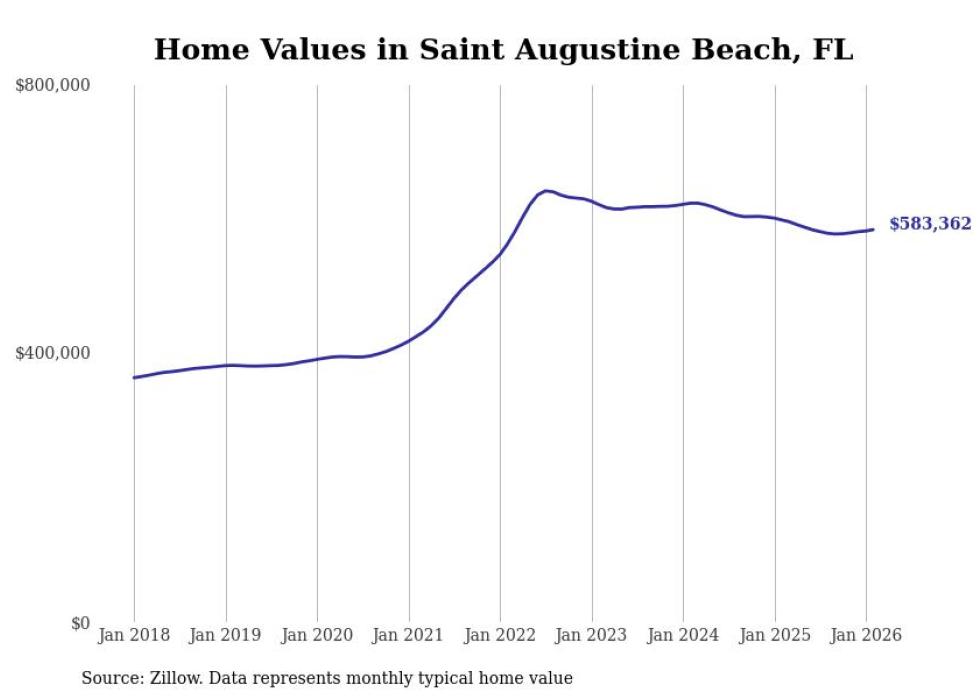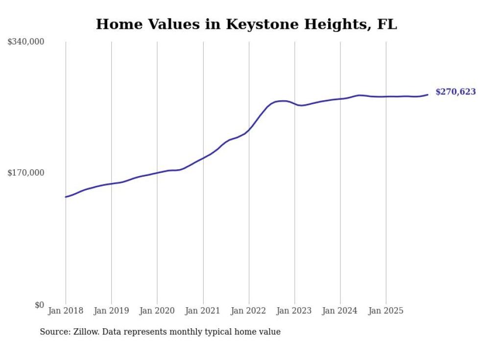 Stacker compiled a list of cities with the most expensive homes in the Jacksonville metro area using data from Zillow. Charts show the monthly typical home value since January 2018. All 27 cities and towns with data available were included in the list.
