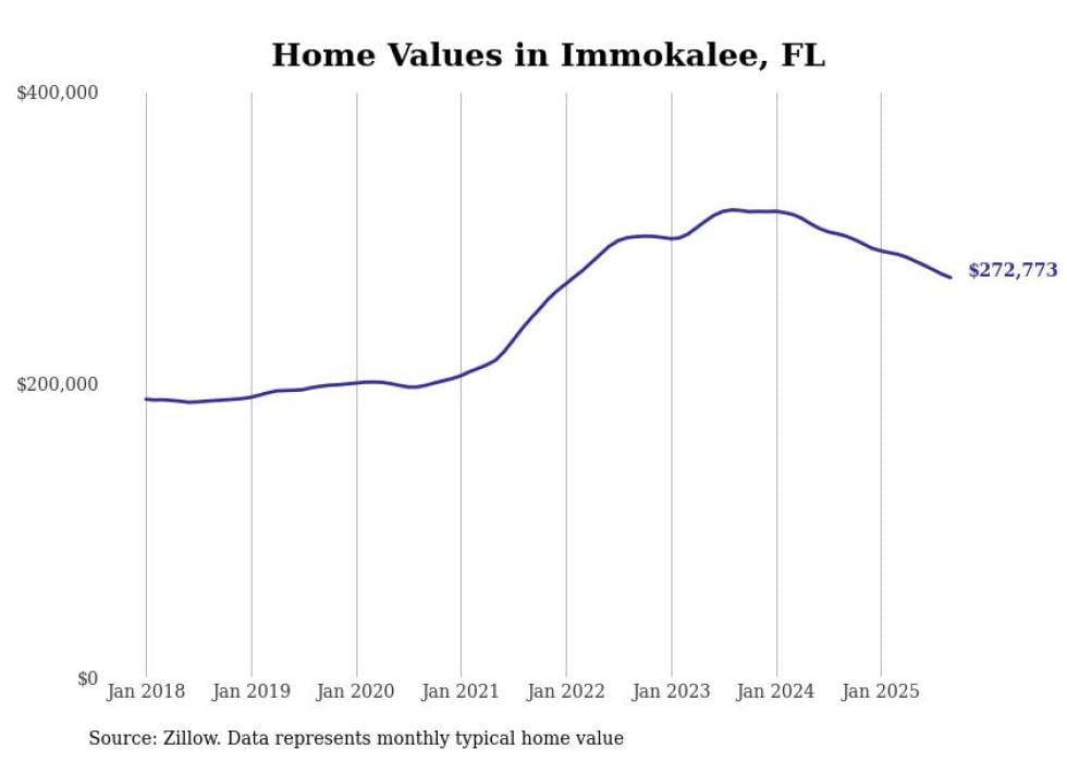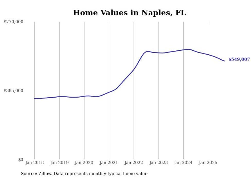 Stacker compiled a list of cities with the most expensive homes in the Naples metro area using data from Zillow. Charts show the monthly typical home value since January 2018. All 6 cities and towns with data available were included in the list.