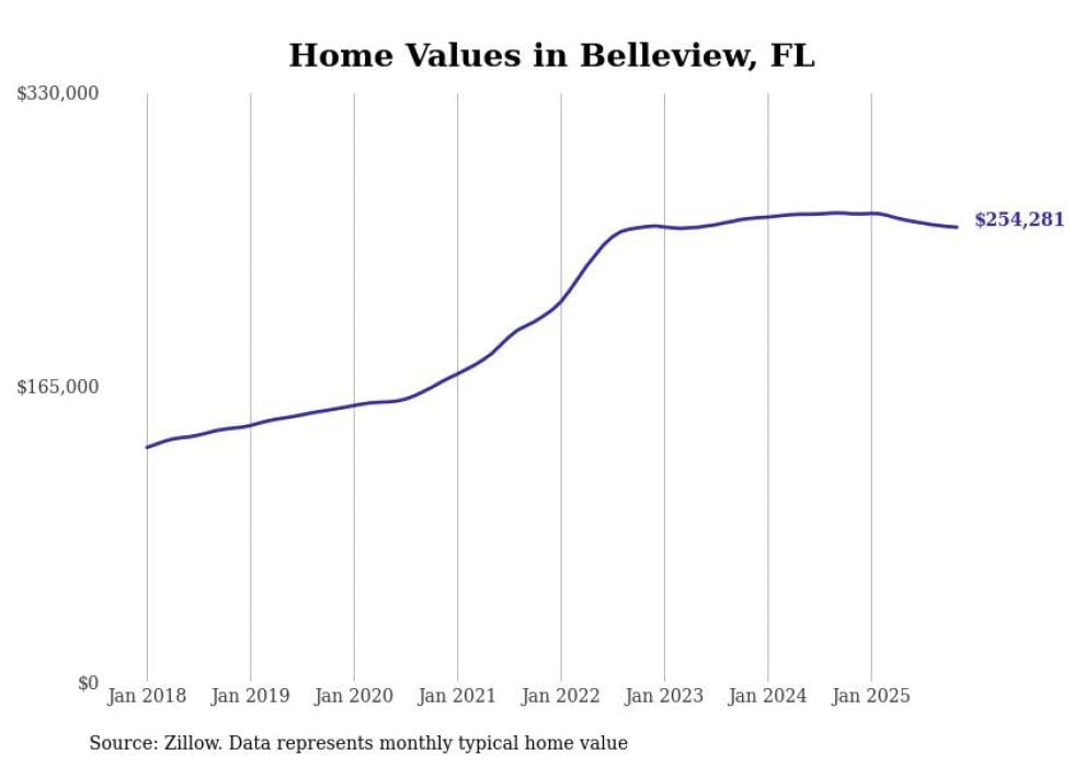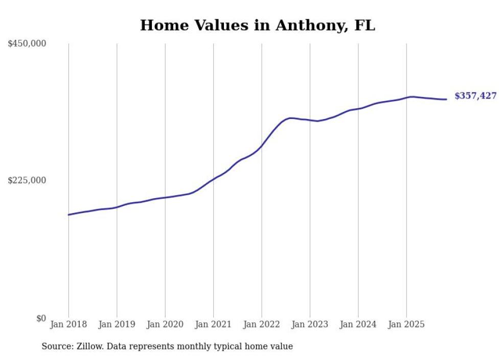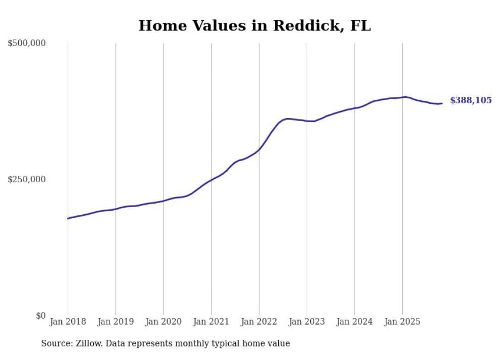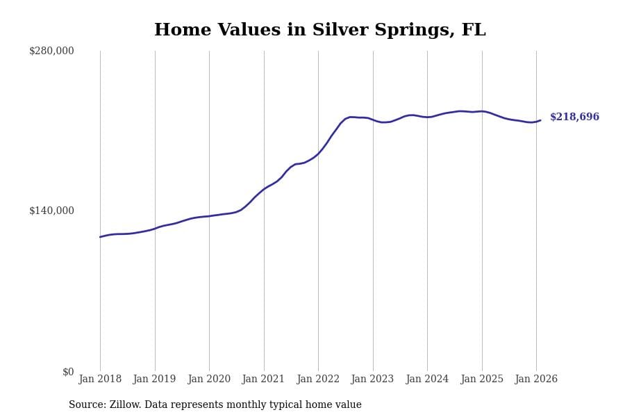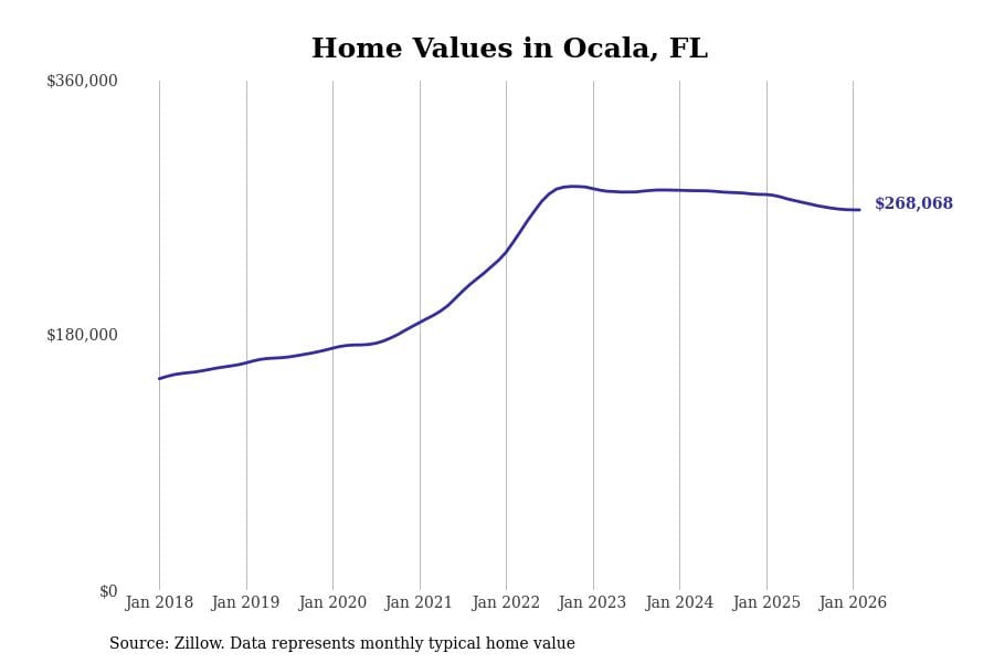 Stacker compiled a list of cities with the most expensive homes in the Ocala metro area using data from Zillow. Charts show the monthly typical home value since January 2018. All 12 cities and towns with data available were included in the list.