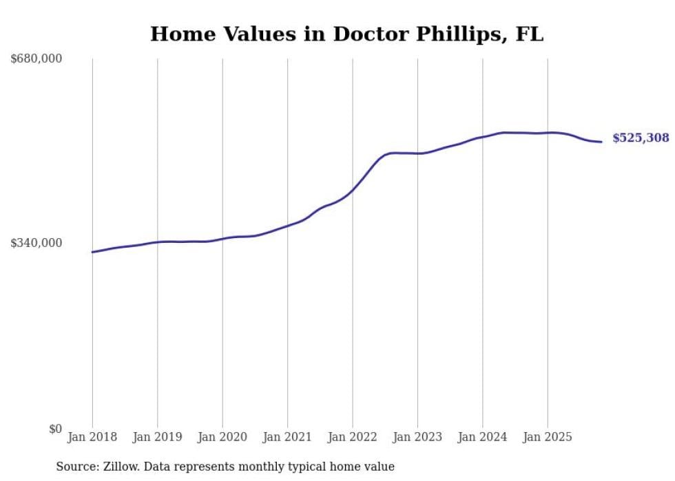 Stacker compiled a list of cities with the most expensive homes in the Orlando metro area using data from Zillow. Charts show the monthly typical home value since January 2018. Data was available for 55 cities and towns.