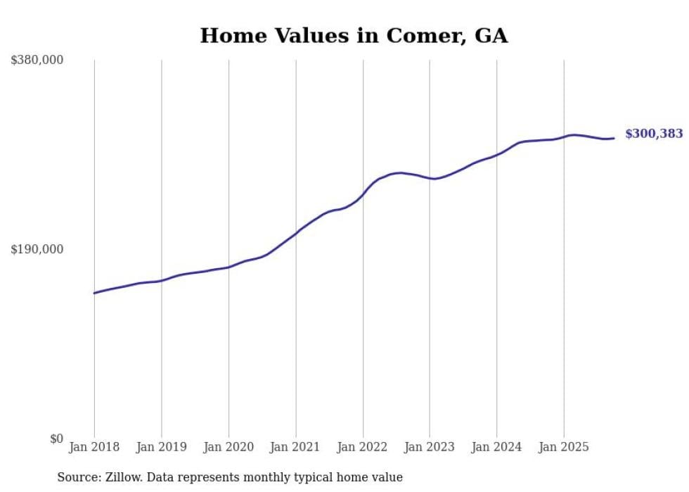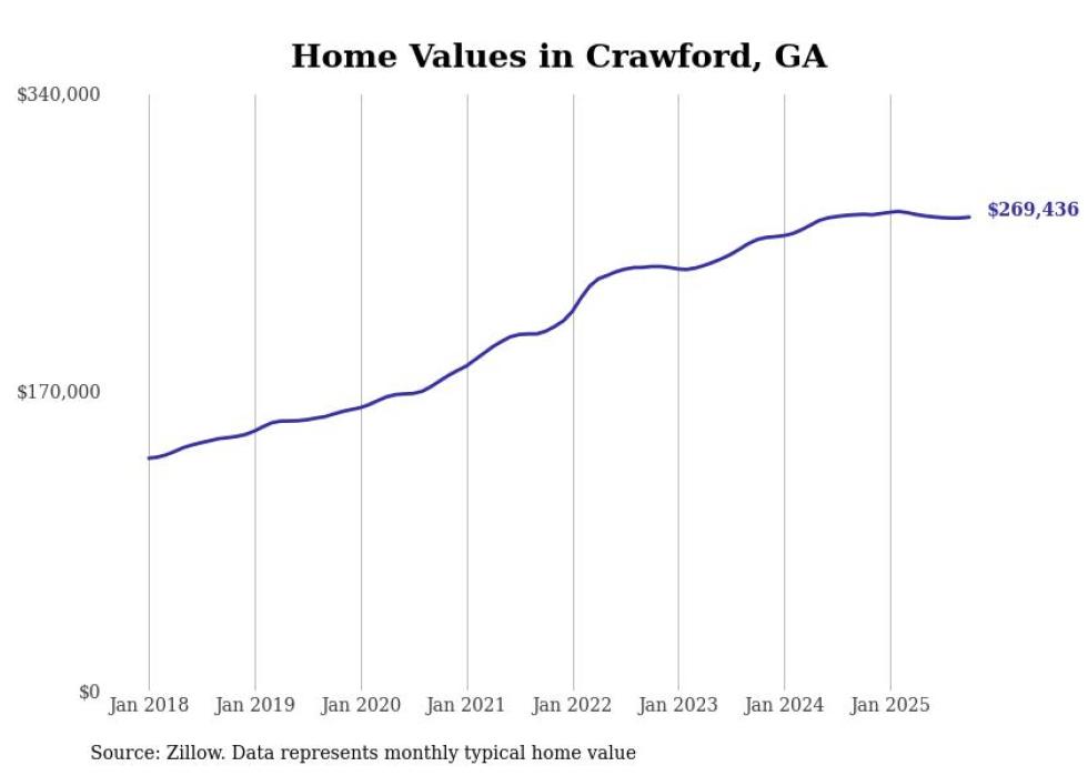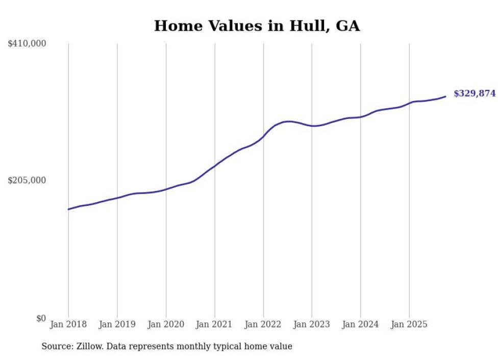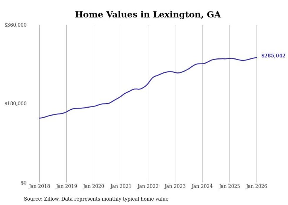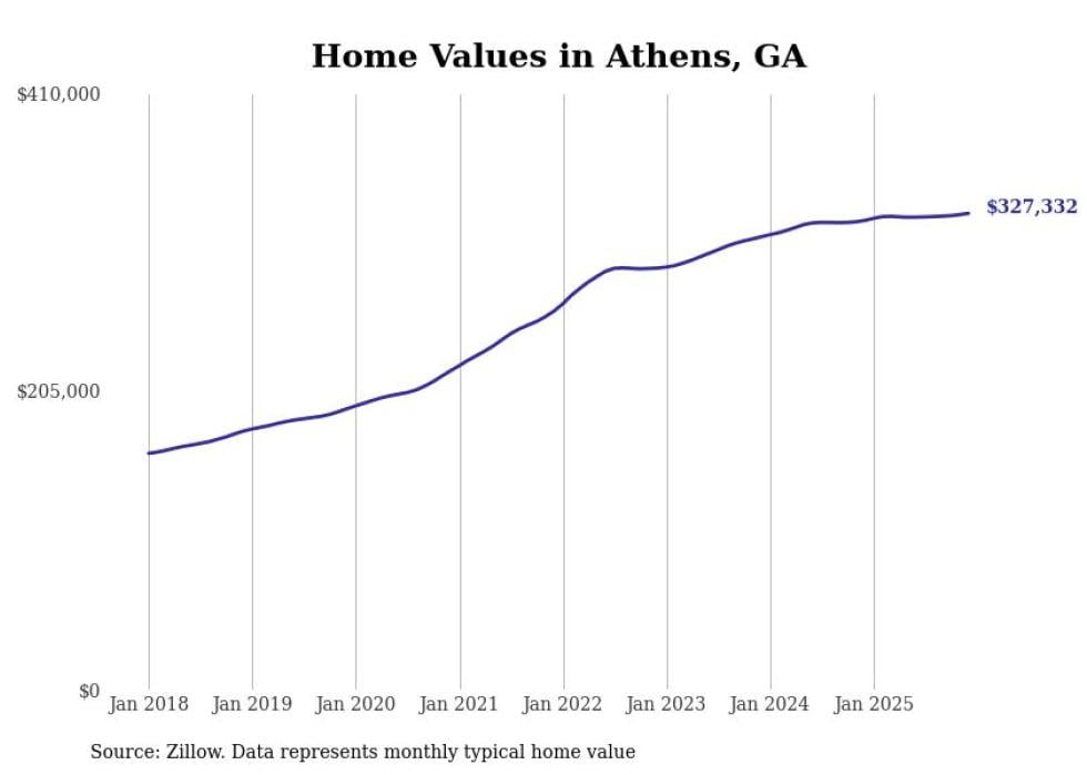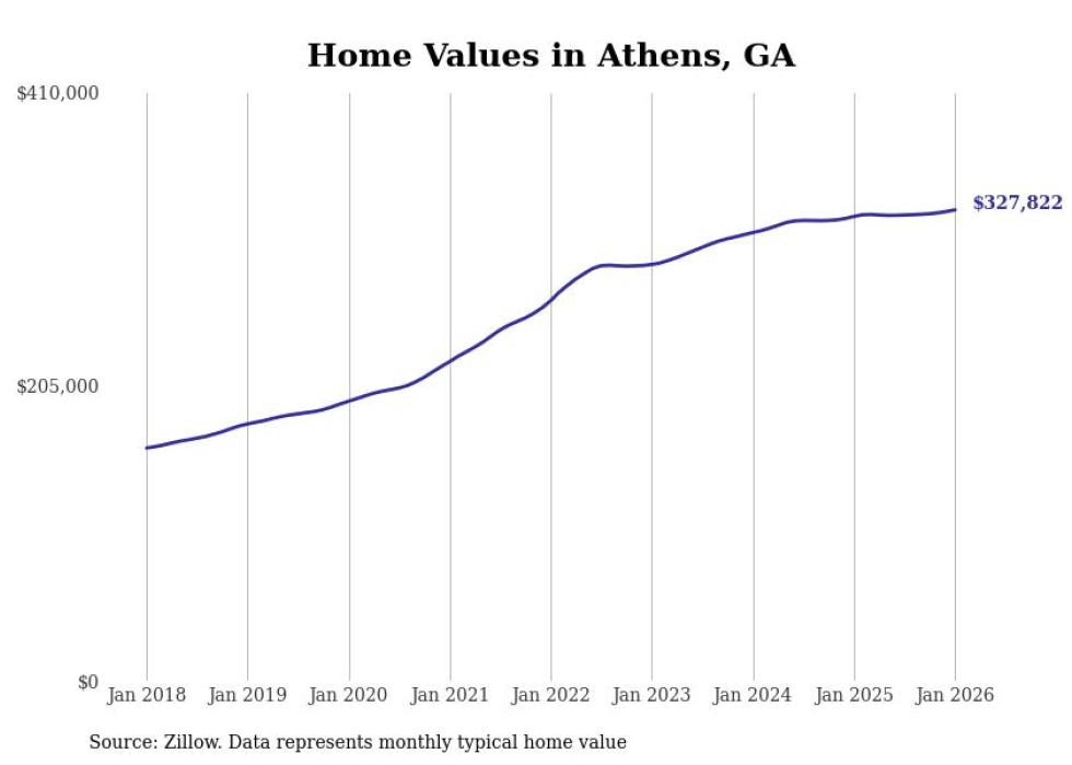 Stacker compiled a list of cities with the most expensive homes in the Athens metro area using data from Zillow. Charts show the monthly typical home value since January 2018. All 17 cities and towns with data available were included in the list.