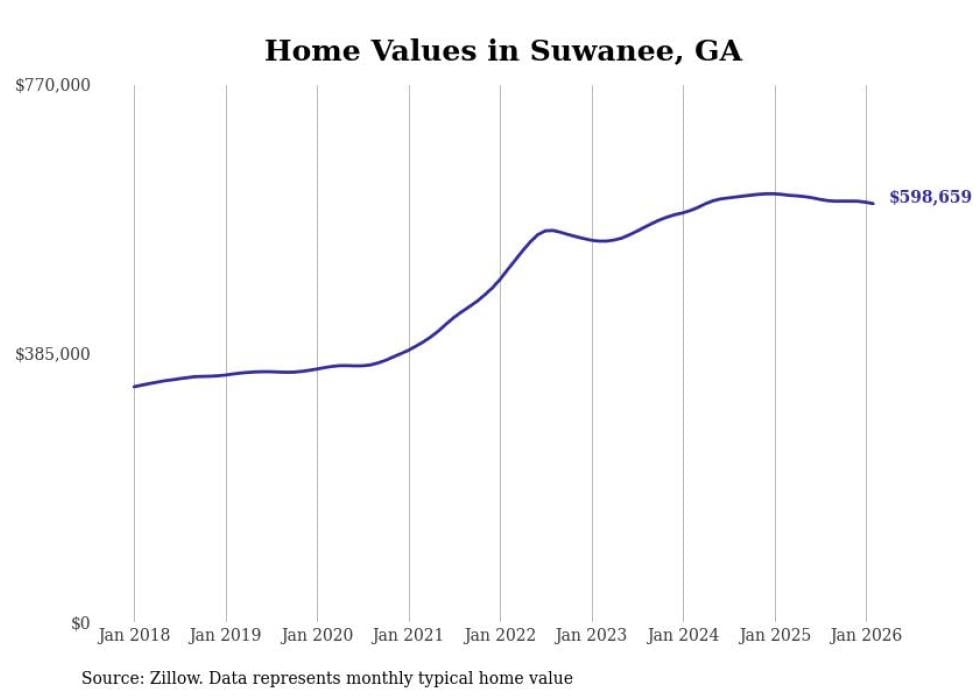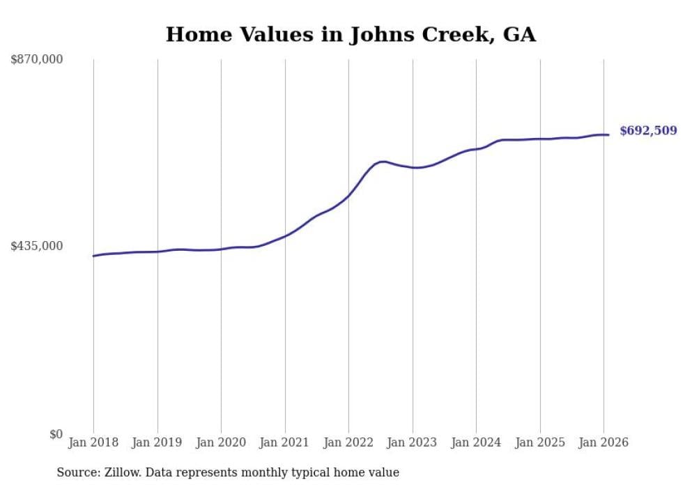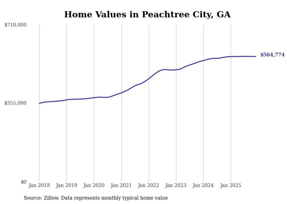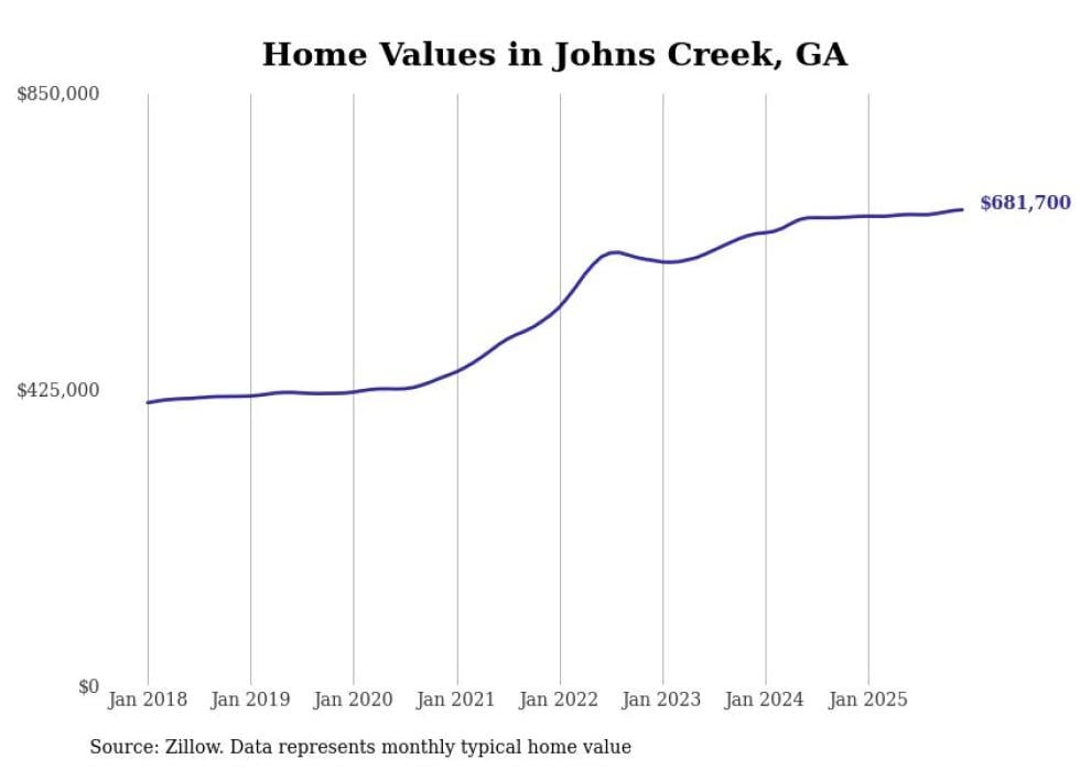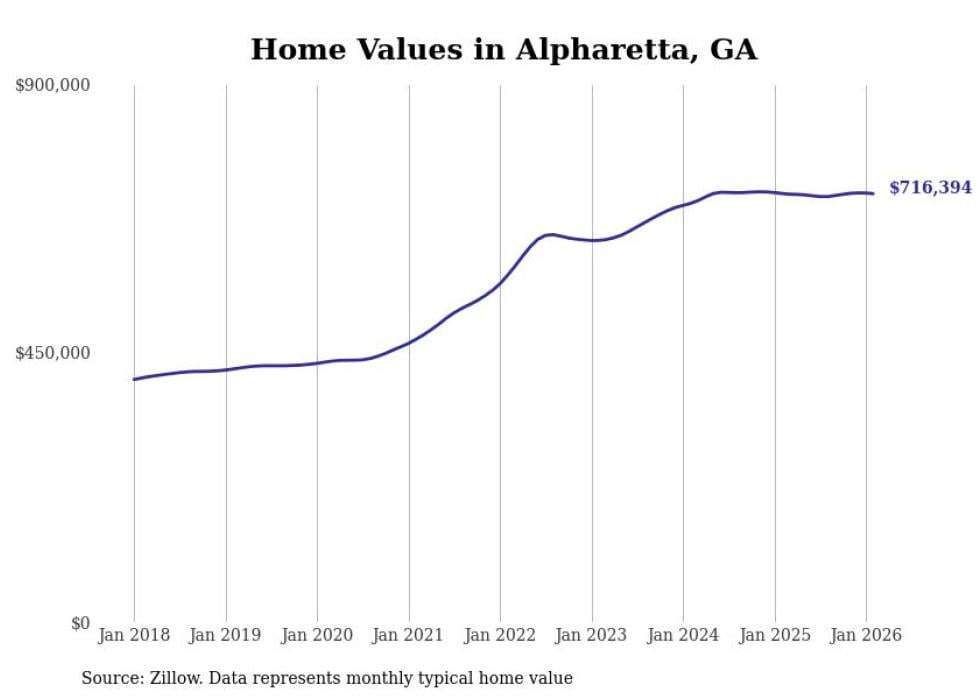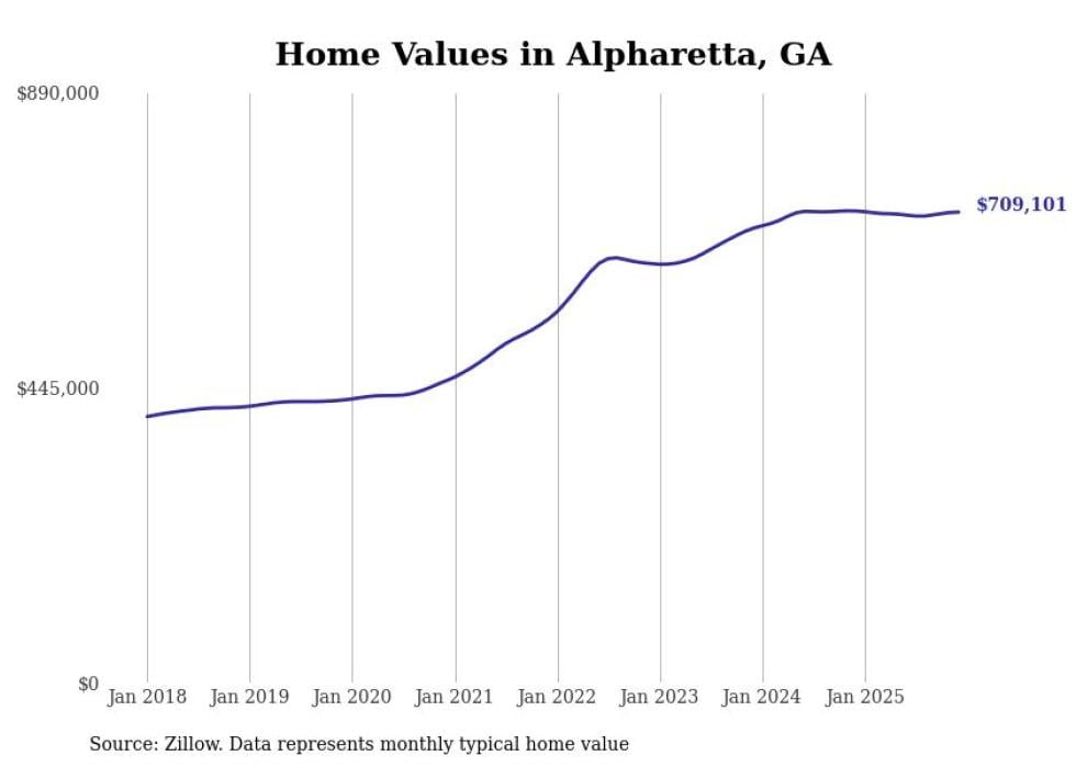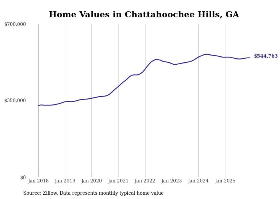 Stacker compiled a list of cities with the most expensive homes in the Atlanta metro area using data from Zillow. Charts show the monthly typical home value since January 2018. Data was available for 149 cities and towns.
