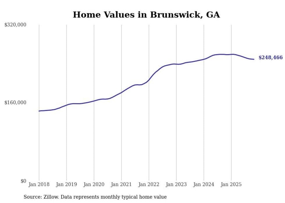 Stacker compiled a list of cities with the most expensive homes in the Brunswick, GA metro area using data from Zillow. Charts show the monthly typical home value since January 2018.
