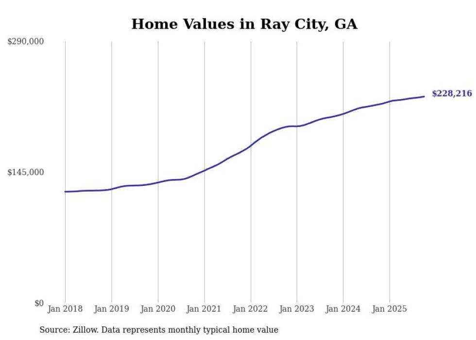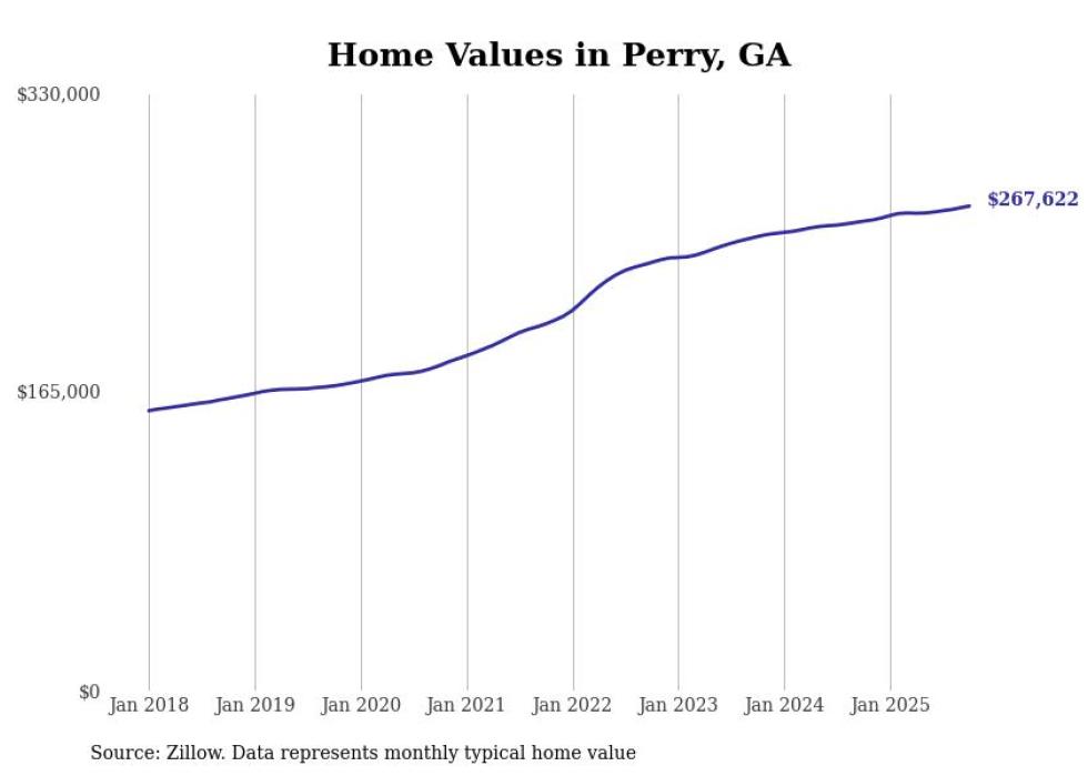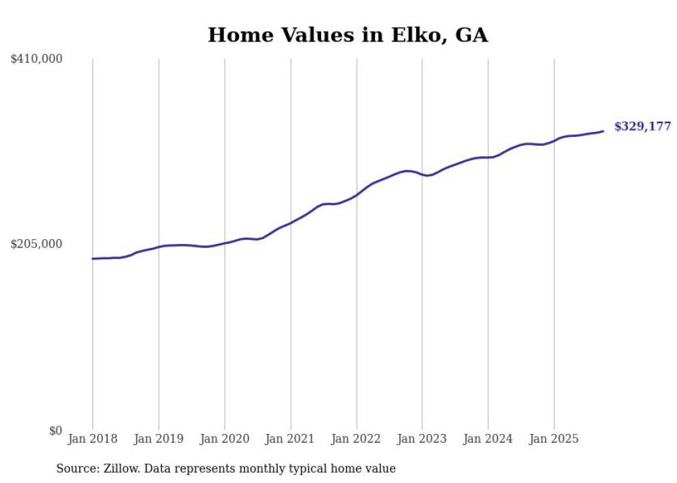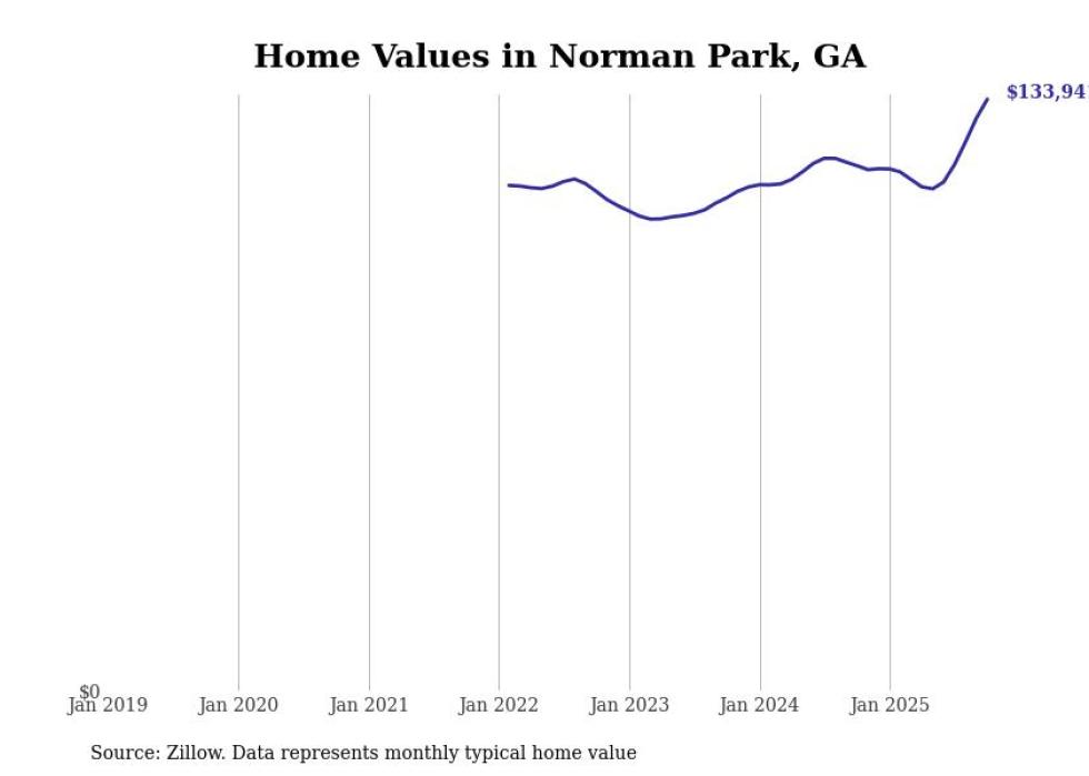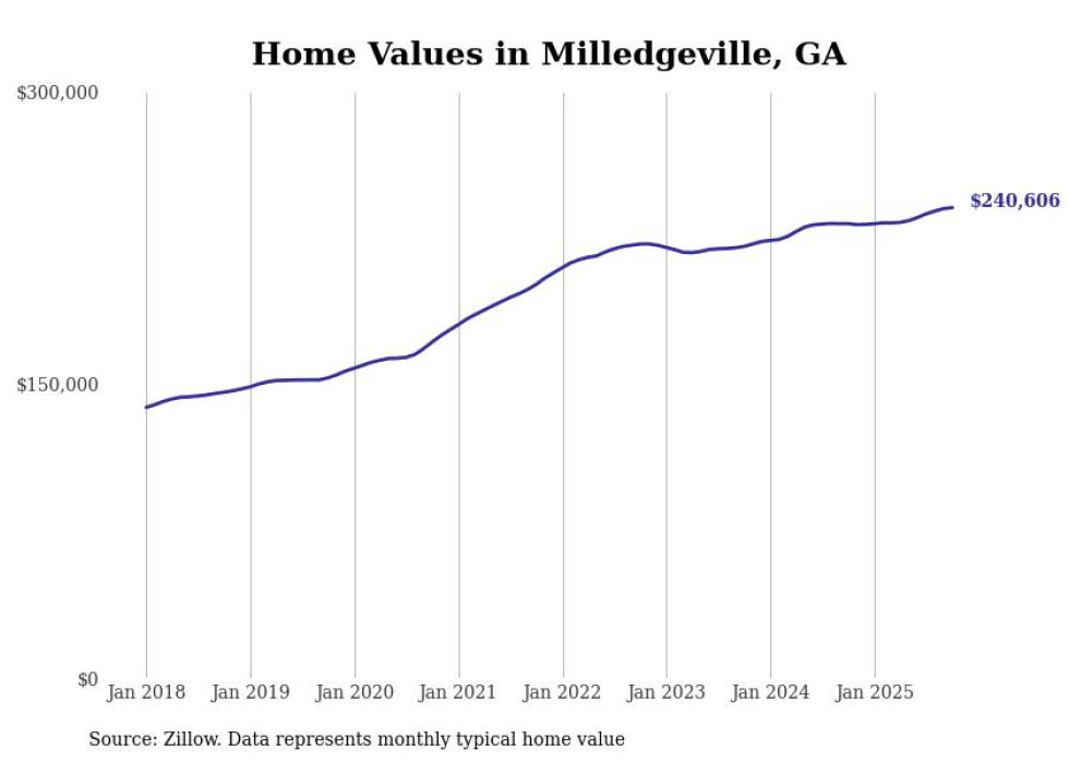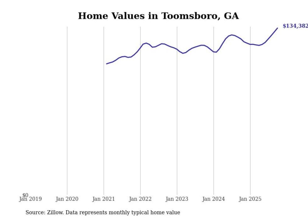 Stacker compiled a list of cities with the fastest-growing home prices in Georgia using data from Zillow. Cities are ranked by the dollar change in the Zillow Home Values Index for all homes from the 12 months ending October 2025. The charts in this story were created automatically using Matplotlib. Data was available for 50 cities and towns in Georgia.