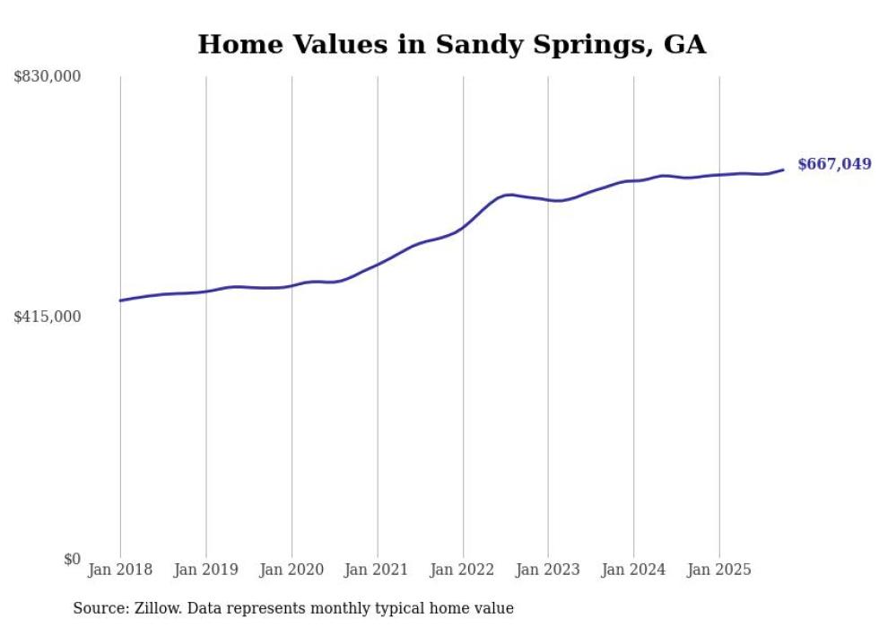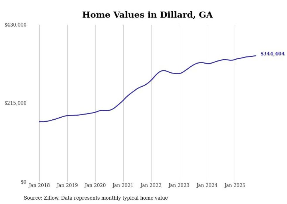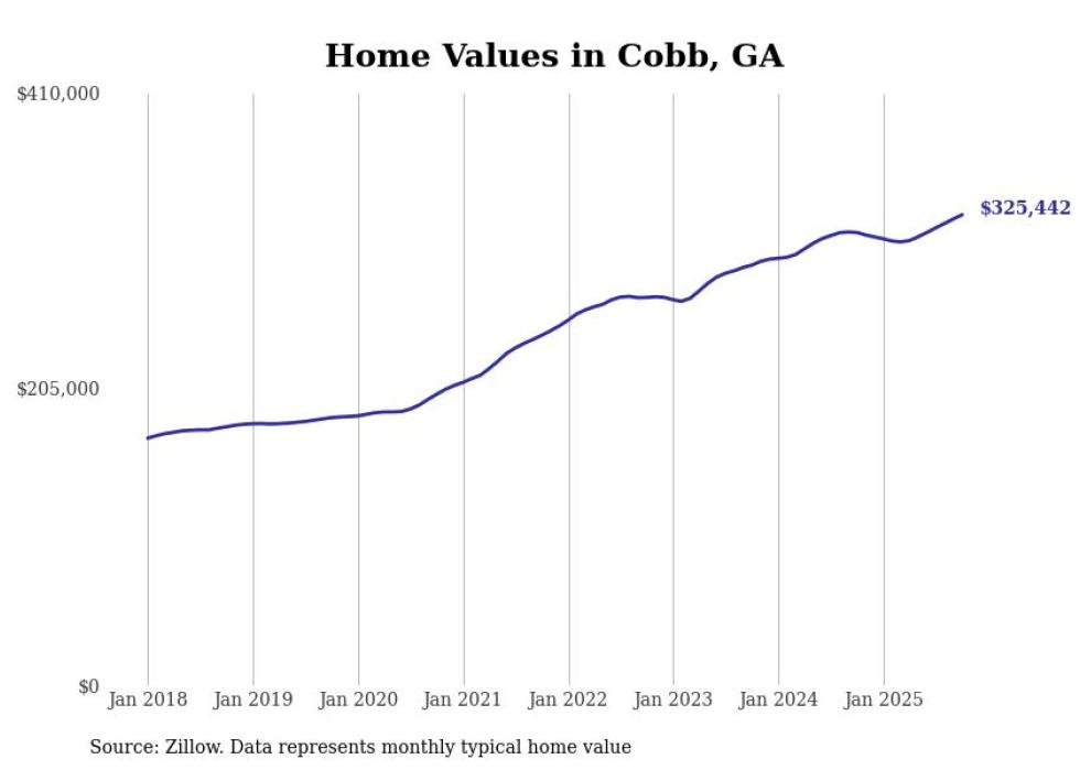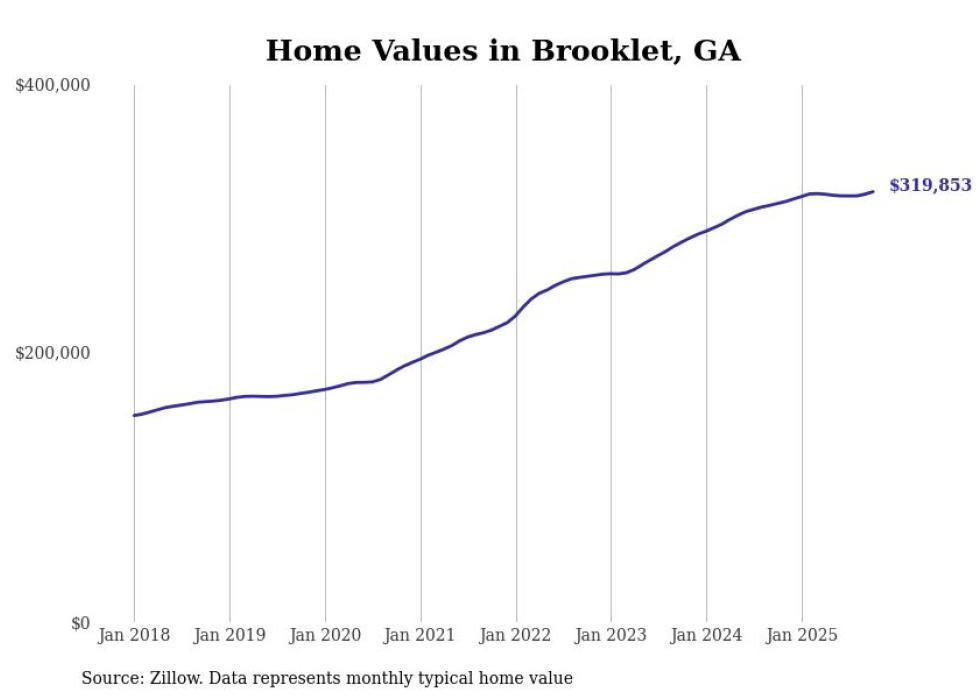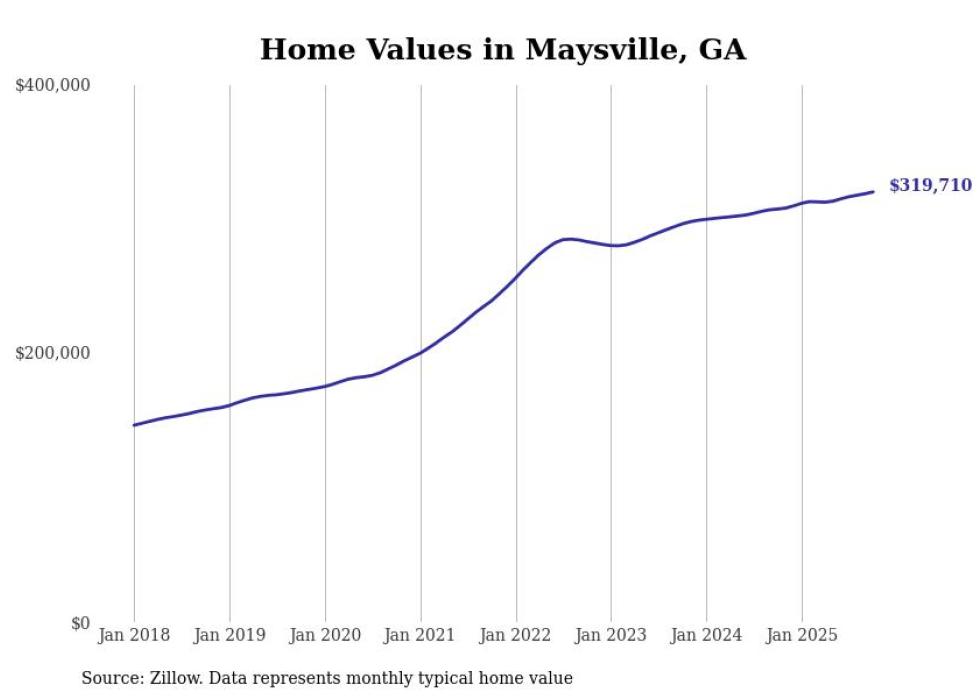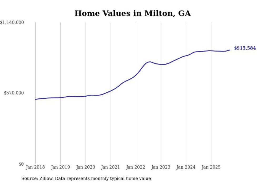 Stacker compiled a list of cities with the fastest-growing home prices in Georgia using data from Zillow. Cities are ranked by the dollar change in the Zillow Home Values Index for all homes from the 12 months ending October 2025. The charts in this story were created automatically using Matplotlib. Data was available for 50 cities and towns in Georgia.