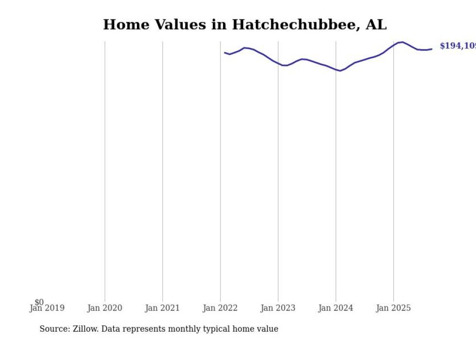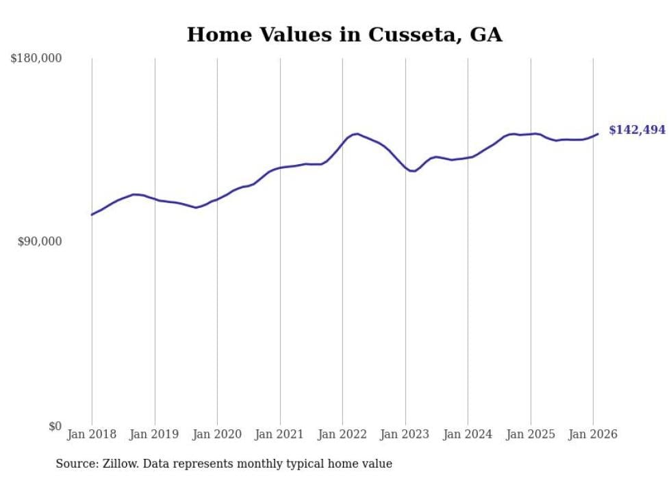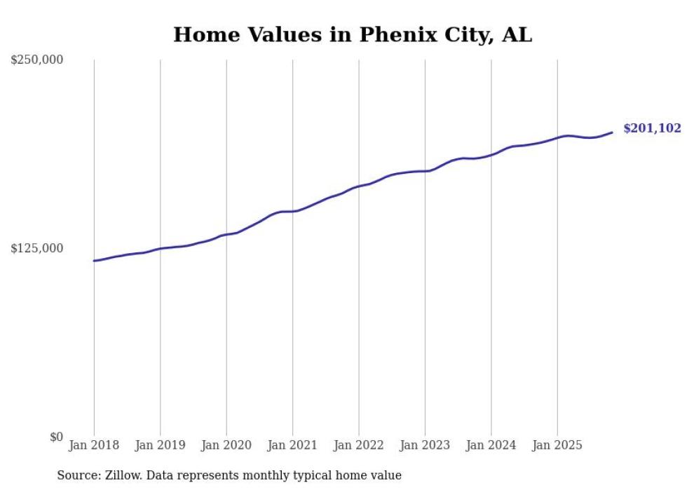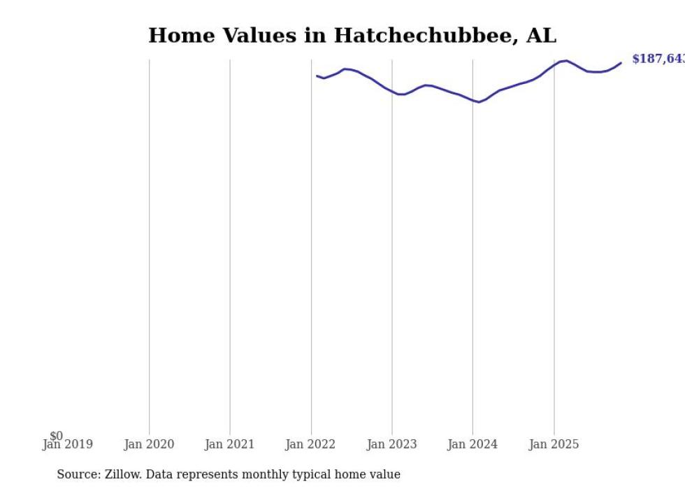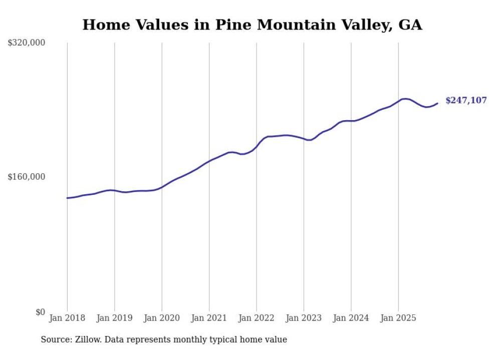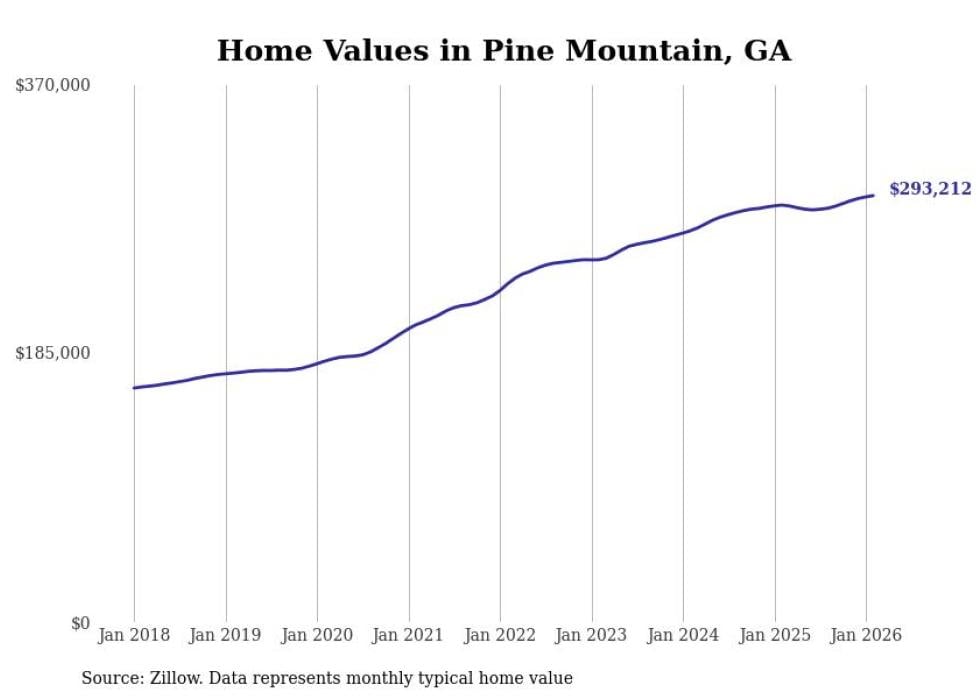 Stacker compiled a list of cities with the most expensive homes in the Columbus, GA-AL metro area using data from Zillow. Charts show the monthly typical home value since January 2018.