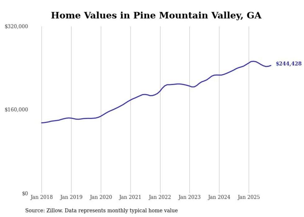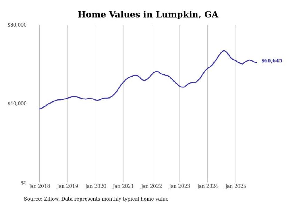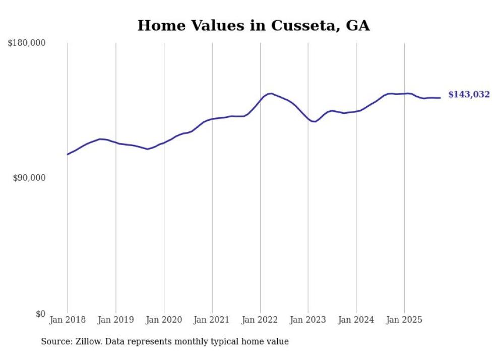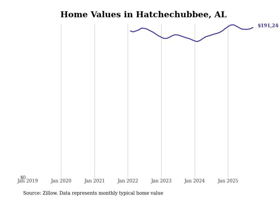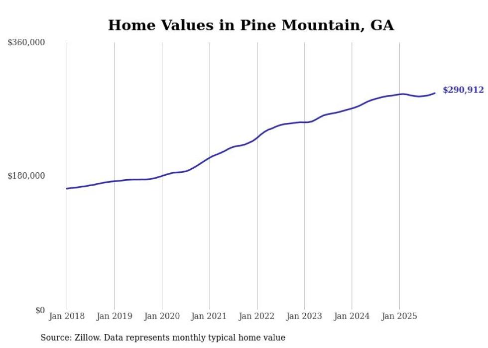 Stacker compiled a list of cities with the most expensive homes in the Columbus, Georgia metro area using data from Zillow. Charts show the monthly typical home value since January 2018. All 23 cities and towns with data available were included in the list.