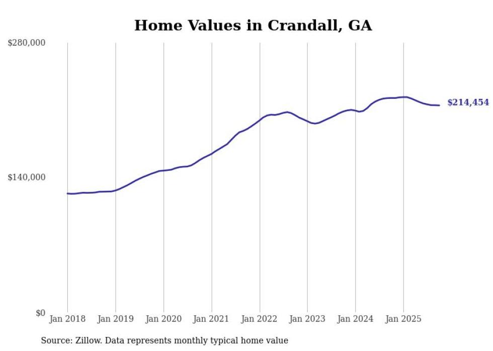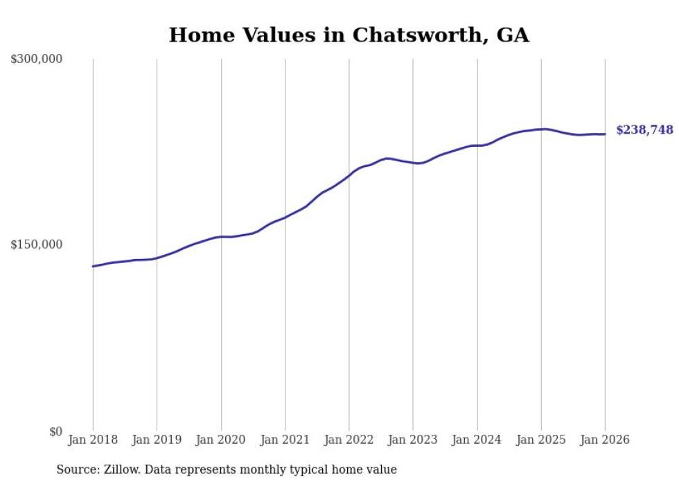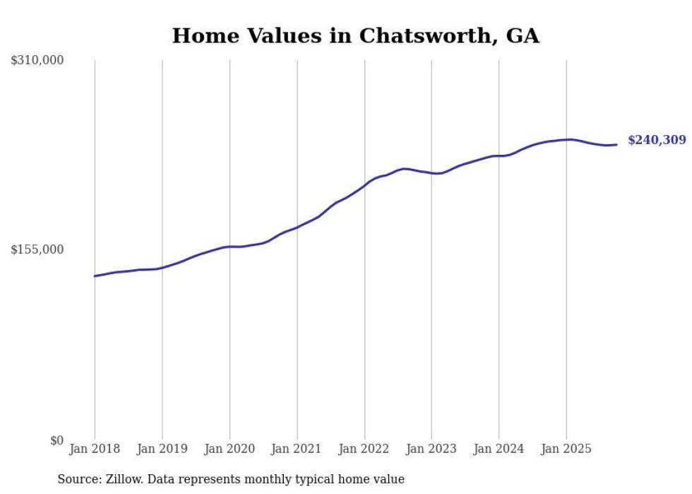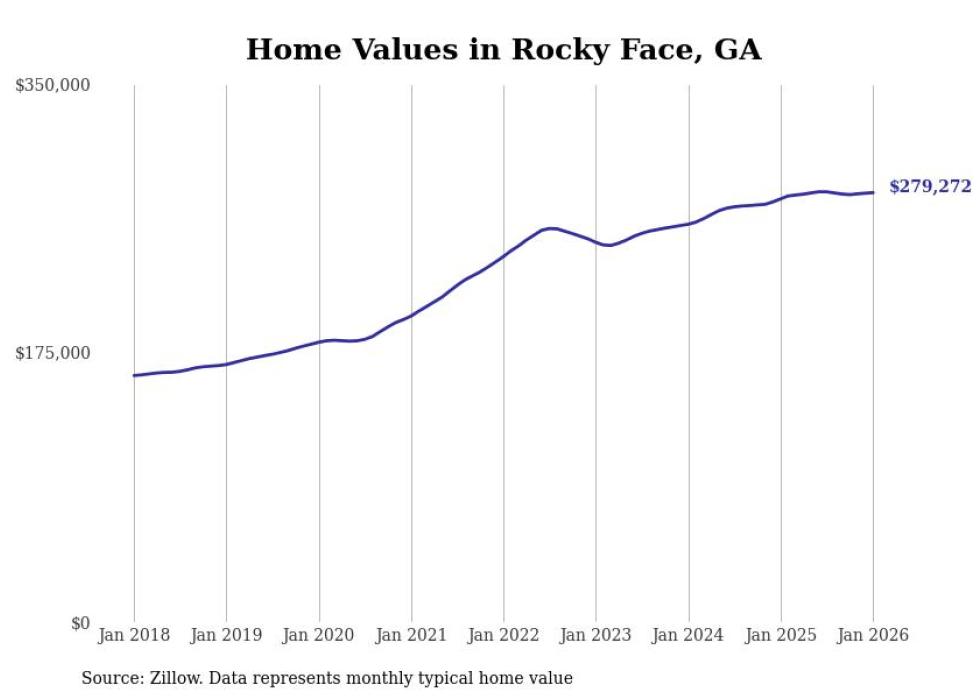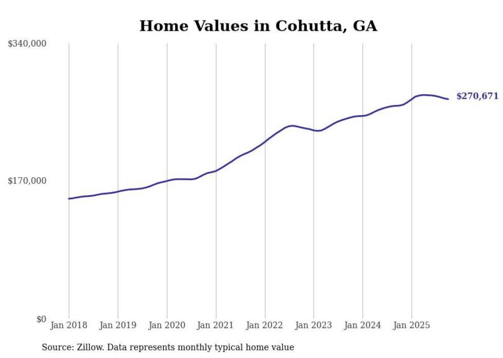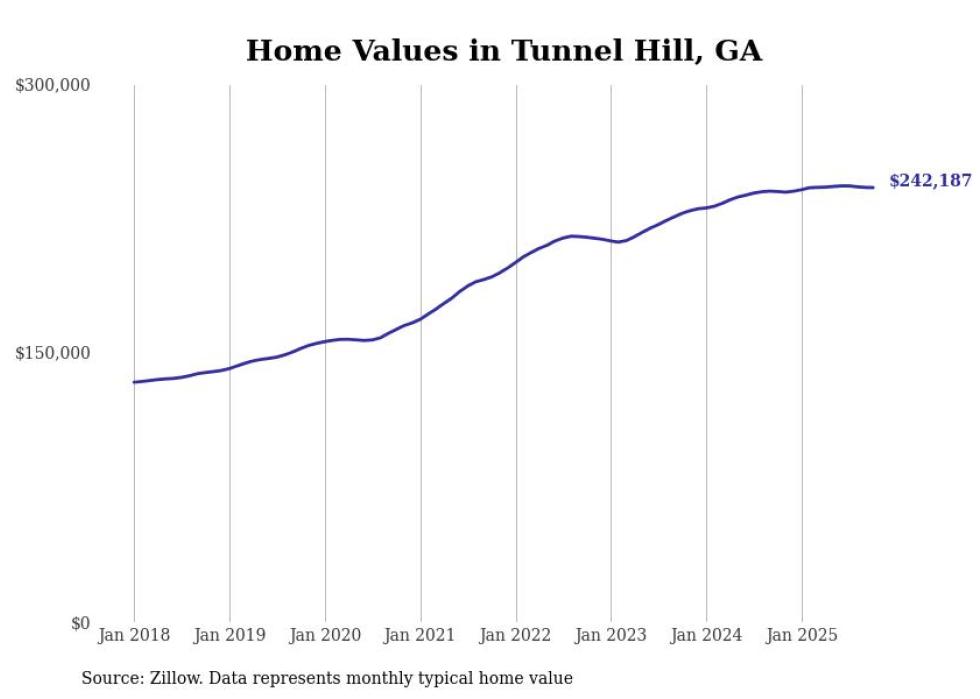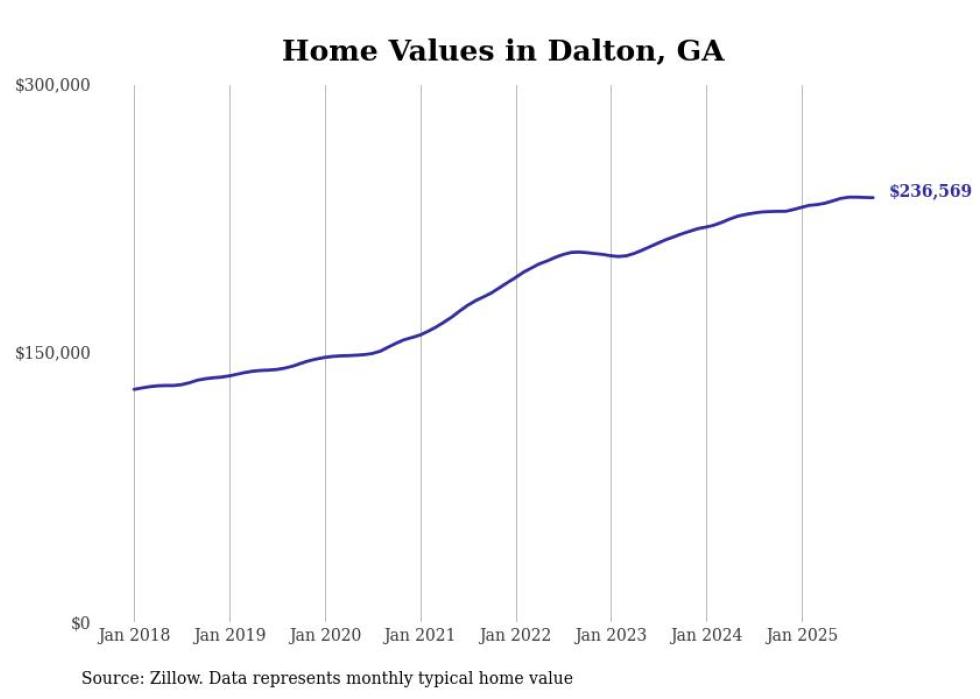 Stacker compiled a list of cities with the most expensive homes in the Dalton metro area using data from Zillow. Charts show the monthly typical home value since January 2018. All 8 cities and towns with data available were included in the list.