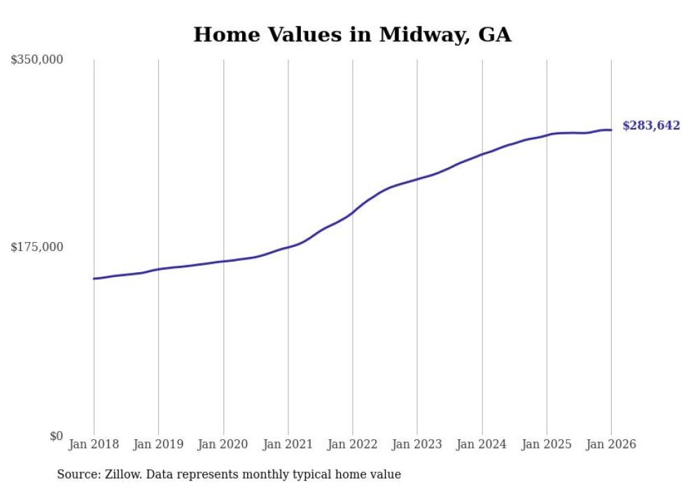 Stacker compiled a list of cities with the most expensive homes in the Hinesville, GA metro area using data from Zillow. Charts show the monthly typical home value since January 2018.