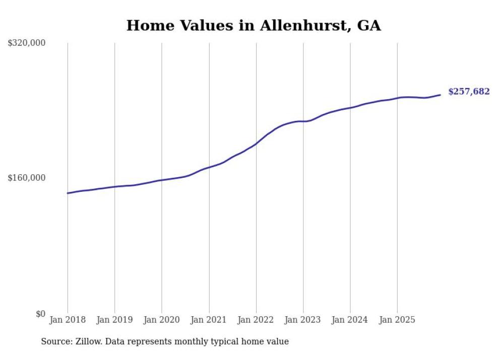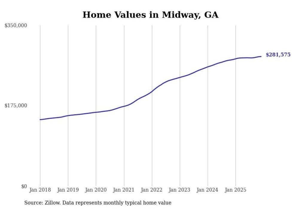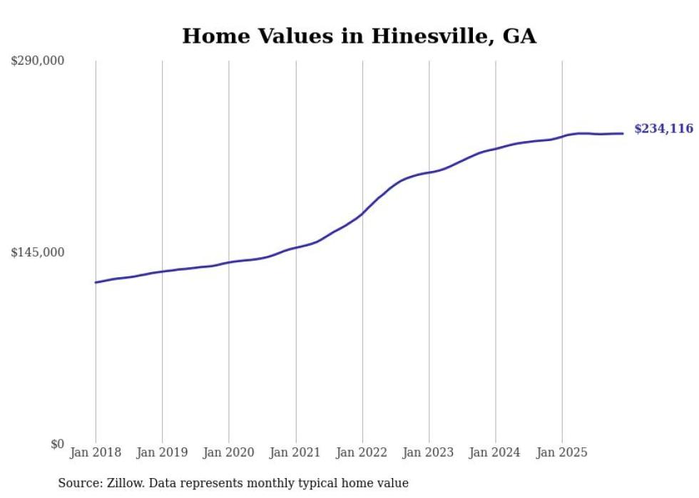 Stacker compiled a list of cities with the most expensive homes in the Hinesville metro area using data from Zillow. Charts show the monthly typical home value since January 2018. All 8 cities and towns with data available were included in the list.