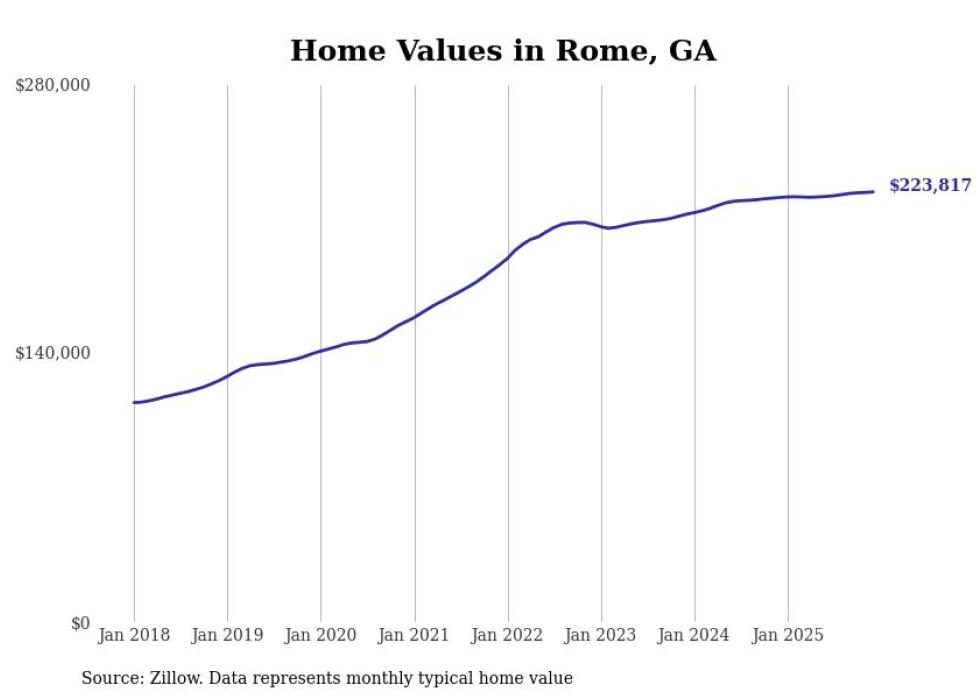Stacker compiled a list of cities with the most expensive homes in the Rome metro area using data from Zillow. Charts show the monthly typical home value since January 2018. All 5 cities and towns with data available were included in the list.