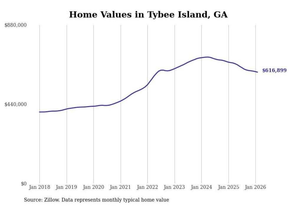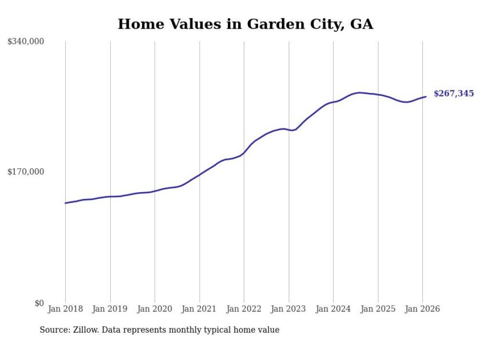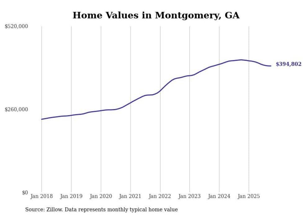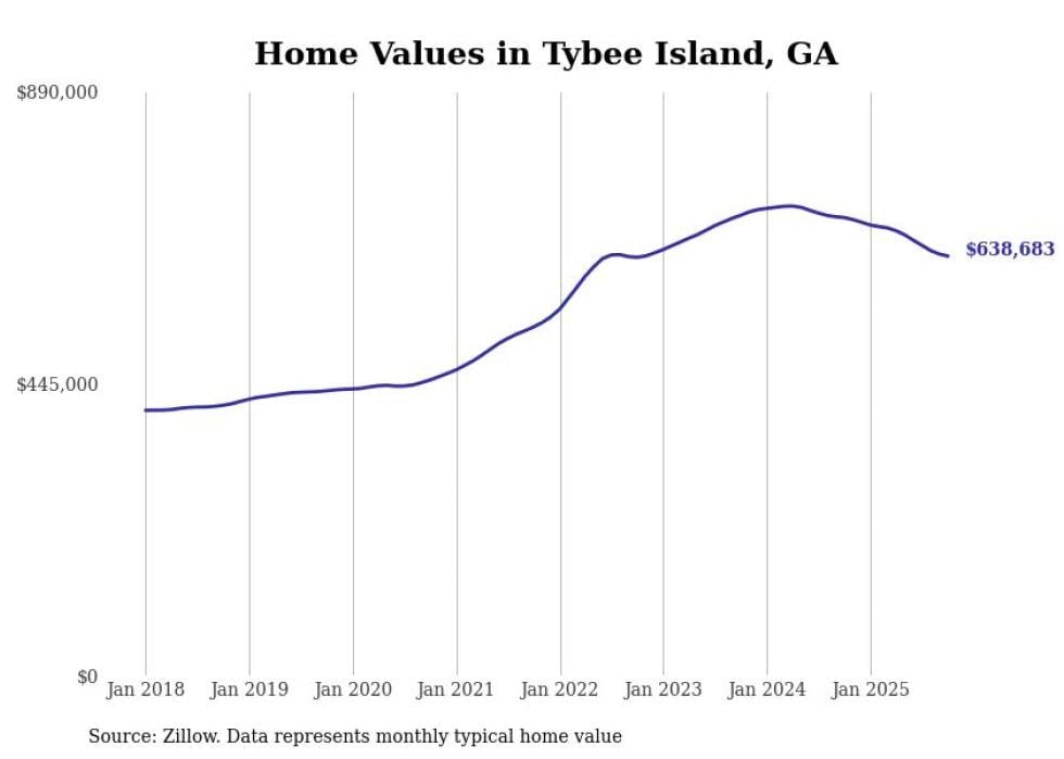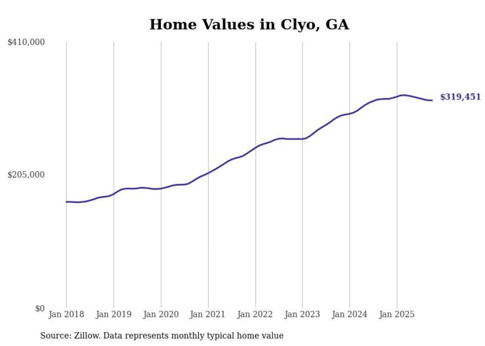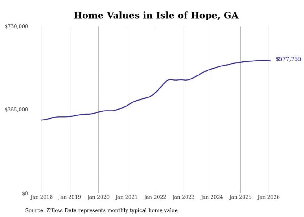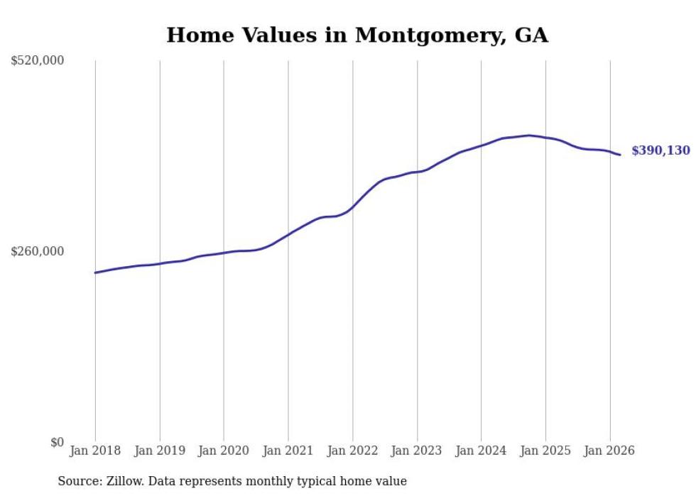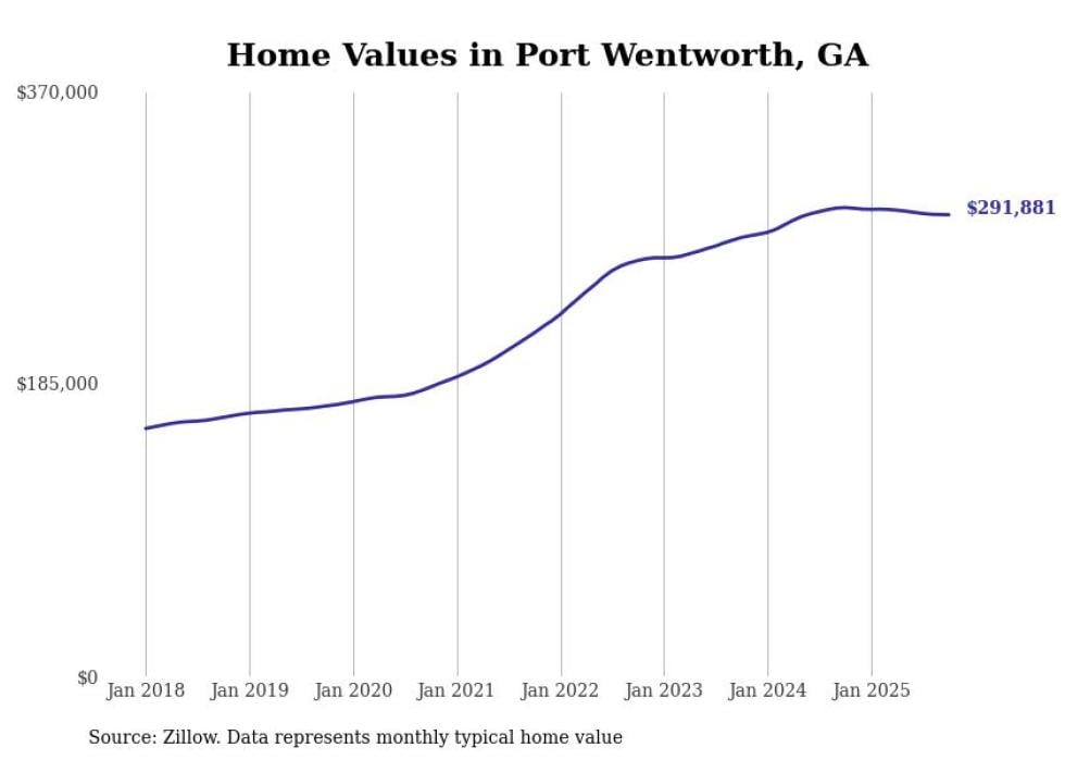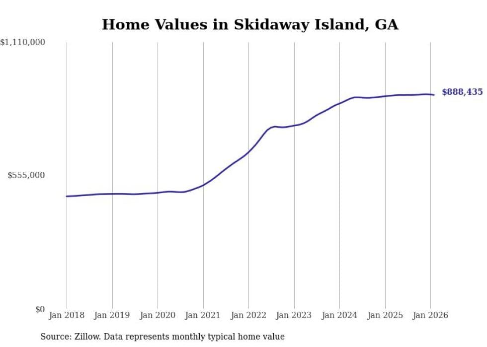 Stacker compiled a list of cities with the most expensive homes in the Savannah metro area using data from Zillow. Charts show the monthly typical home value since January 2018. All 16 cities and towns with data available were included in the list.
