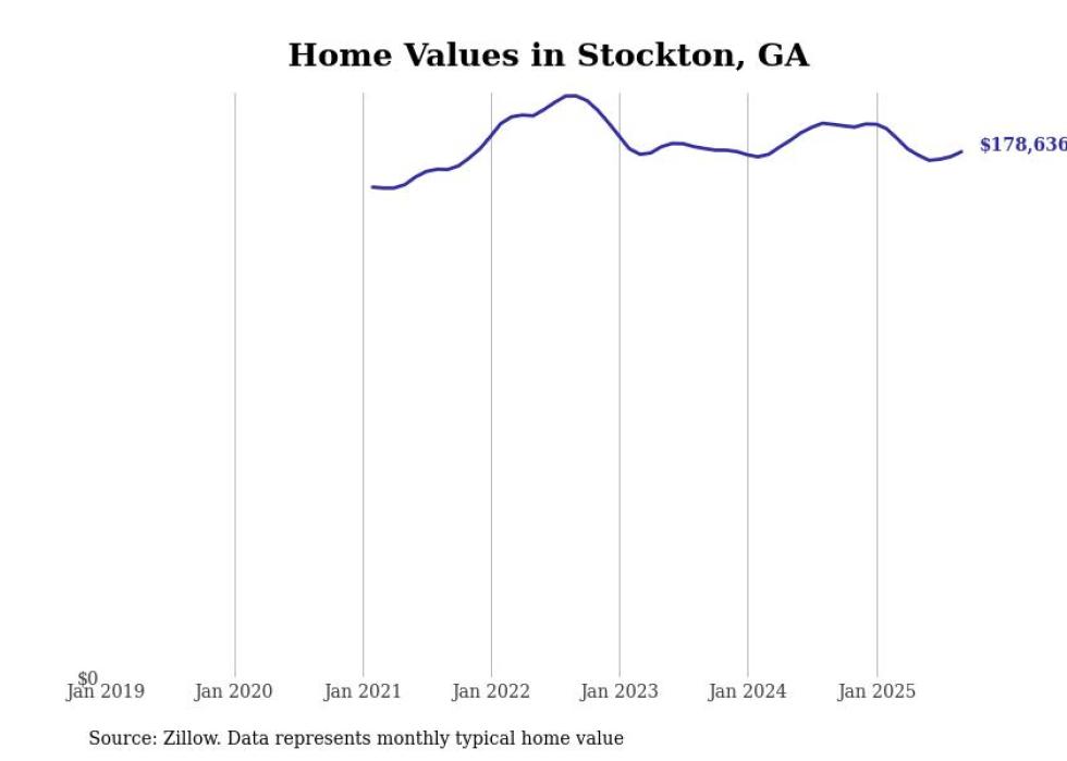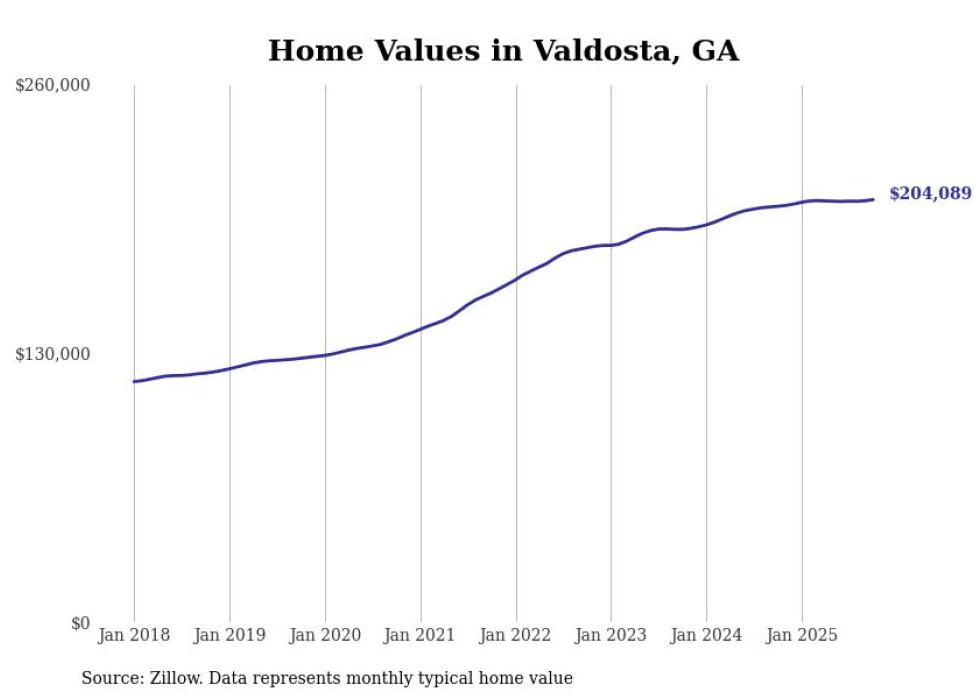 Stacker compiled a list of cities with the most expensive homes in the Valdosta, GA metro area using data from Zillow. Charts show the monthly typical home value since January 2018.