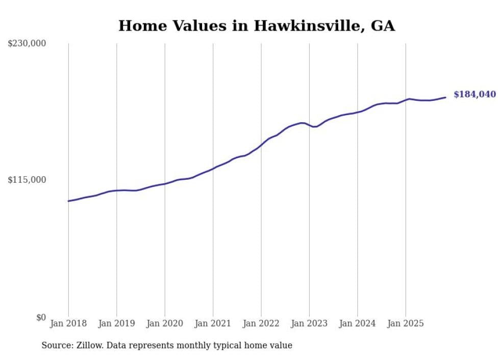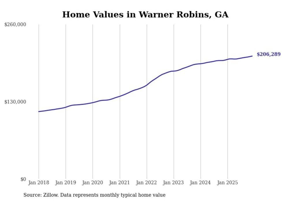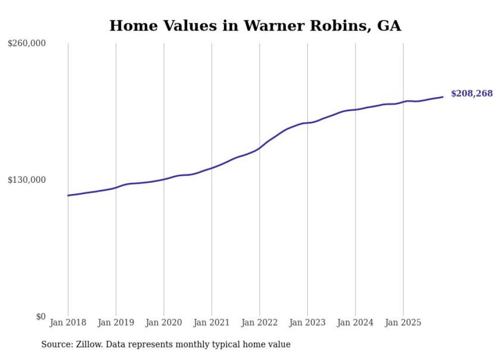 Stacker compiled a list of cities with the most expensive homes in the Warner Robins, GA metro area using data from Zillow. Charts show the monthly typical home value since January 2018.