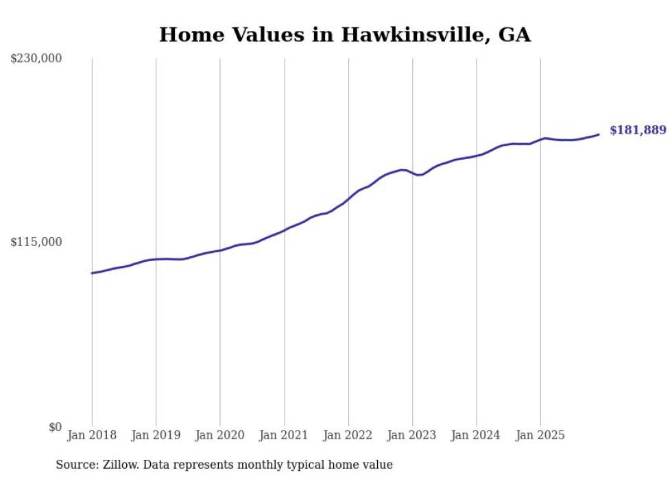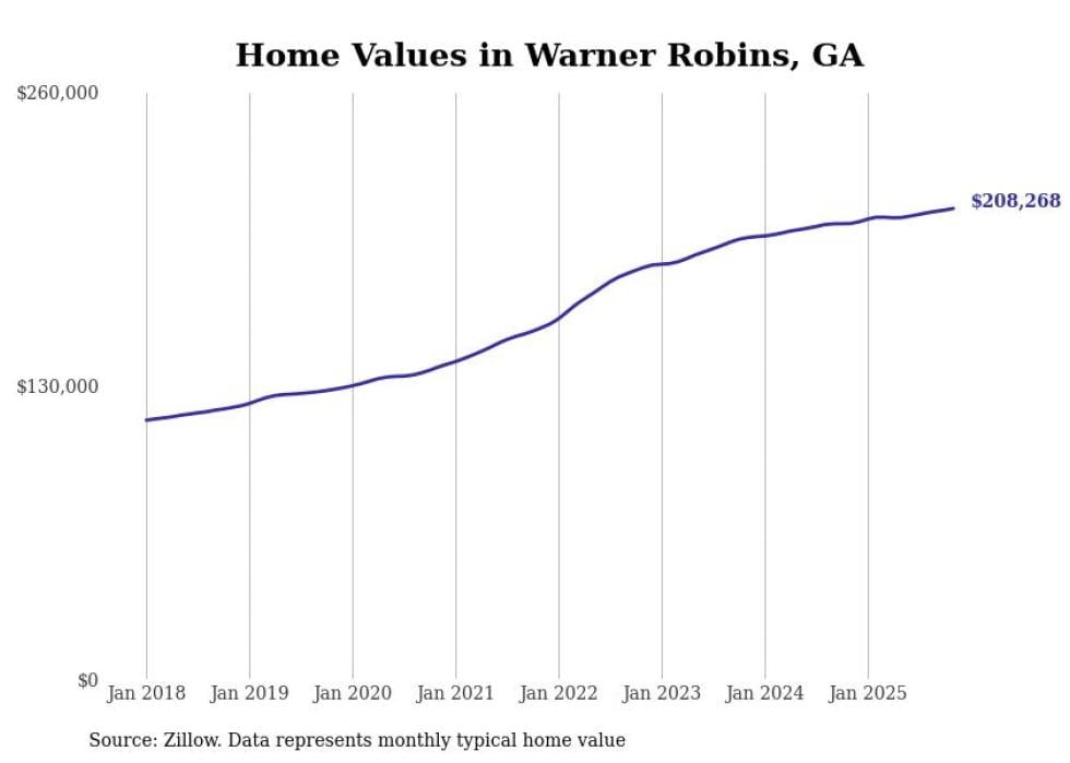 Stacker compiled a list of cities with the most expensive homes in the Warner Robins metro area using data from Zillow. Charts show the monthly typical home value since January 2018. All 9 cities and towns with data available were included in the list.
