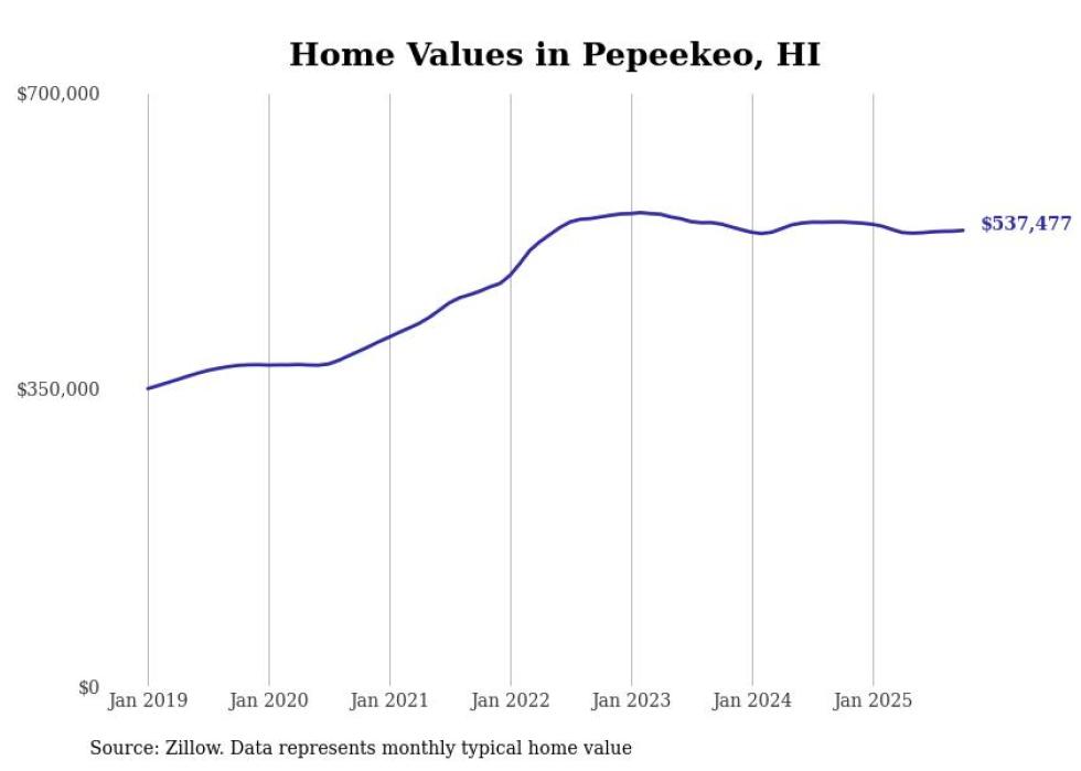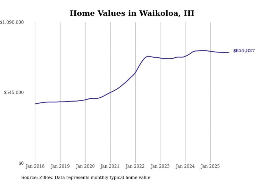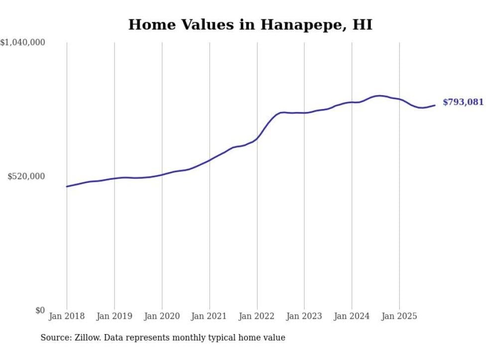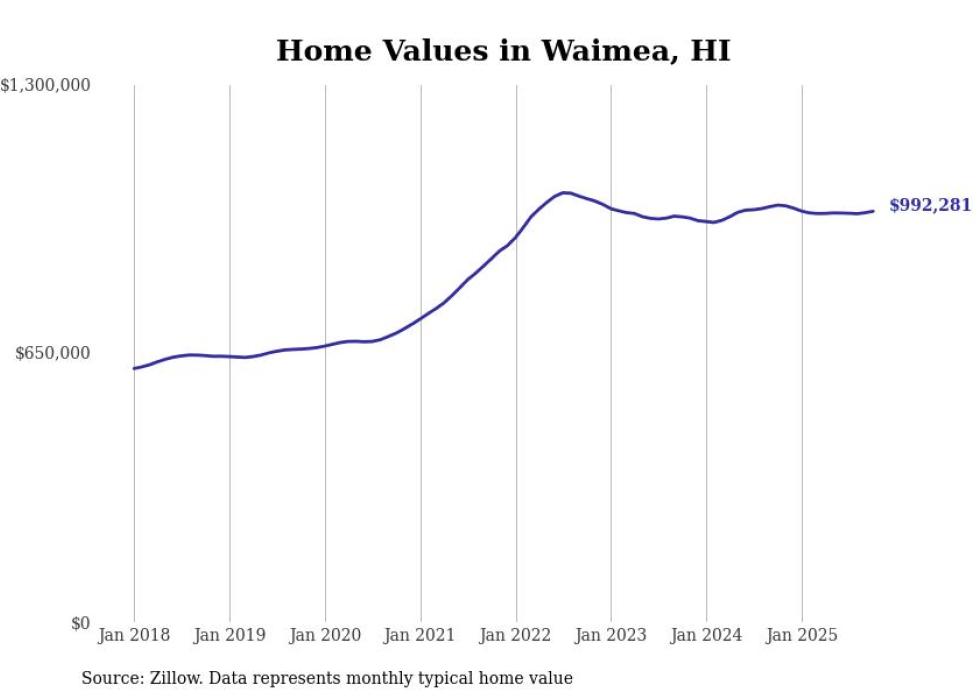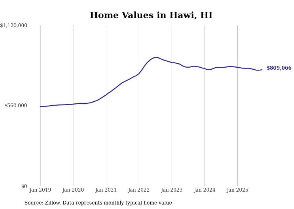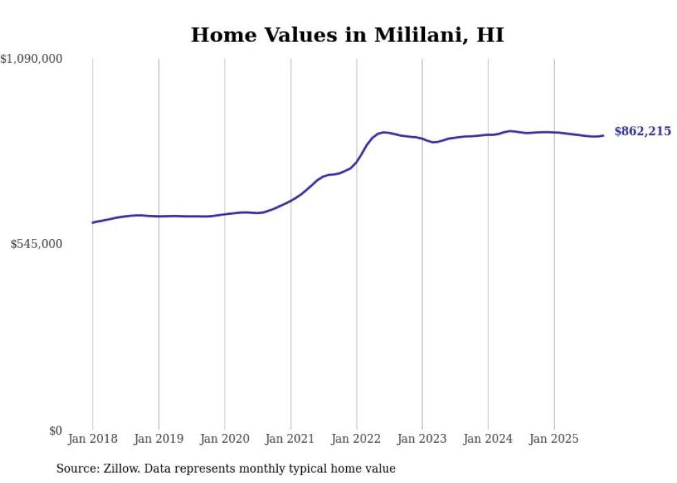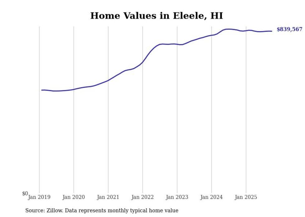 Stacker compiled a list of cities with the fastest-growing home prices in Hawaii using data from Zillow. Cities are ranked by the dollar change in the Zillow Home Values Index for all homes from the 12 months ending October 2025. The charts in this story were created automatically using Matplotlib. Data was available for 50 cities and towns in Hawaii.