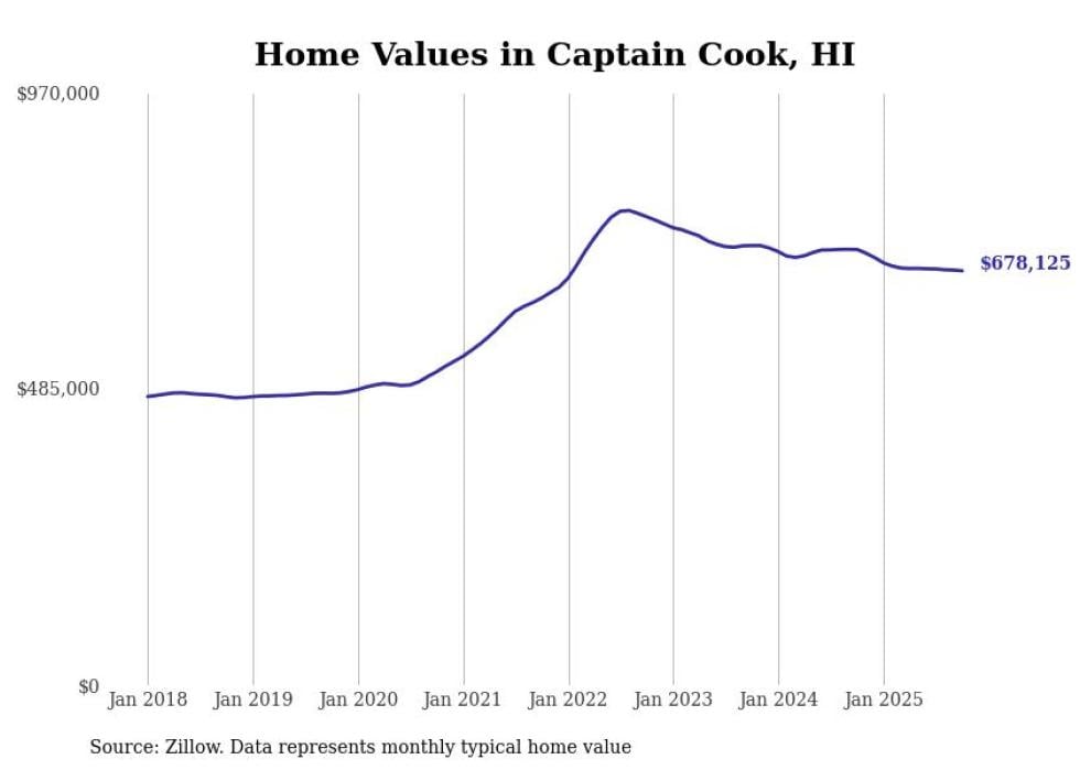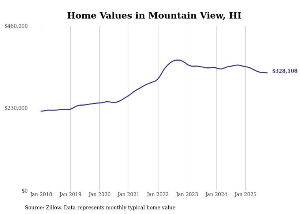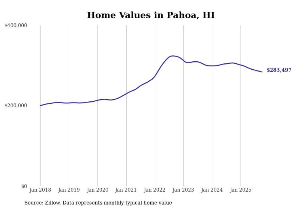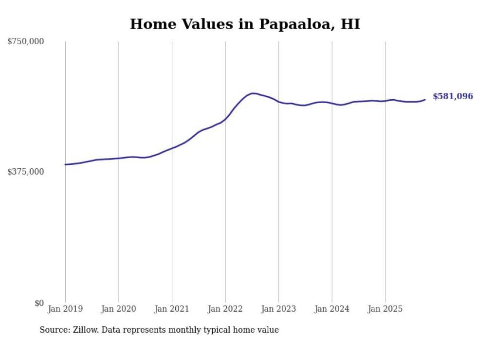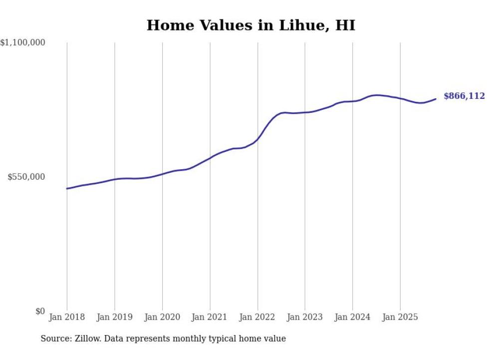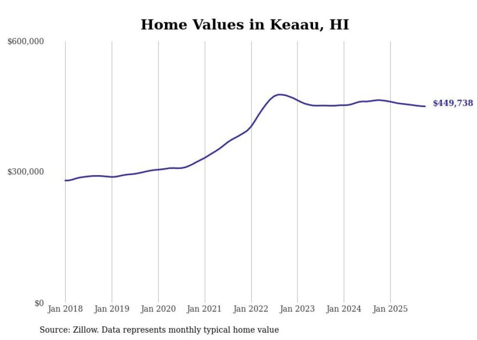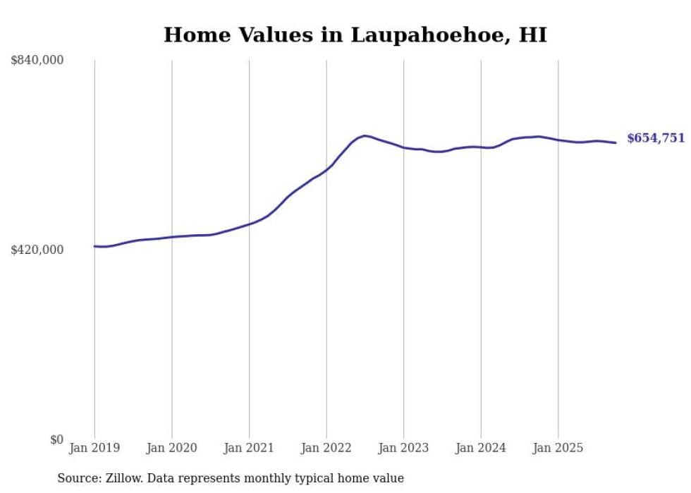 Stacker compiled a list of cities with the fastest-growing home prices in Hawaii using data from Zillow. Cities are ranked by the dollar change in the Zillow Home Values Index for all homes from the 12 months ending October 2025. The charts in this story were created automatically using Matplotlib. Data was available for 50 cities and towns in Hawaii.