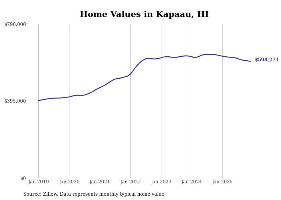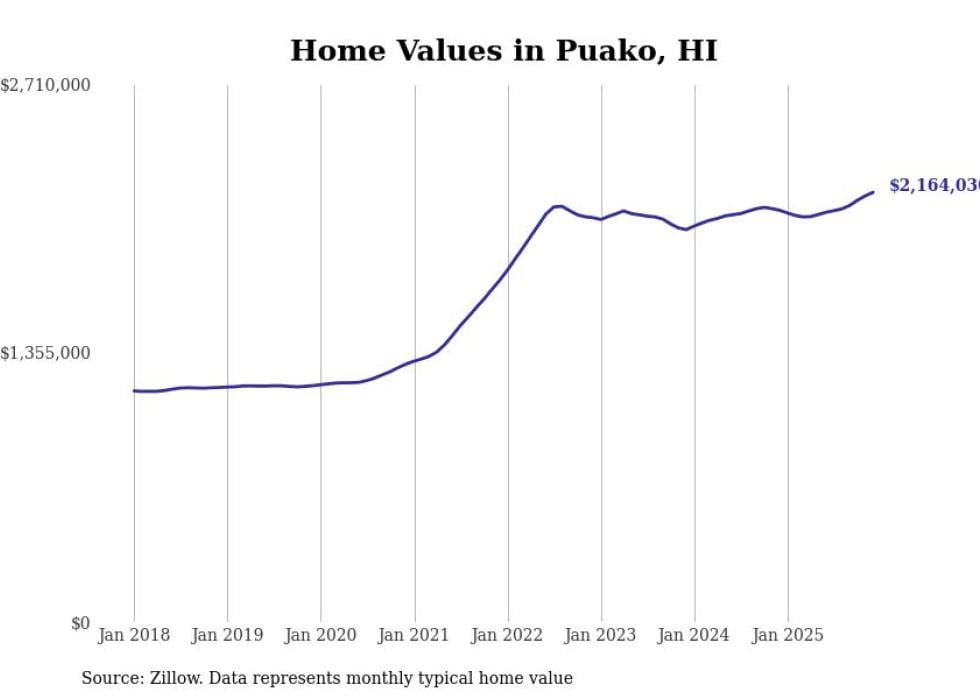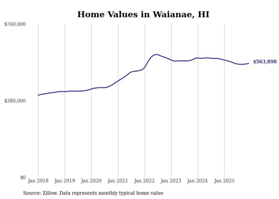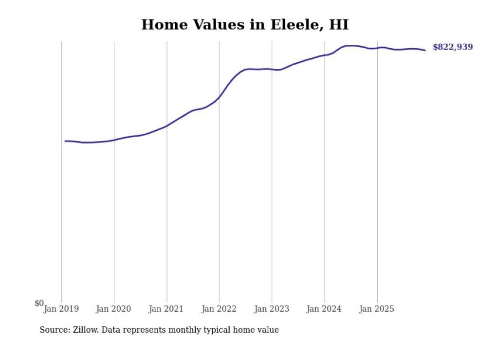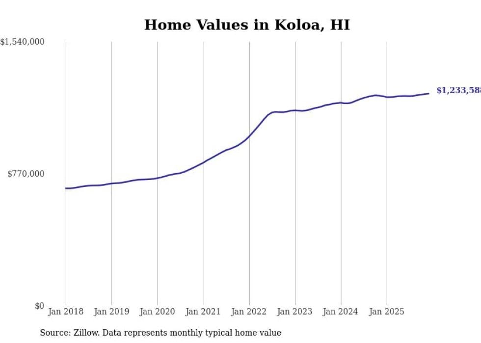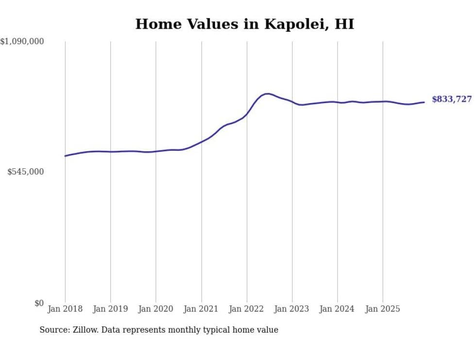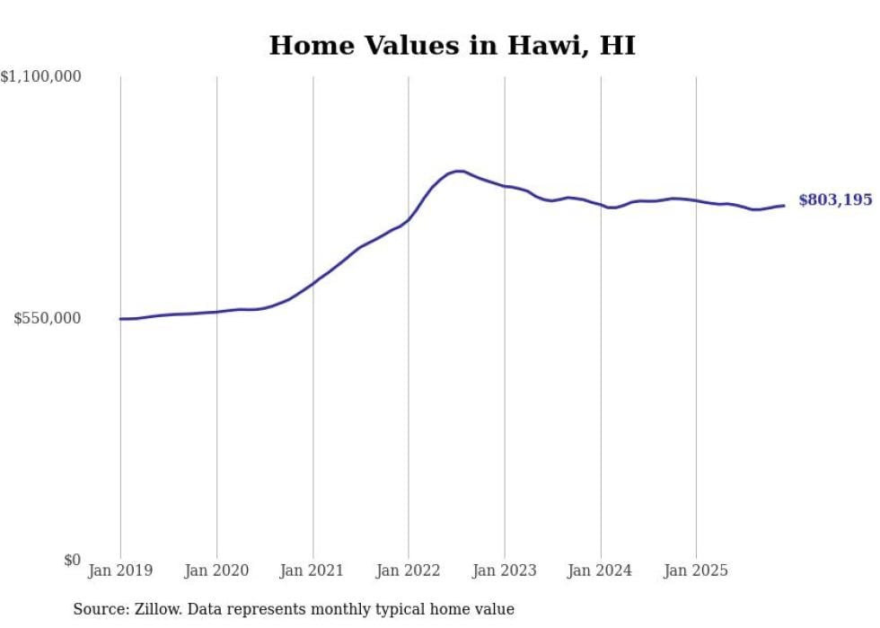 Stacker compiled a list of cities with the fastest-growing home prices in Hawaii using data from Zillow. Cities are ranked by the dollar change in the Zillow Home Values Index for all homes from the 12 months ending December 2025. The charts in this story were created automatically using Matplotlib. Data was available for 50 cities and towns in Hawaii.