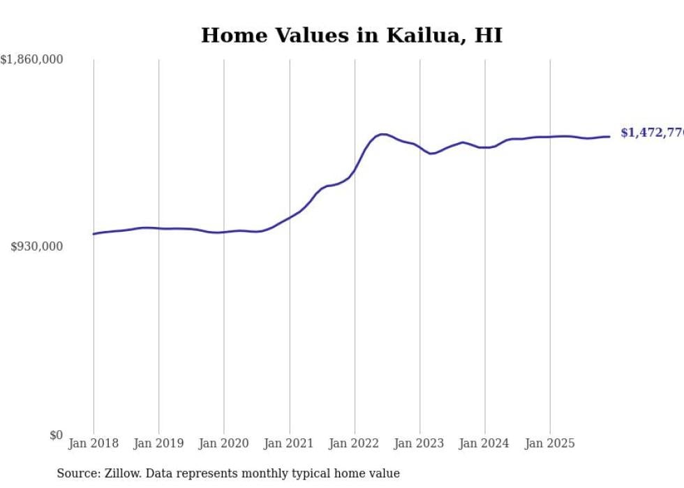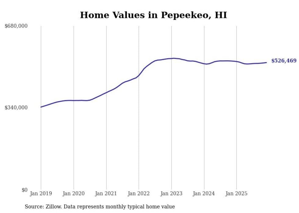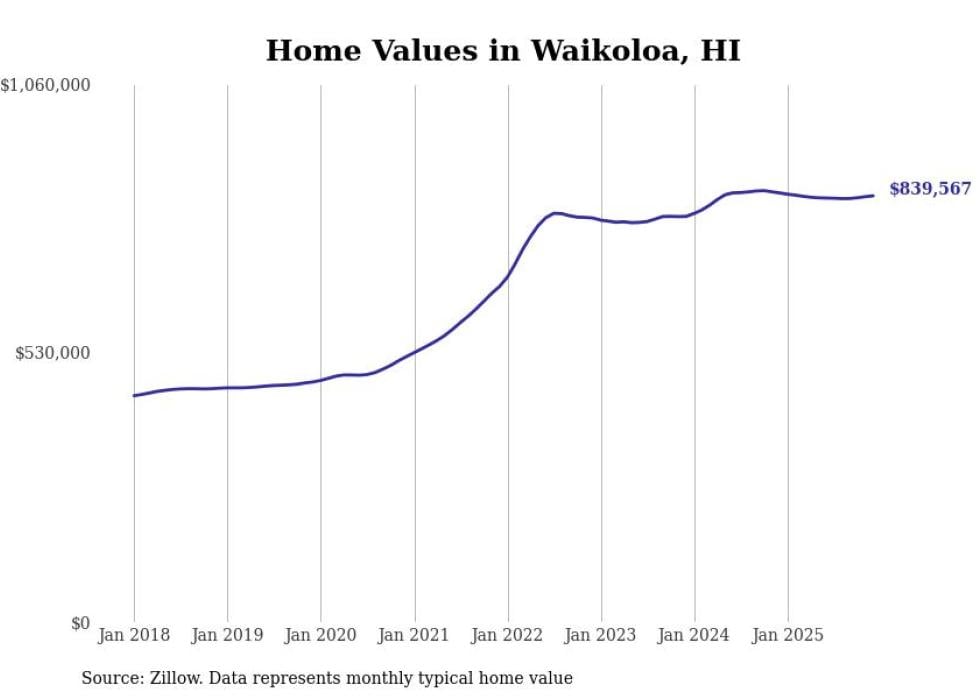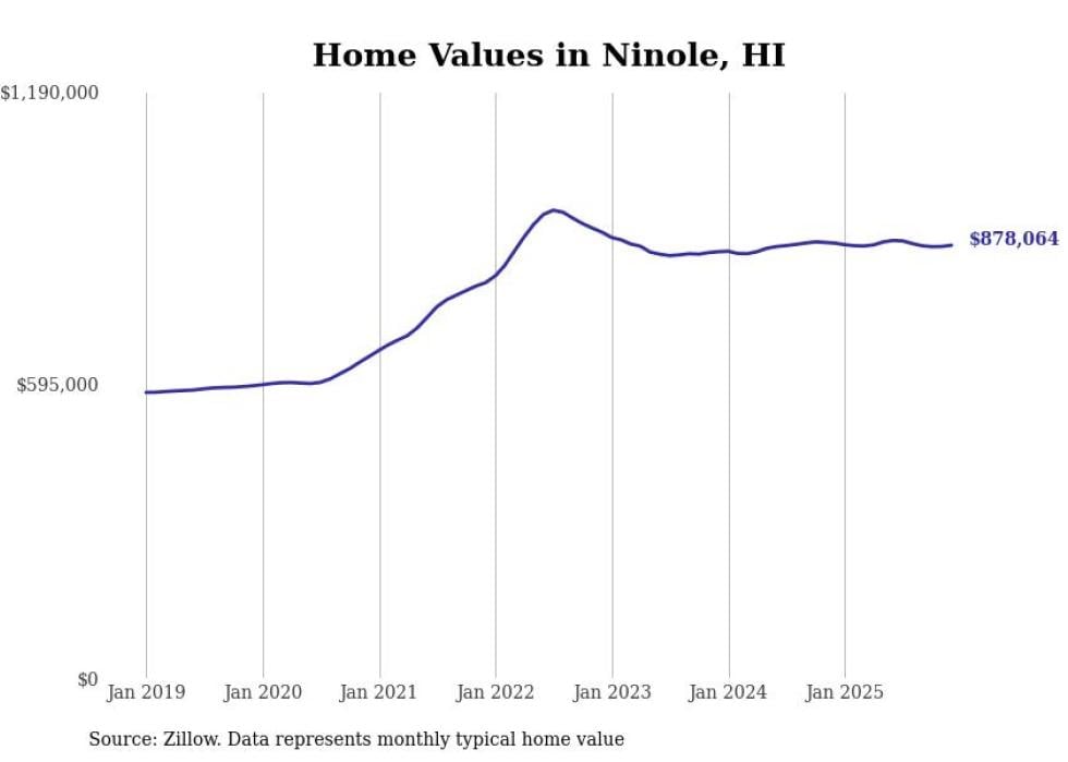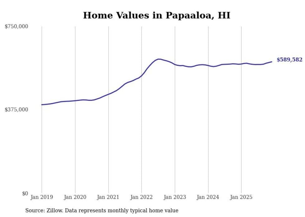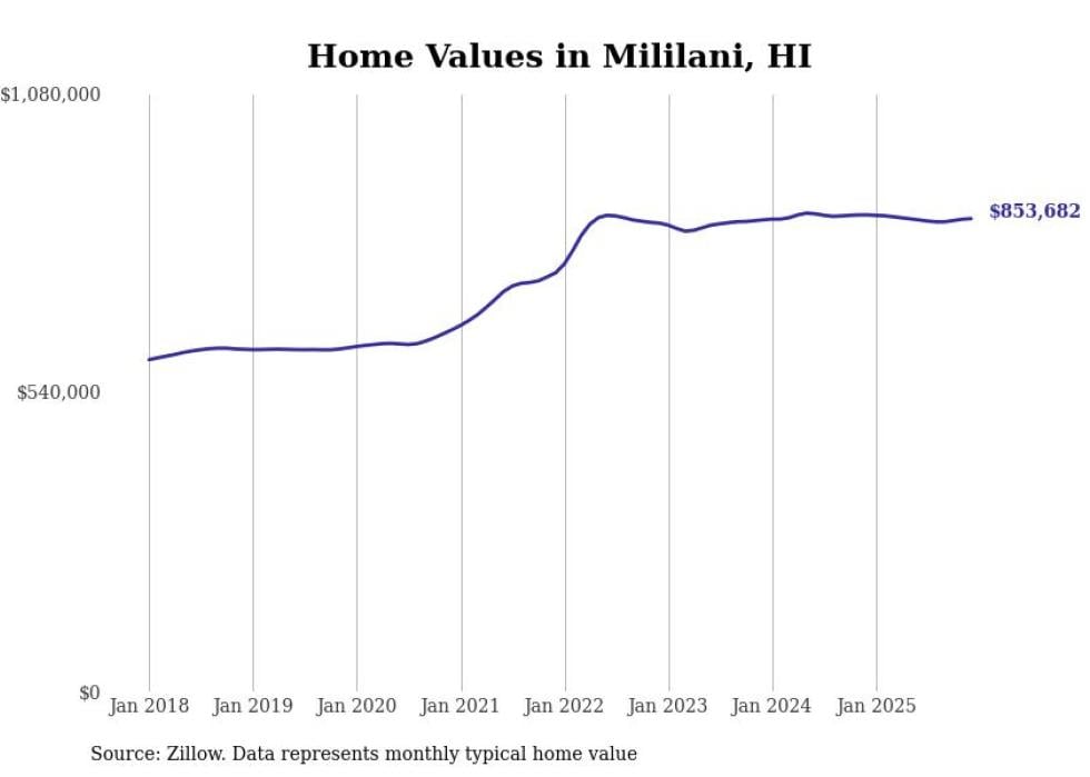 Stacker compiled a list of cities with the fastest-growing home prices in Hawaii using data from Zillow. Cities are ranked by the dollar change in the Zillow Home Values Index for all homes from the 12 months ending December 2025. The charts in this story were created automatically using Matplotlib. Data was available for 50 cities and towns in Hawaii.