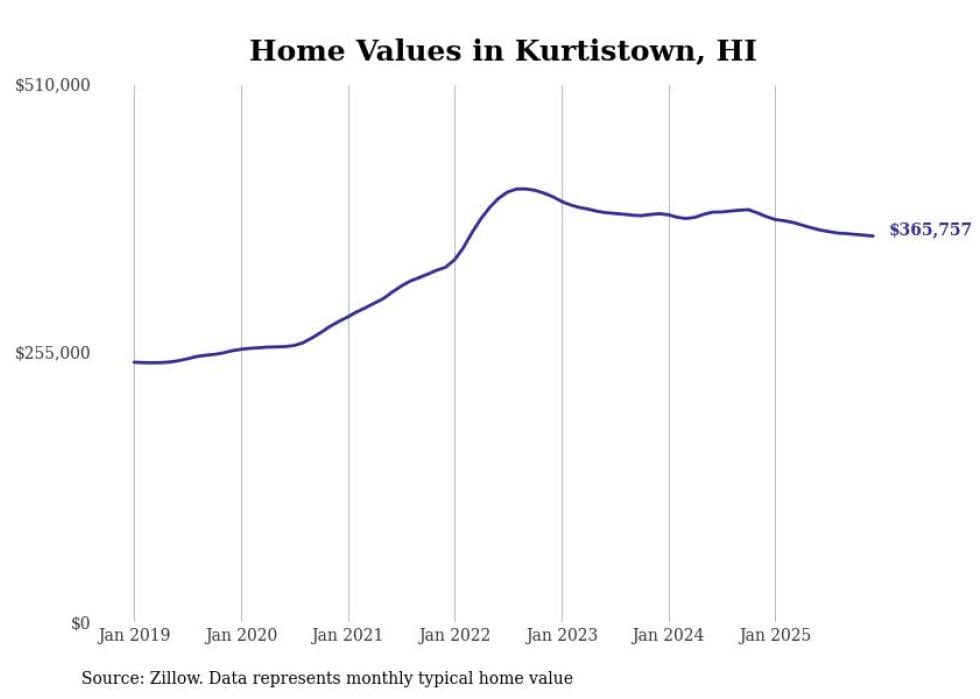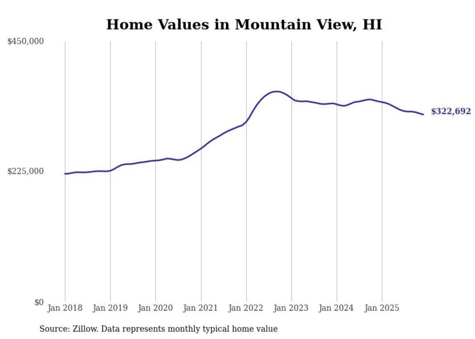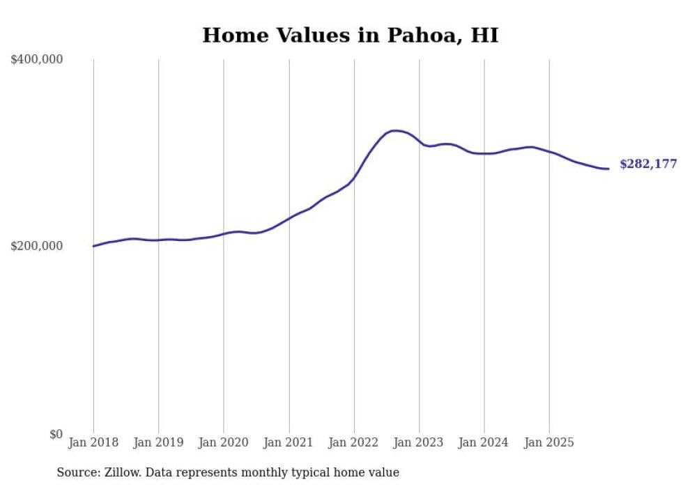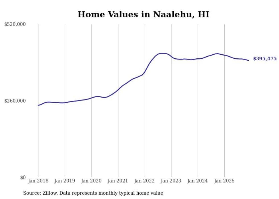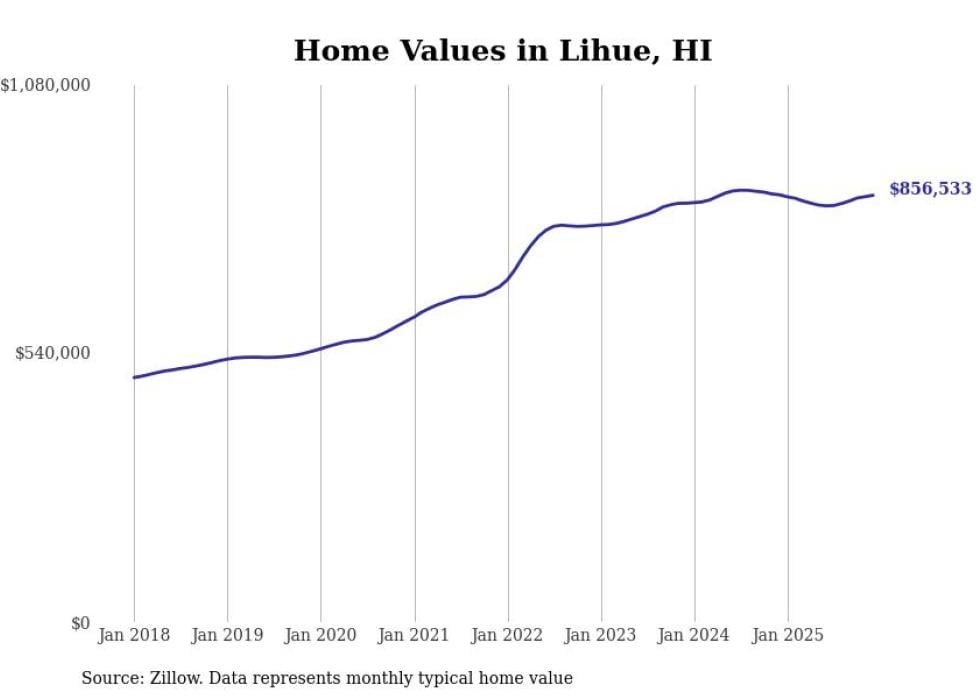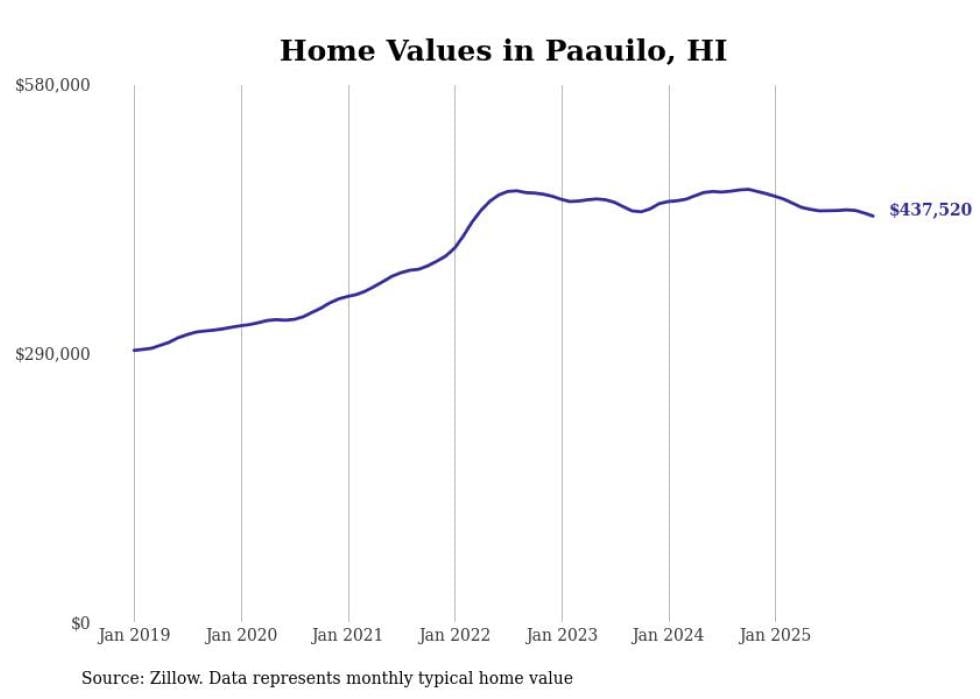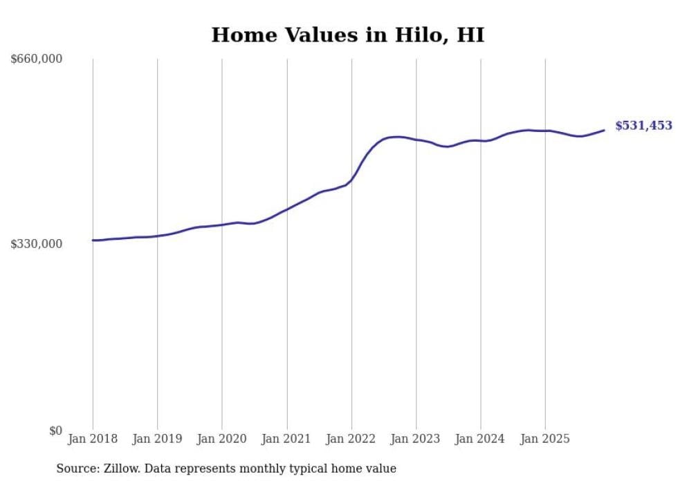 Stacker compiled a list of cities with the fastest-growing home prices in Hawaii using data from Zillow. Cities are ranked by the dollar change in the Zillow Home Values Index for all homes from the 12 months ending December 2025. The charts in this story were created automatically using Matplotlib. Data was available for 50 cities and towns in Hawaii.