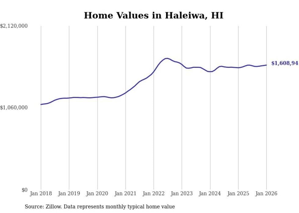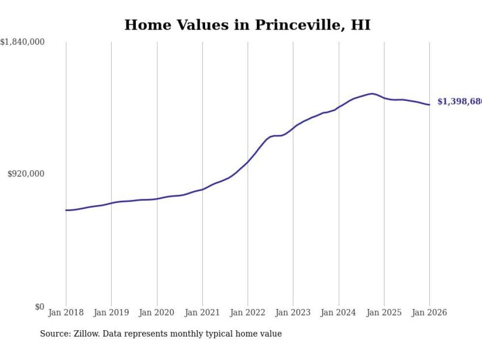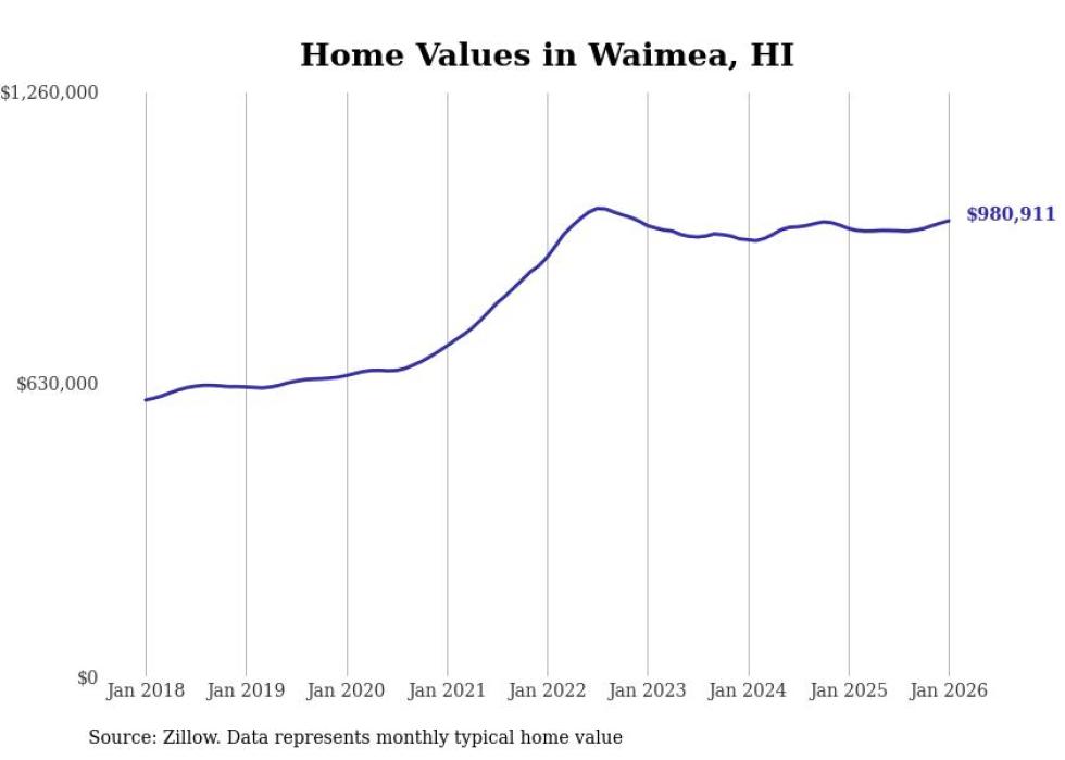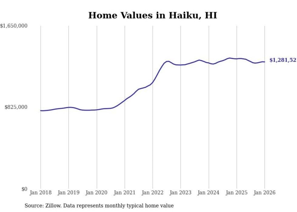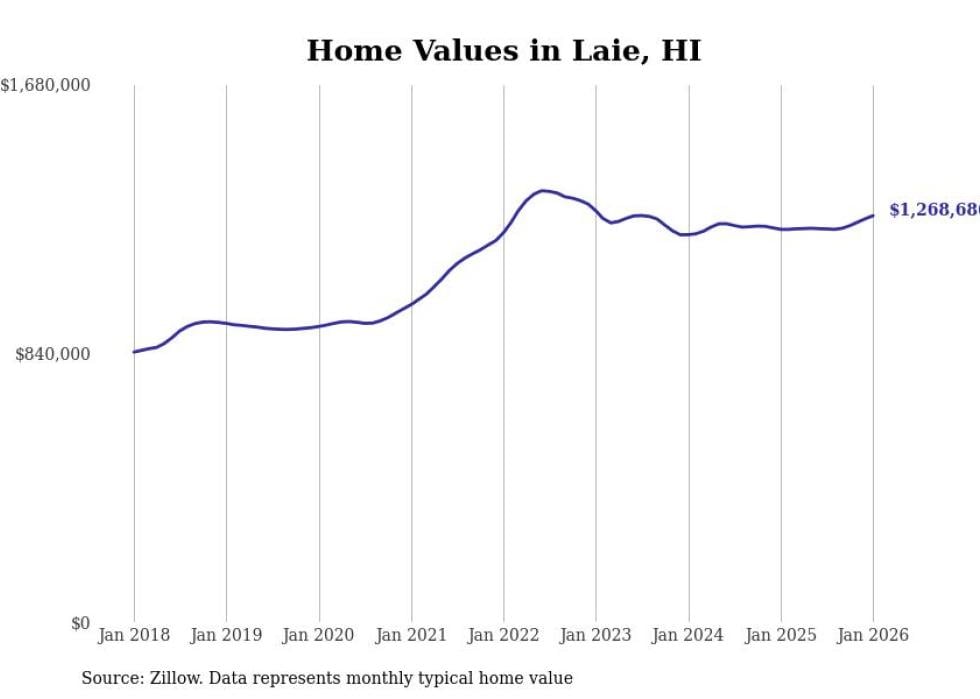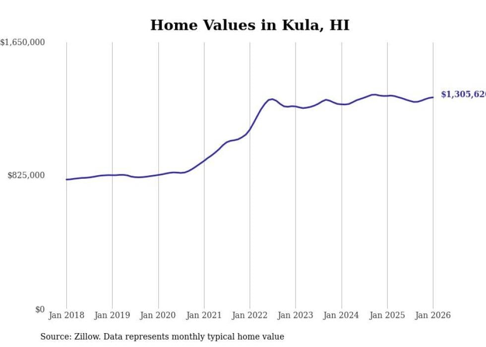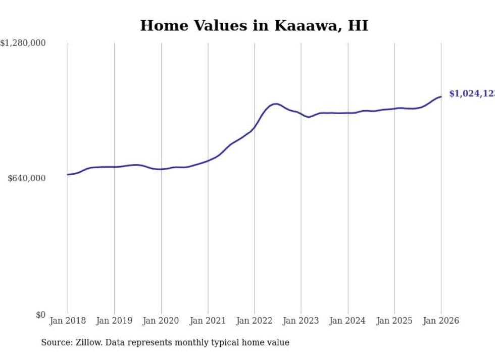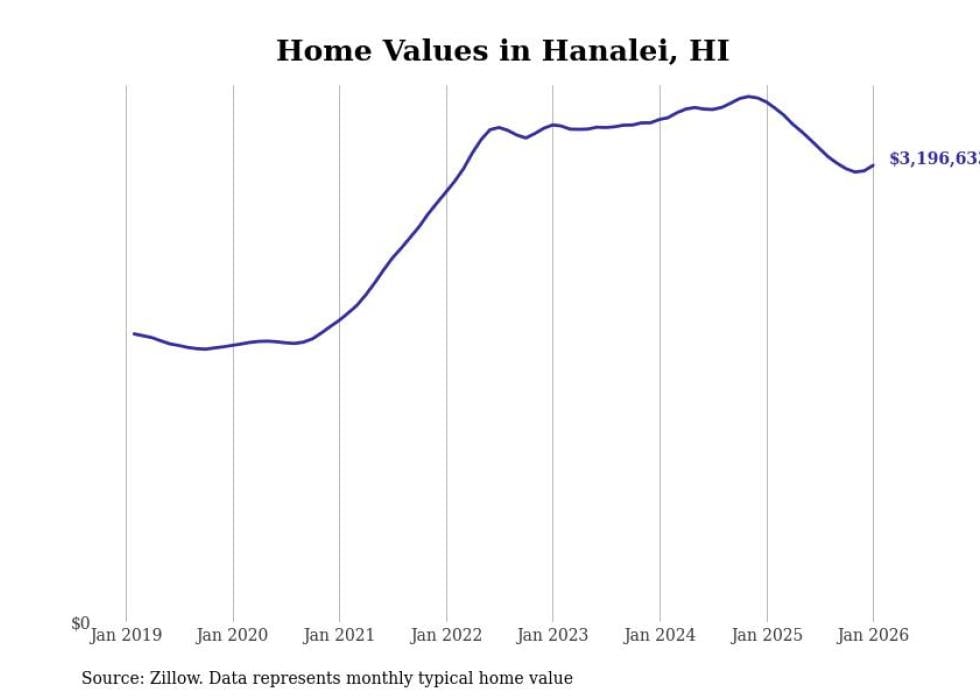 Stacker compiled a list of cities with the most expensive homes in Hawaii using data from Zillow. Cities are ranked by the Zillow Home Values Index for all homes as of January 2026. The charts in this story were created automatically using Matplotlib.