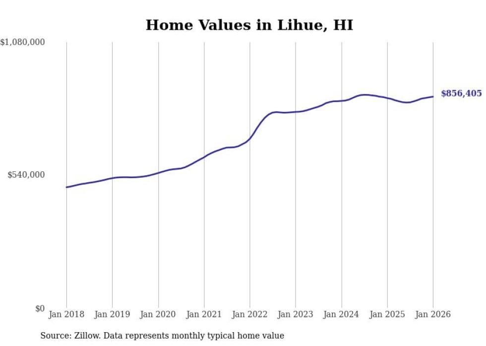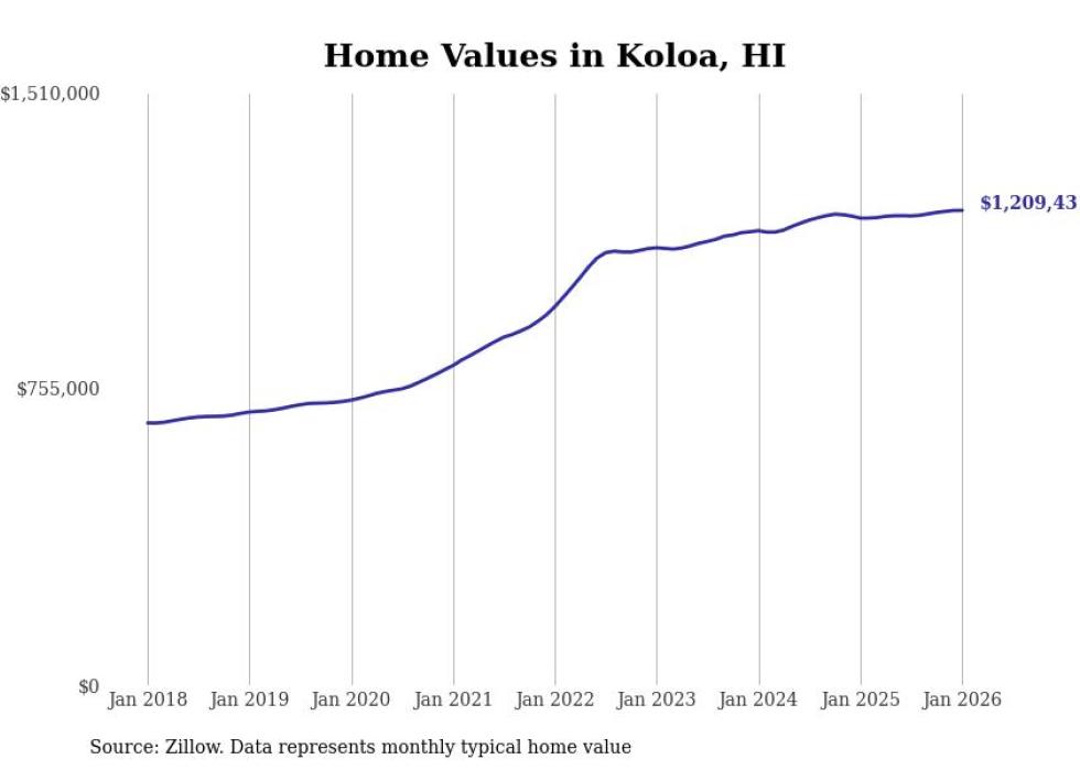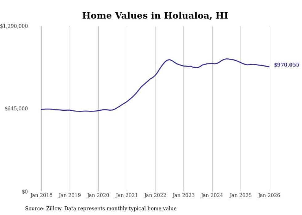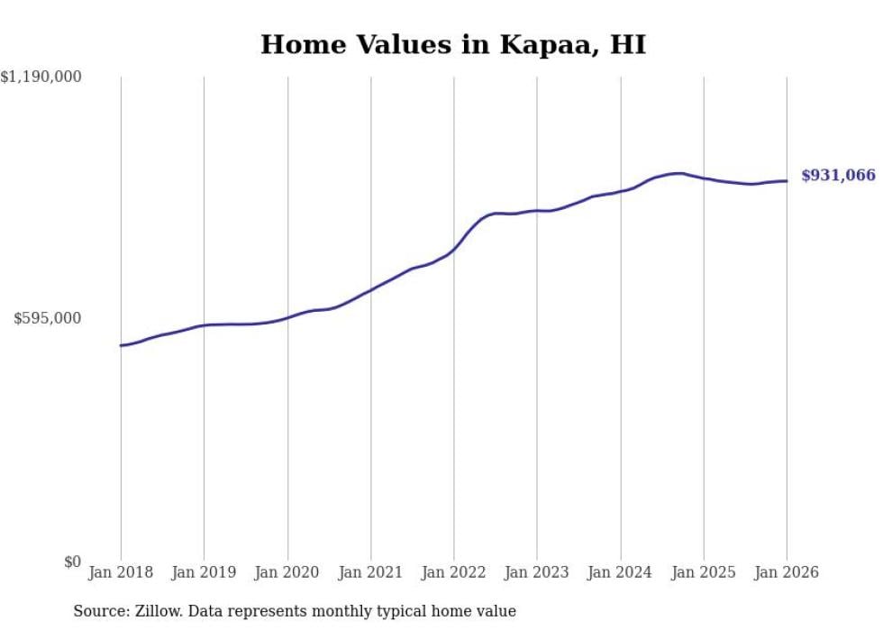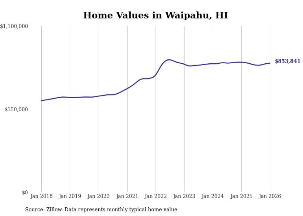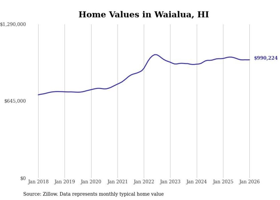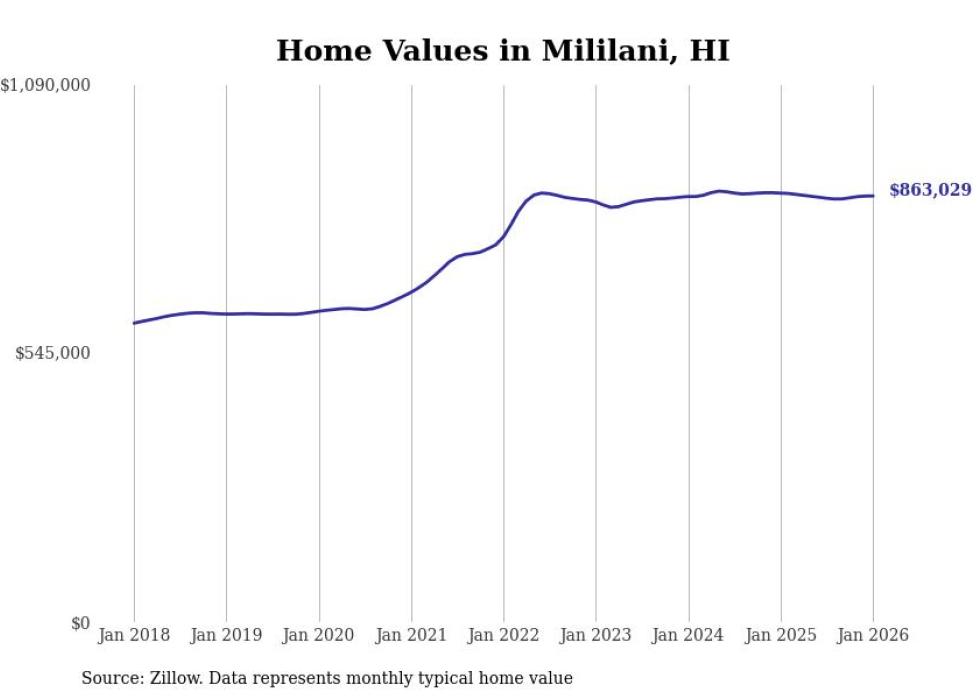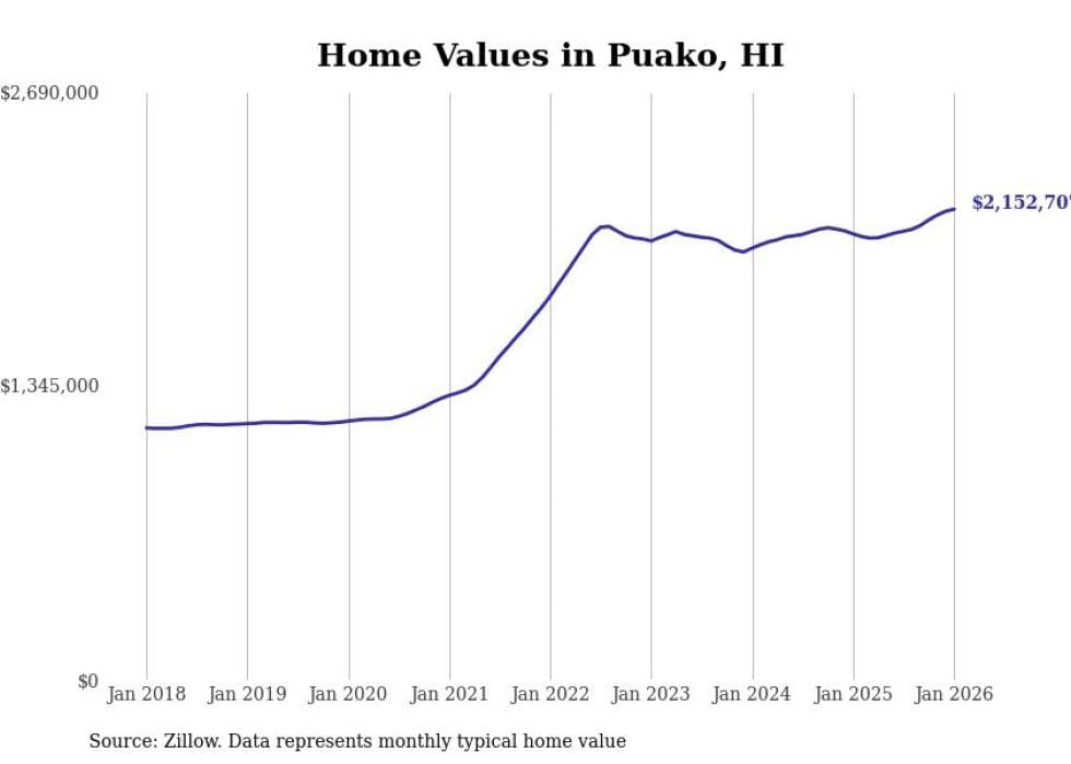 Stacker compiled a list of cities with the most expensive homes in Hawaii using data from Zillow. Cities are ranked by the Zillow Home Values Index for all homes as of January 2026. The charts in this story were created automatically using Matplotlib.
