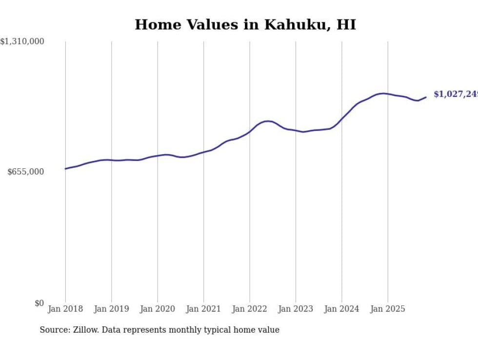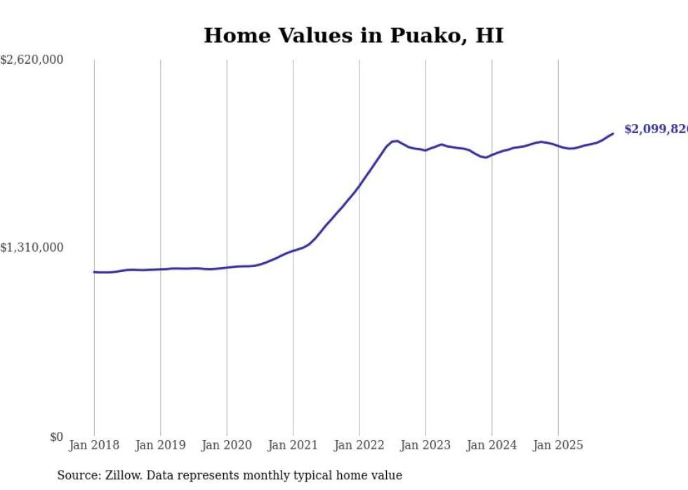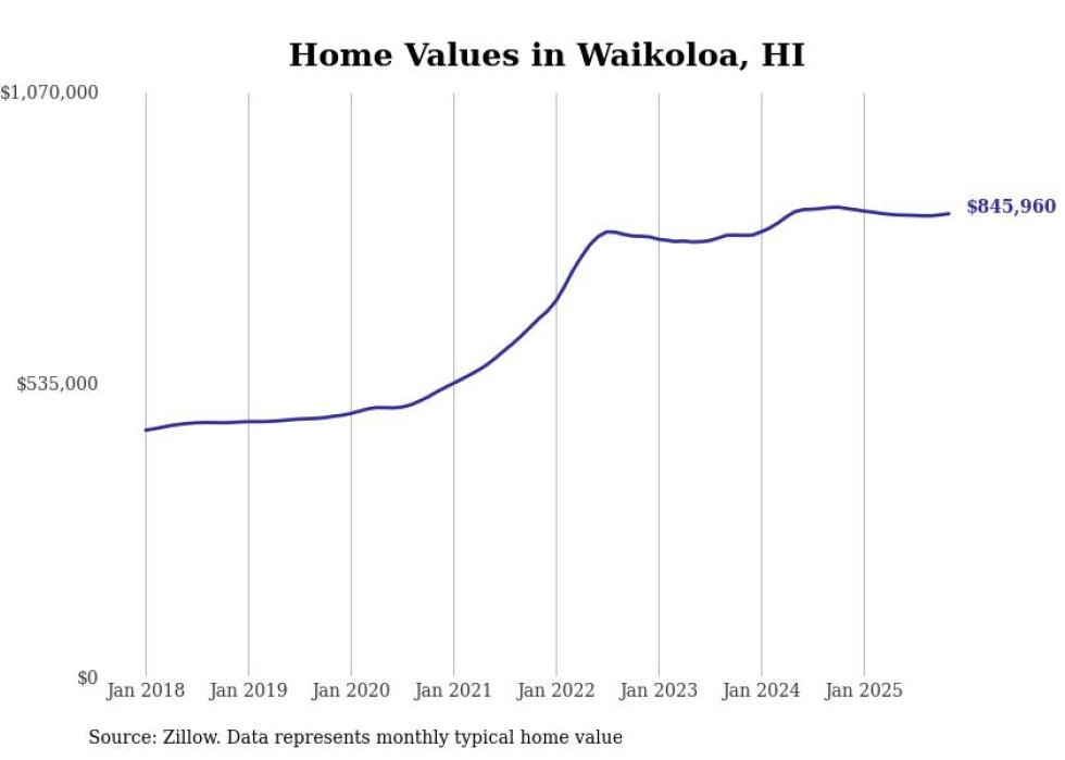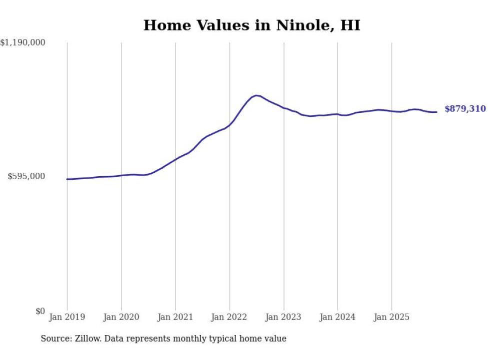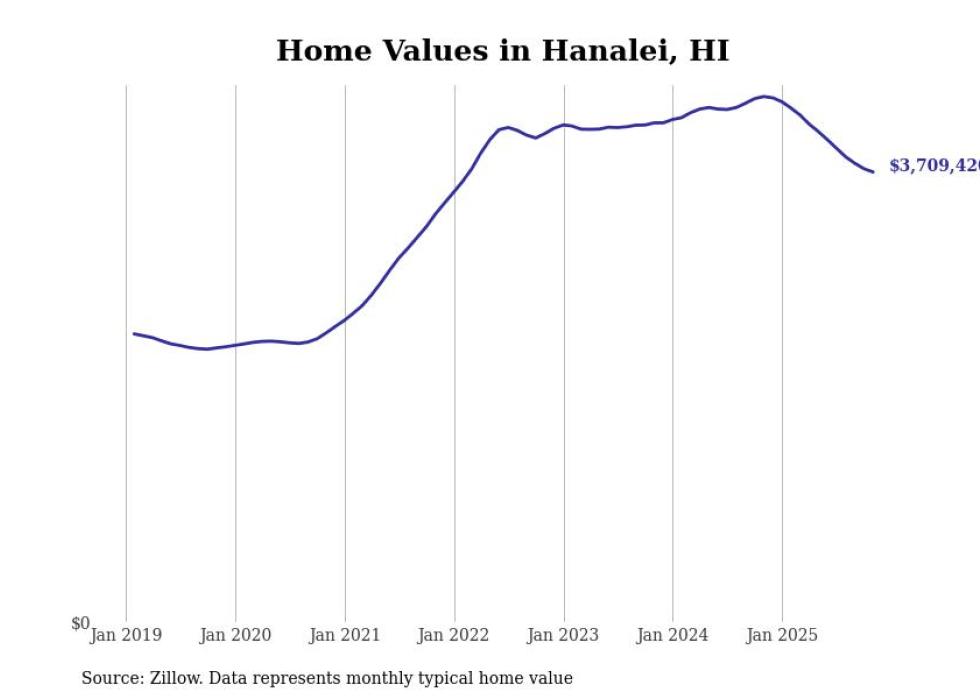Stacker compiled a list of cities with the most expensive homes in Hawaii using data from Zillow. Cities are ranked by the Zillow Home Values Index for all homes as of November 2025. The charts in this story were created automatically using Matplotlib.