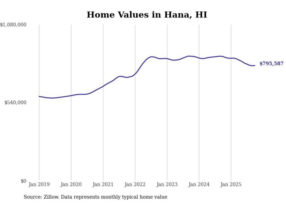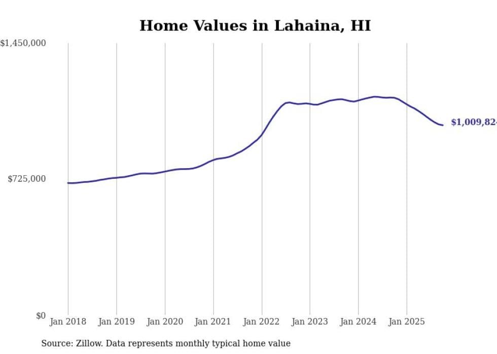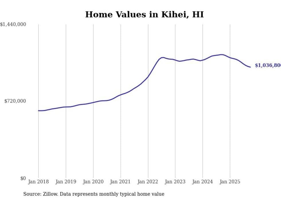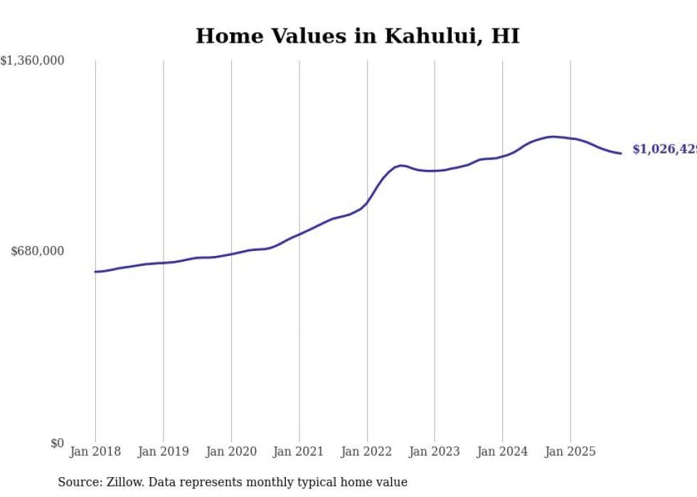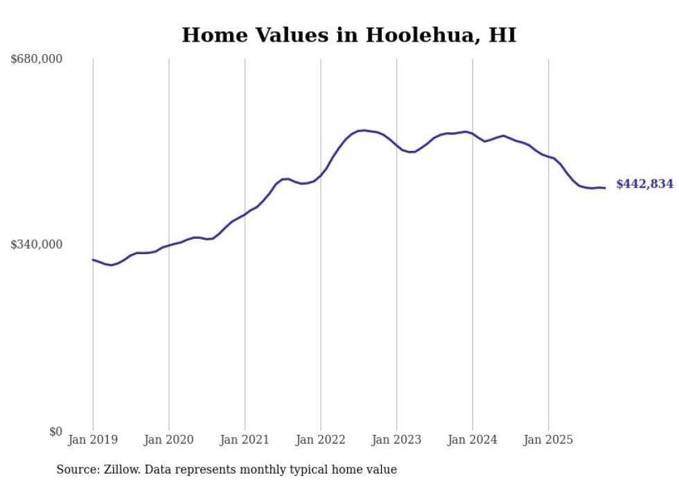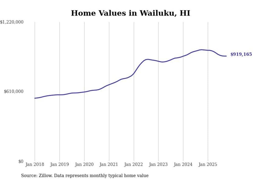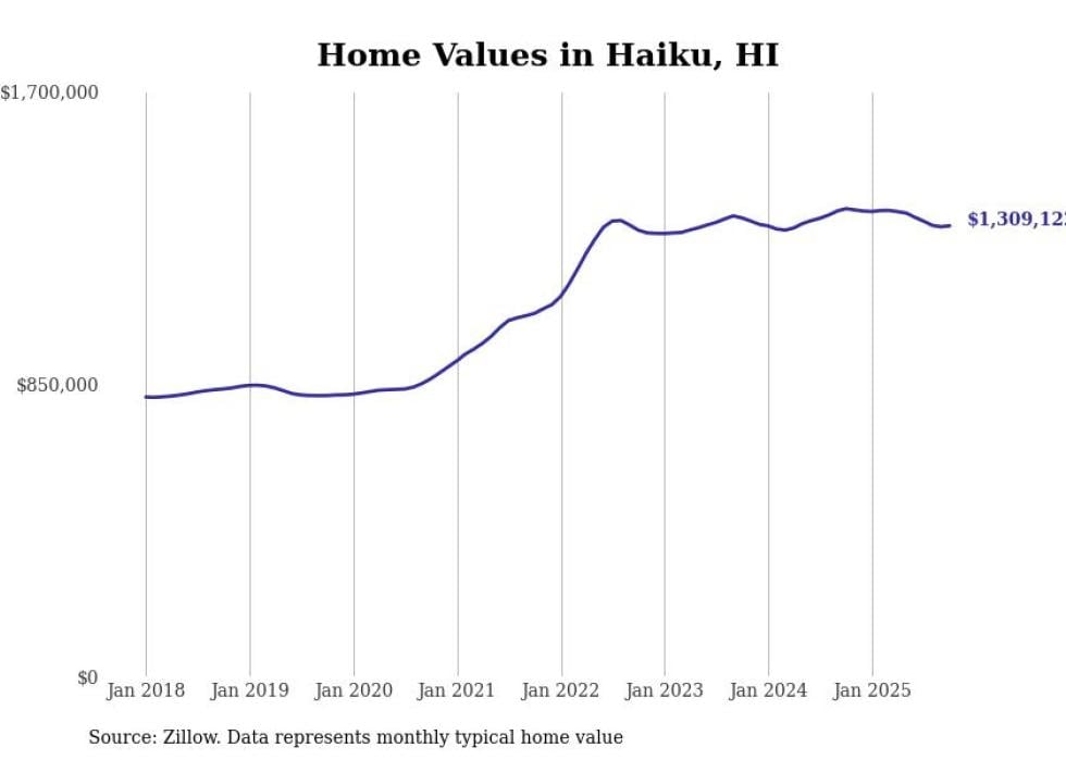 Stacker compiled a list of cities with the most expensive homes in the Kahului-Wailuku-Lahaina, HI metro area using data from Zillow. Charts show the monthly typical home value since January 2018.
