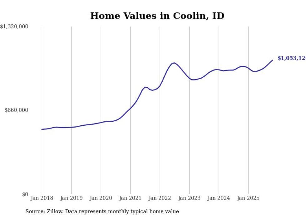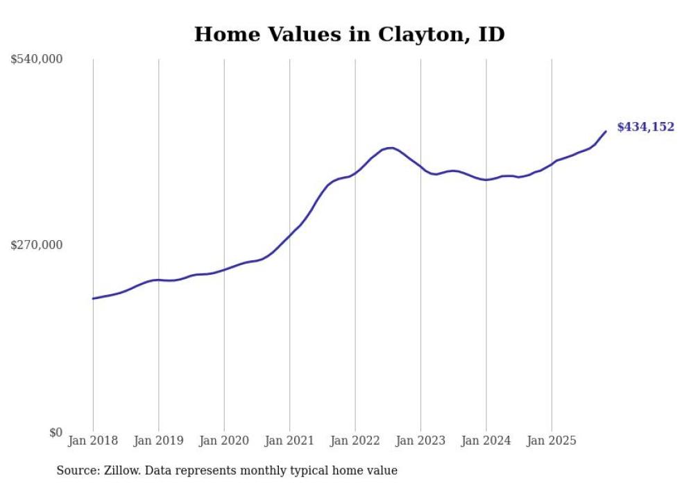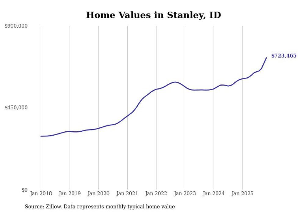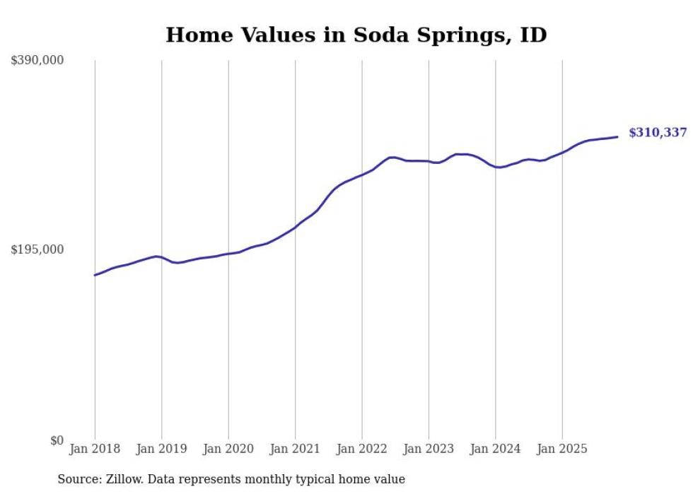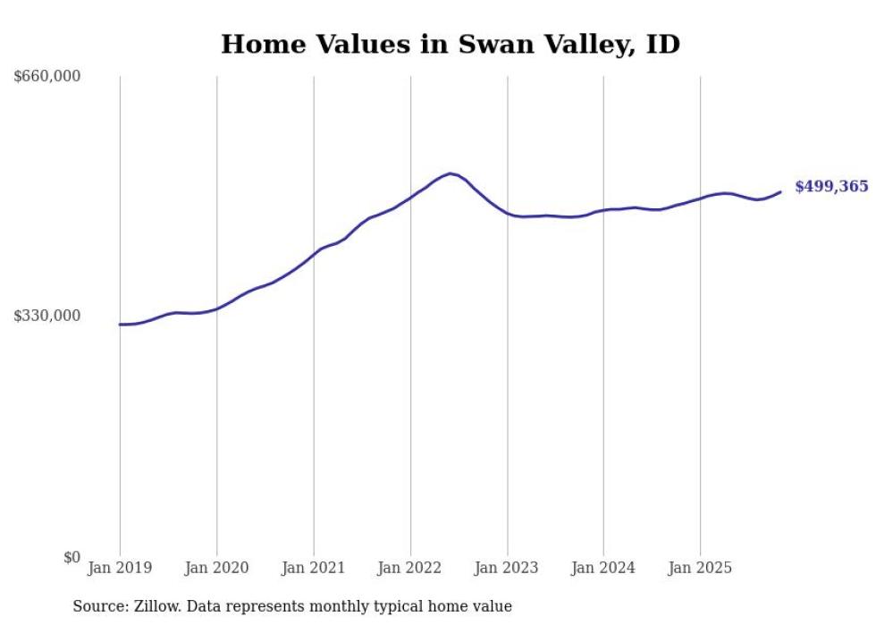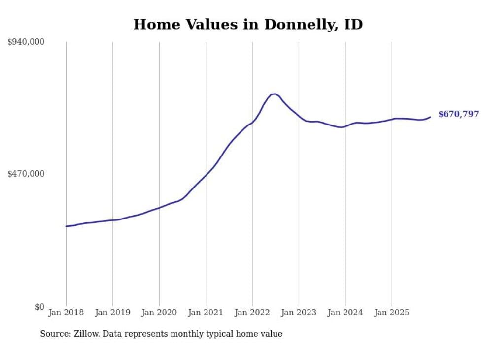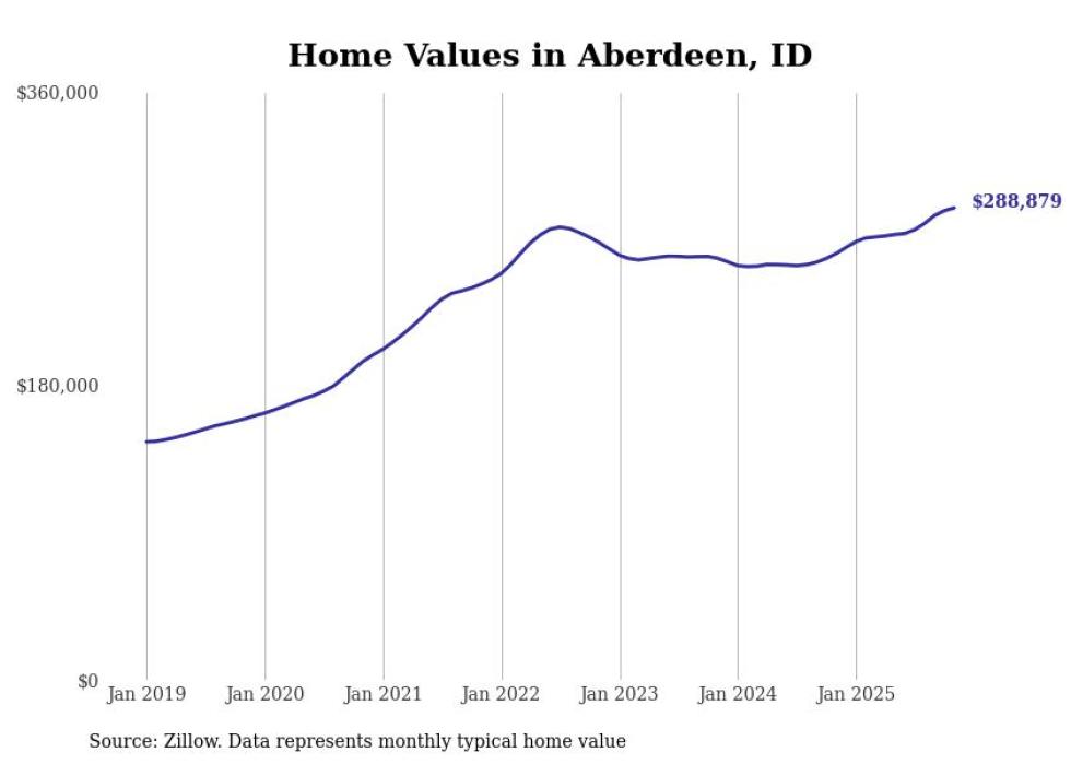 Stacker compiled a list of cities with the fastest-growing home prices in Idaho using data from Zillow. Cities are ranked by the dollar change in the Zillow Home Values Index for all homes from the 12 months ending November 2025. The charts in this story were created automatically using Matplotlib. Data was available for 50 cities and towns in Idaho.