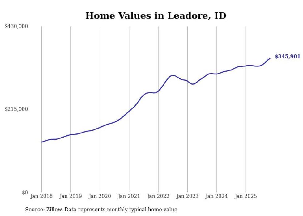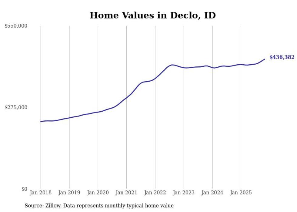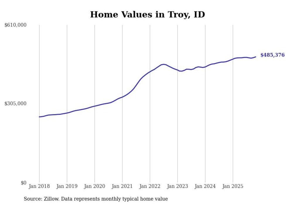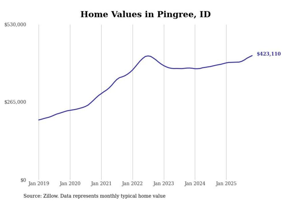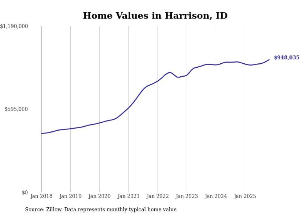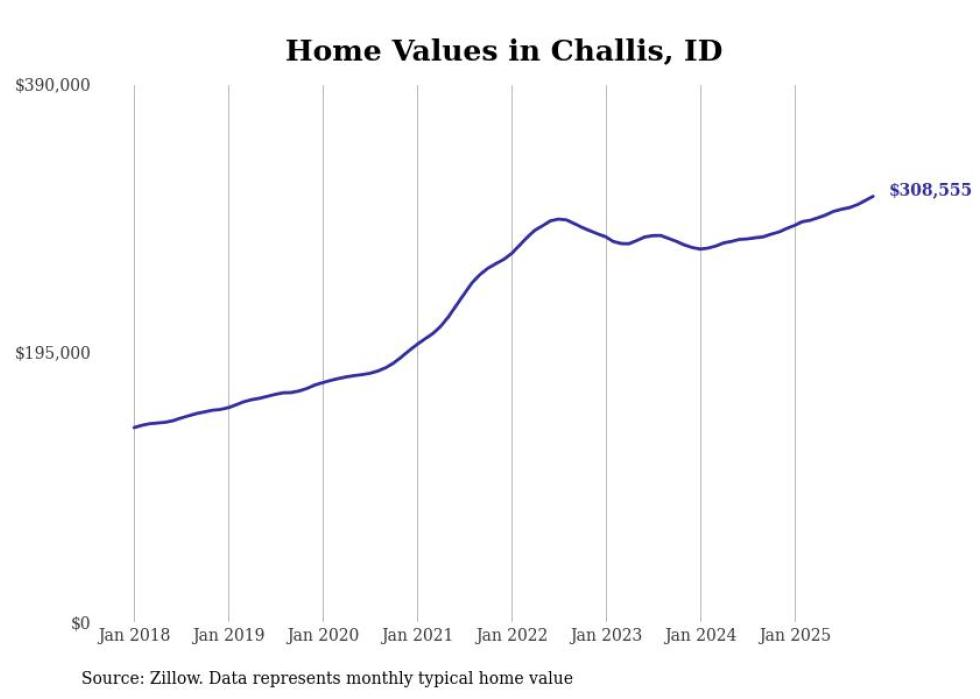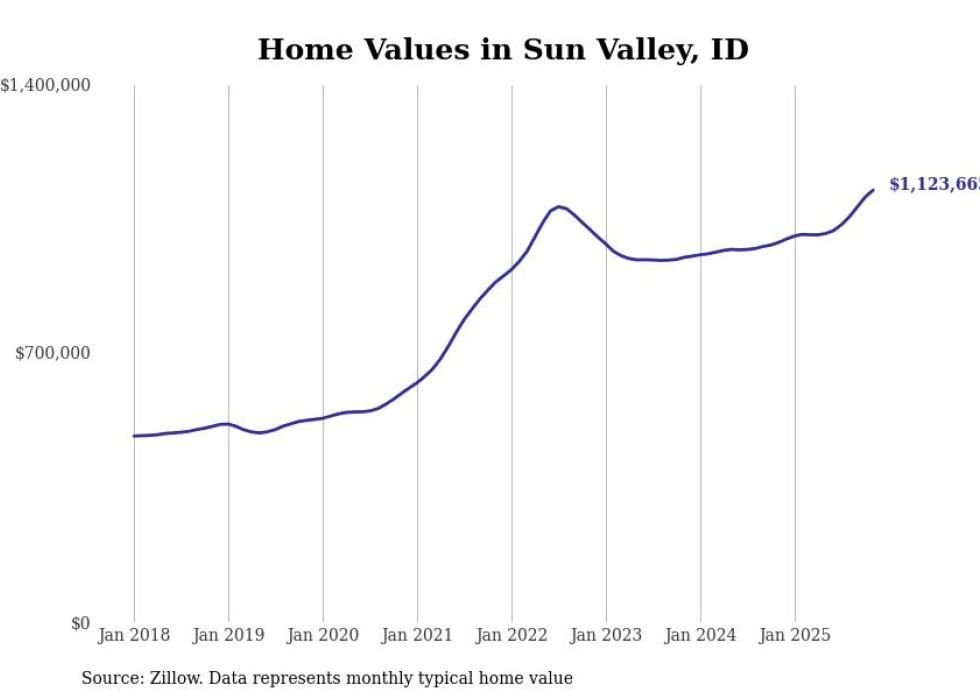 Stacker compiled a list of cities with the fastest-growing home prices in Idaho using data from Zillow. Cities are ranked by the dollar change in the Zillow Home Values Index for all homes from the 12 months ending November 2025. The charts in this story were created automatically using Matplotlib. Data was available for 50 cities and towns in Idaho.