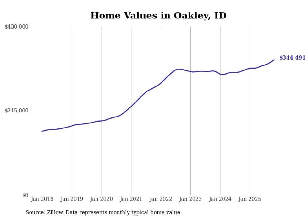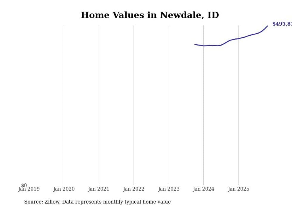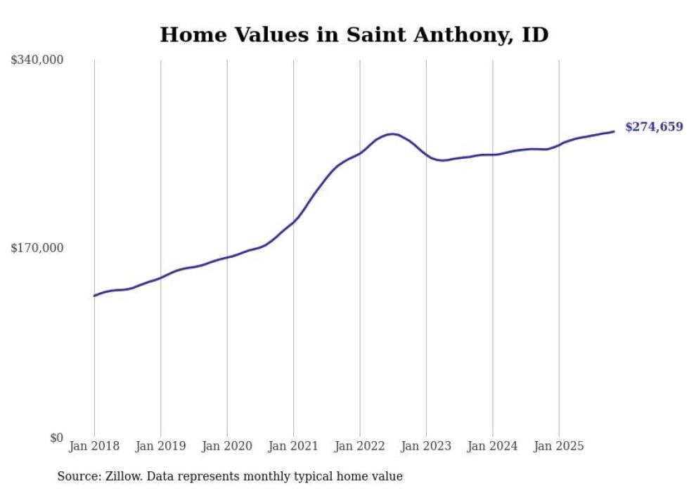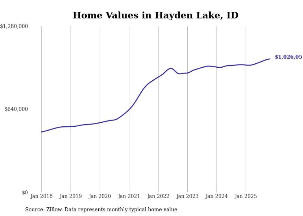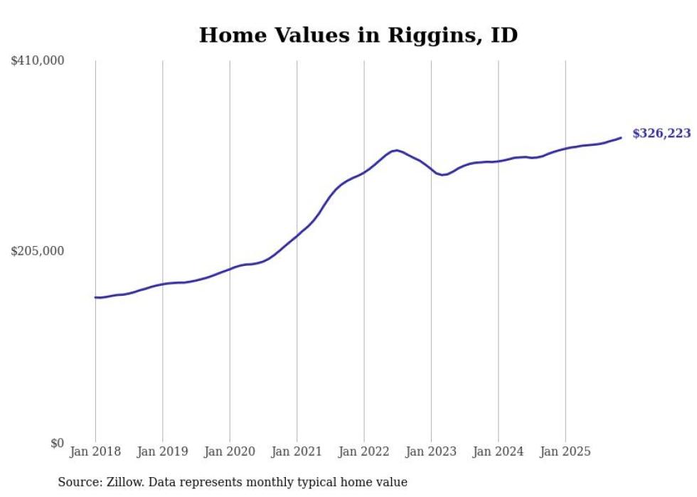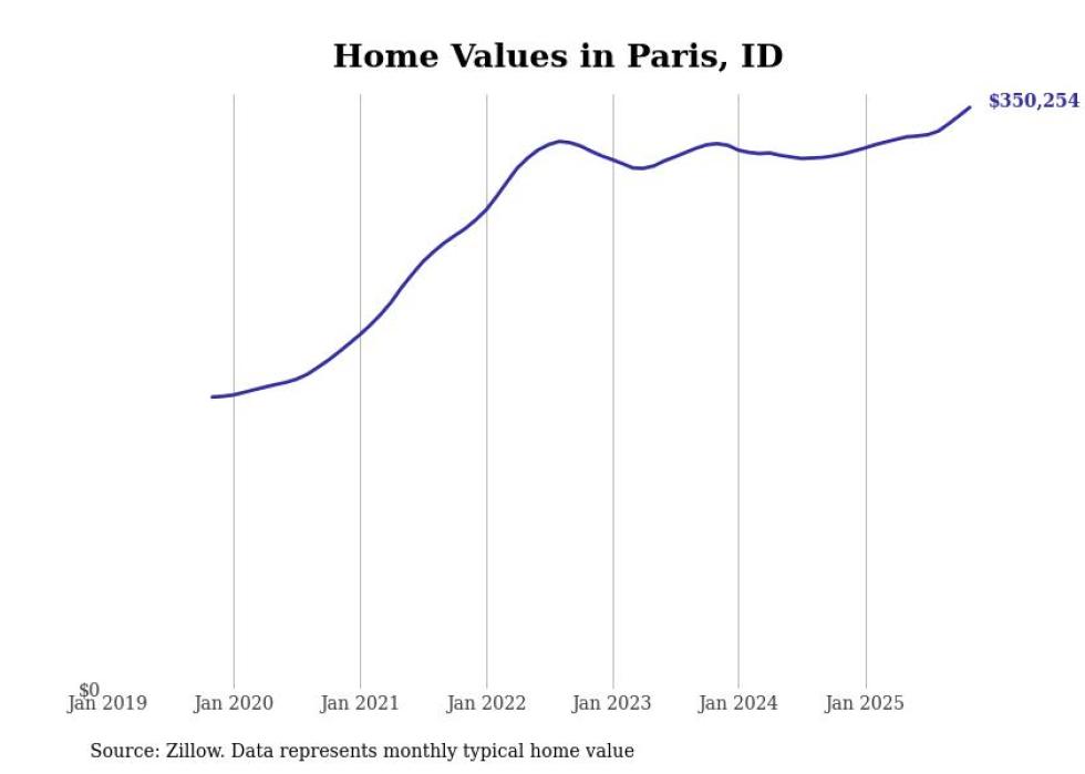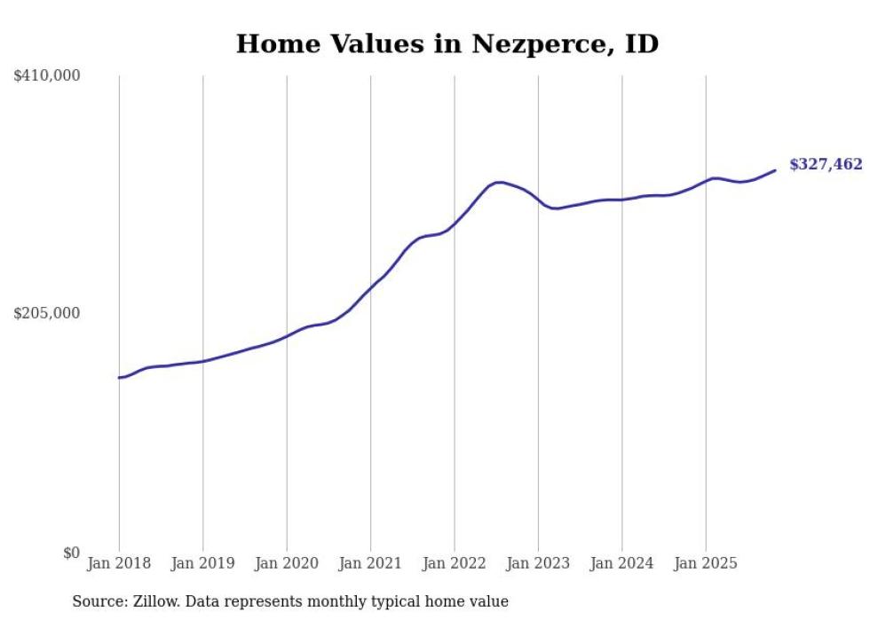 Stacker compiled a list of cities with the fastest-growing home prices in Idaho using data from Zillow. Cities are ranked by the dollar change in the Zillow Home Values Index for all homes from the 12 months ending November 2025. The charts in this story were created automatically using Matplotlib. Data was available for 50 cities and towns in Idaho.