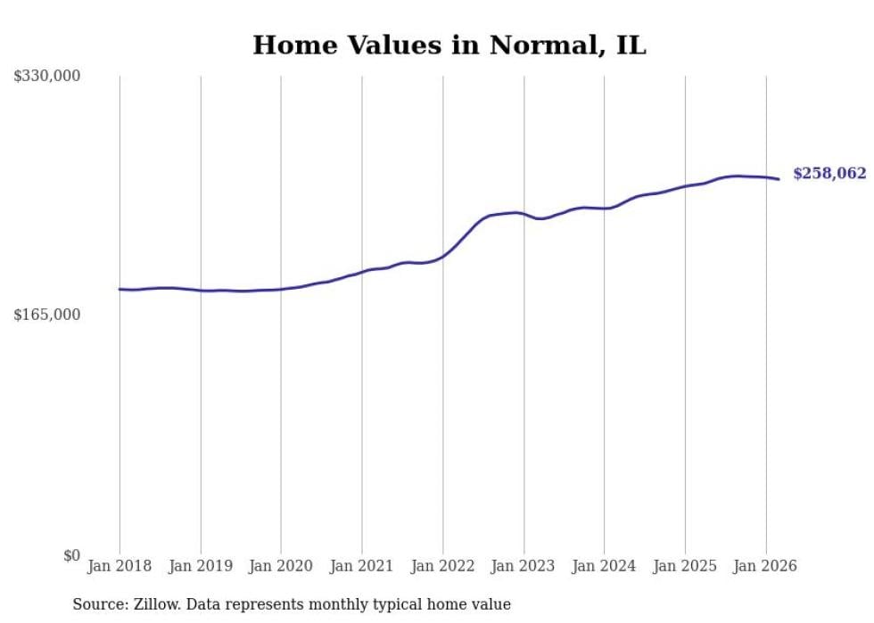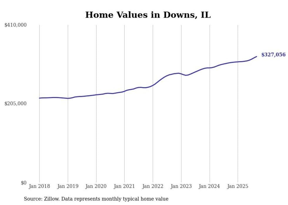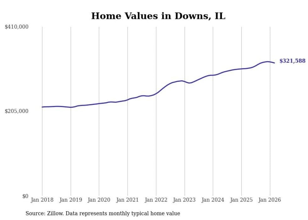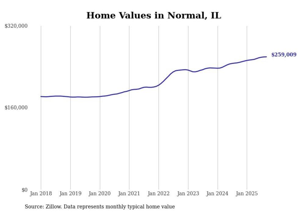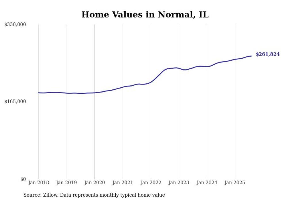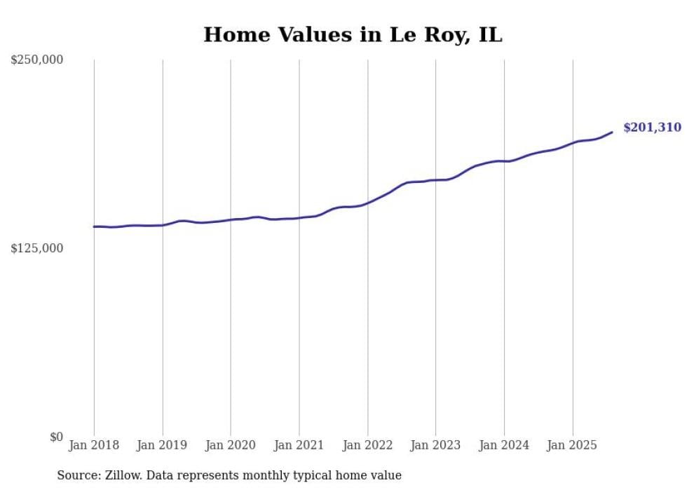 Stacker compiled a list of cities with the most expensive homes in the Bloomington, Illinois metro area using data from Zillow. Charts show the monthly typical home value since January 2018. All 20 cities and towns with data available were included in the list.
