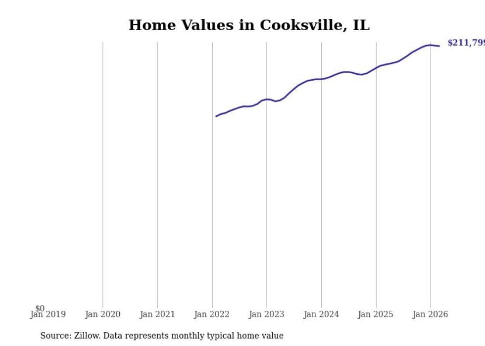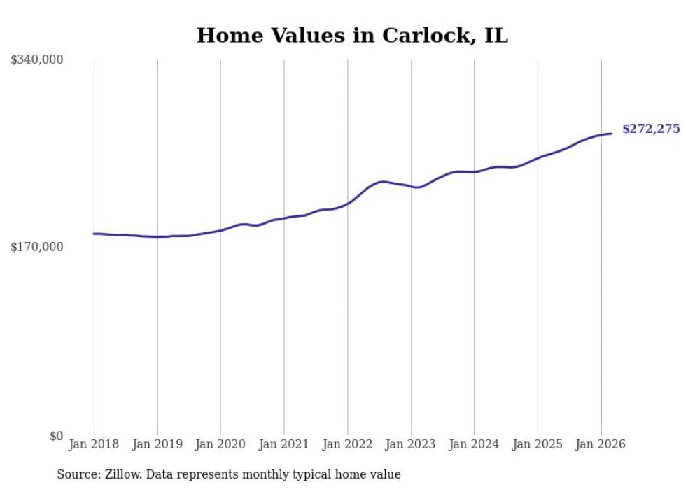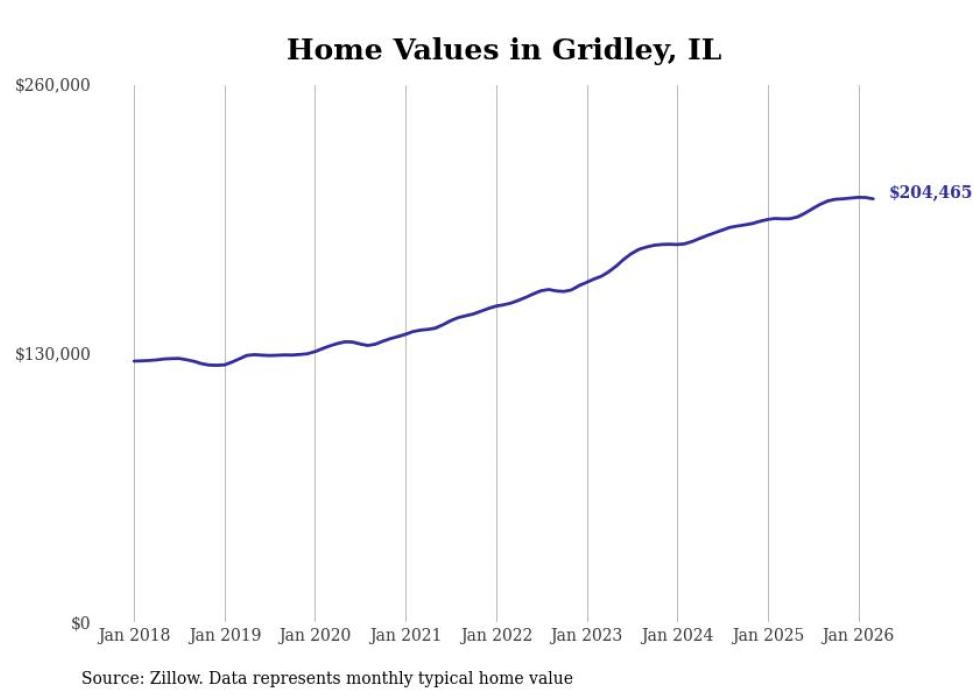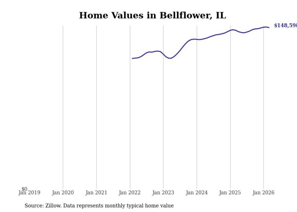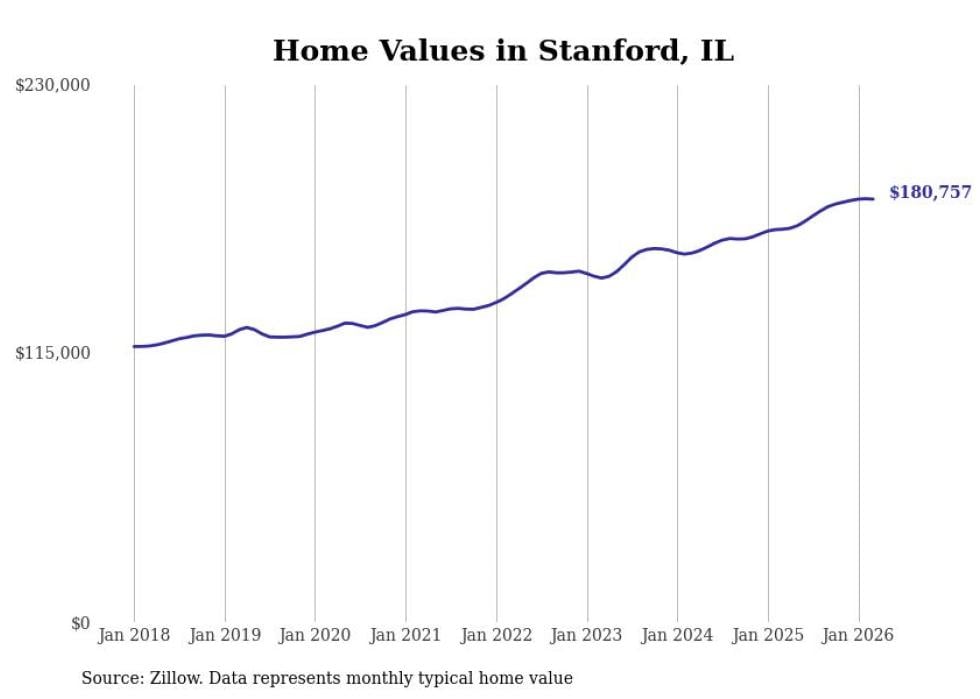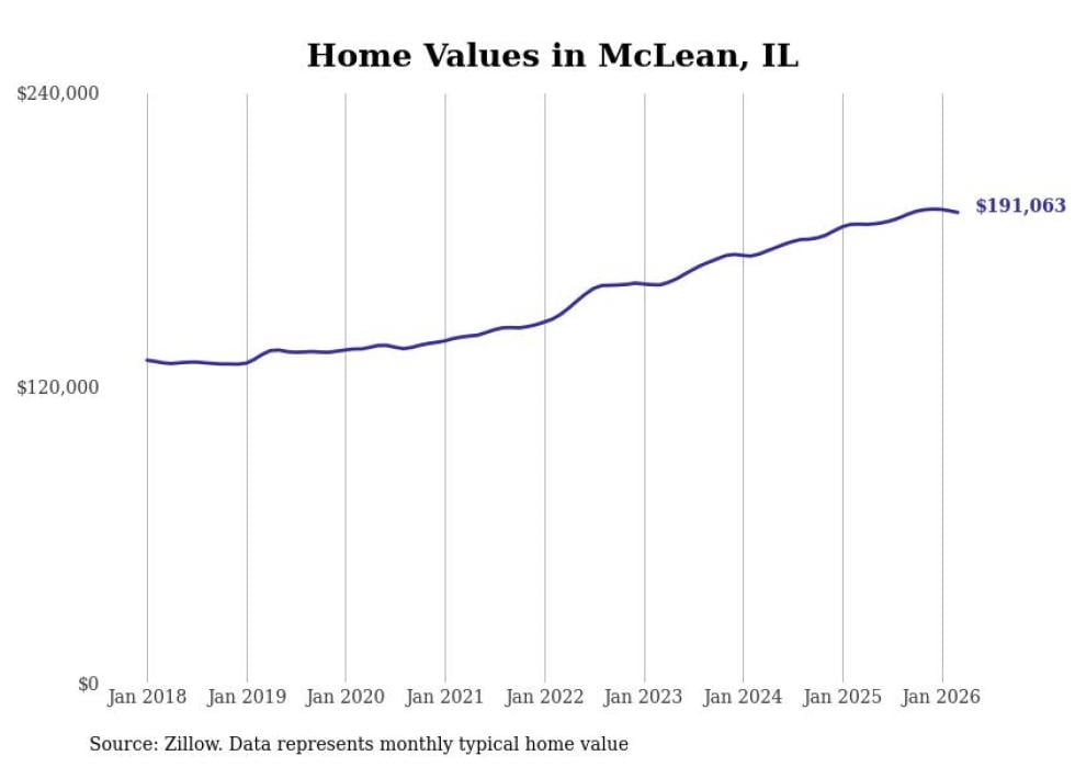 Stacker compiled a list of cities with the most expensive homes in the Bloomington, Illinois metro area using data from Zillow. Charts show the monthly typical home value since January 2018. All 20 cities and towns with data available were included in the list.